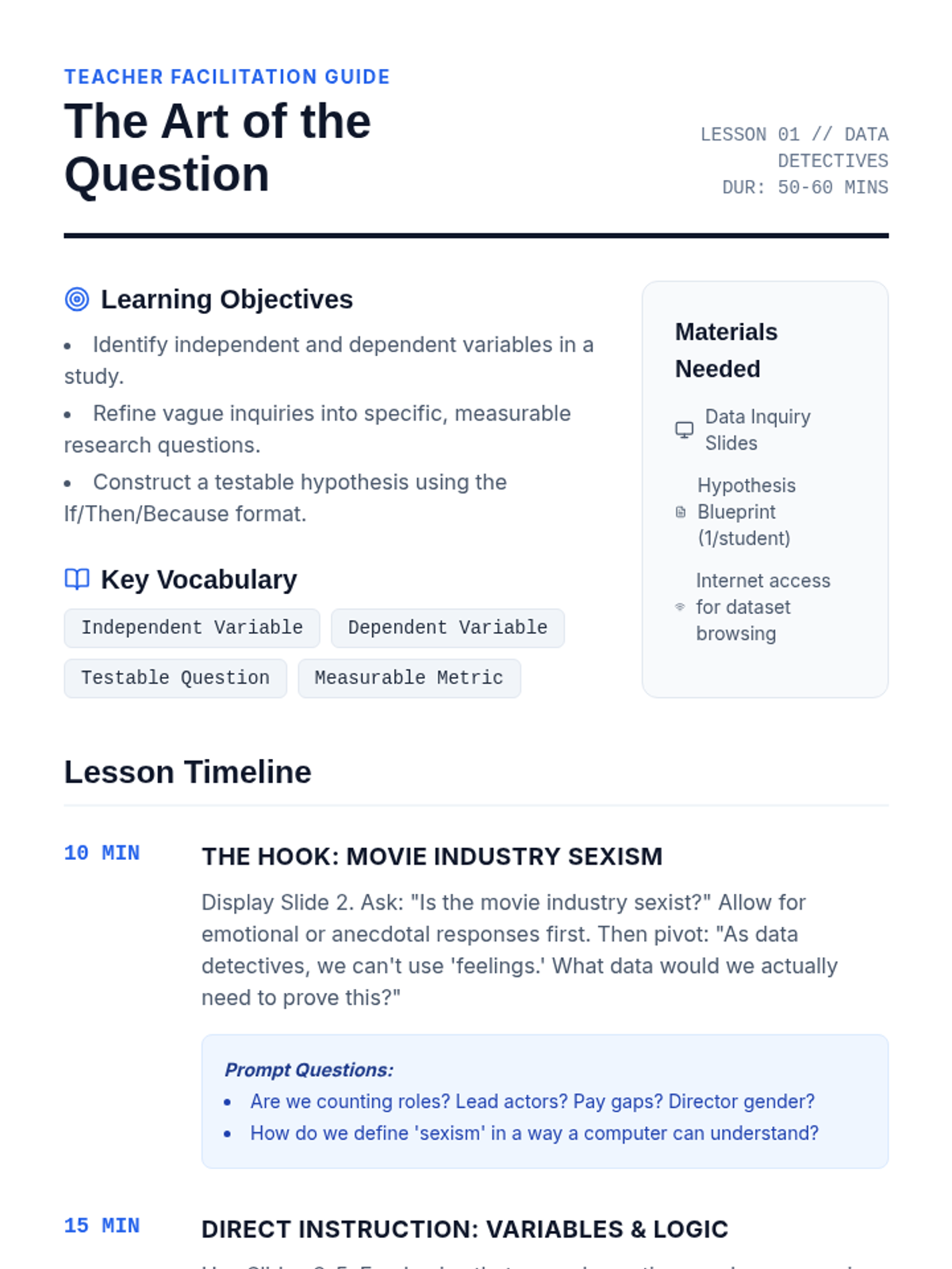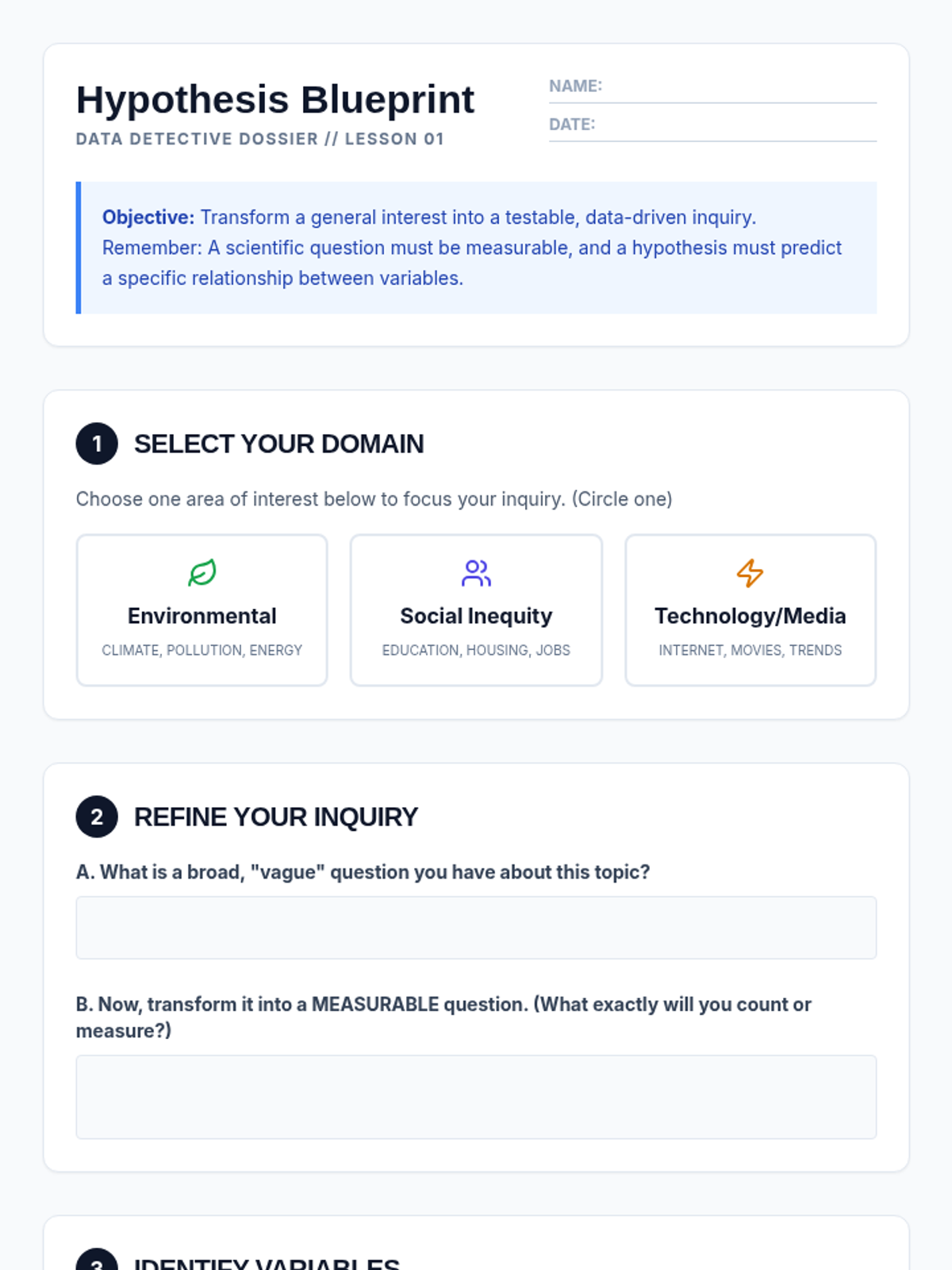 Students learn to ask specific, measurable questions that can be answered with data. They review public datasets and formulate hypotheses to guide their inquiry.