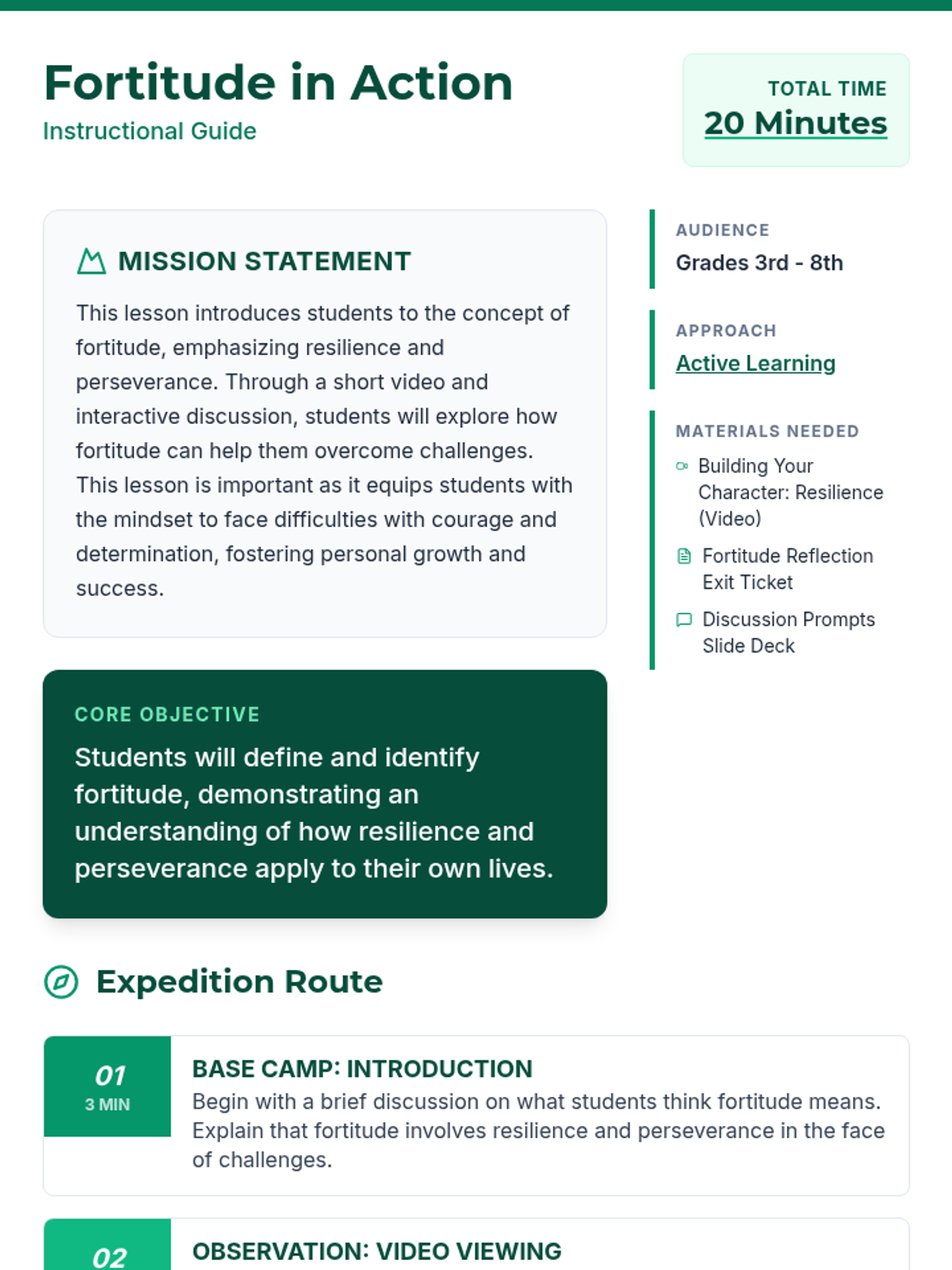 This lesson introduces students to fortitude, focusing on resilience and perseverance through video analysis and interactive reflection. Students explore how to overcome challenges with courage and develop a mindset for personal growth.