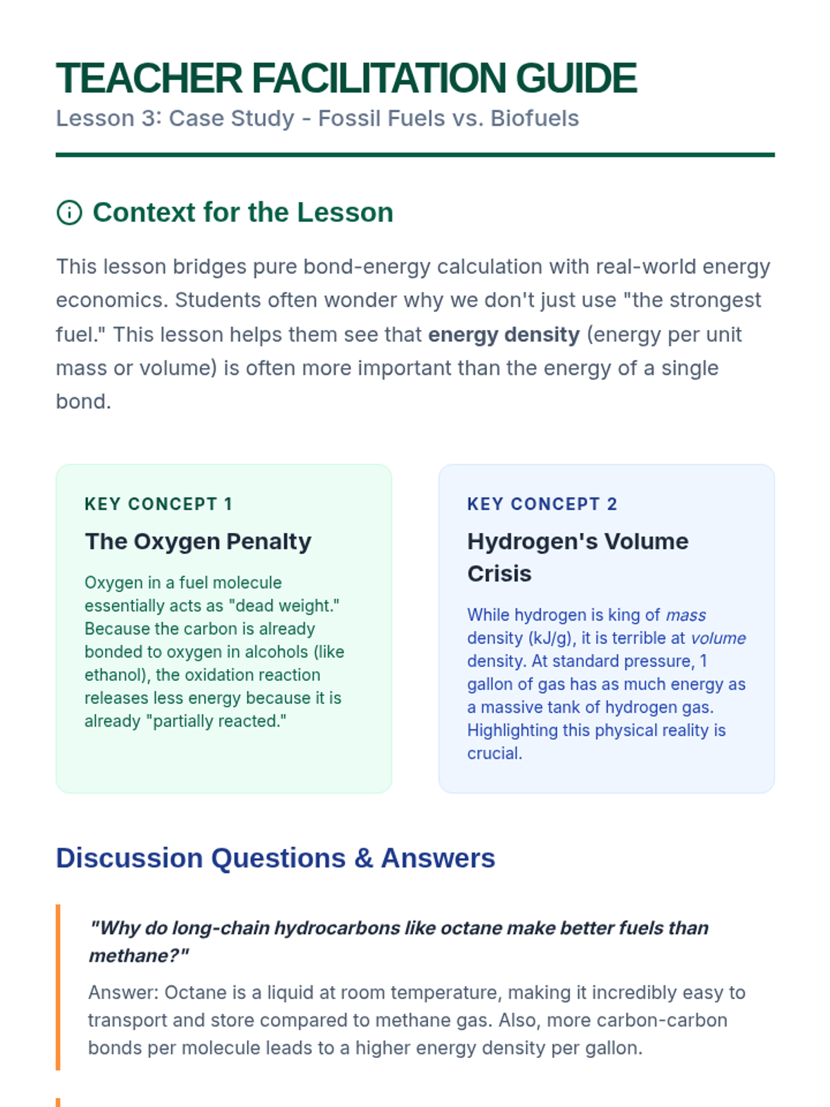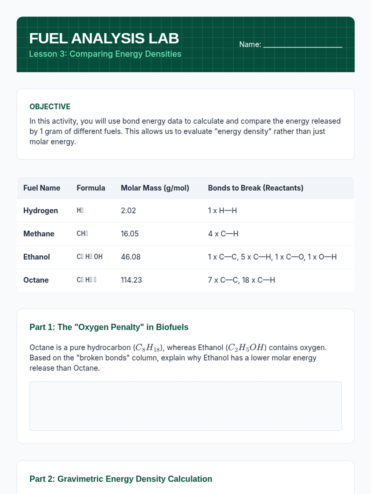 Students analyze the energy density of various hydrocarbon chains. They compare the bond energy content of octane, ethanol, and hydrogen to evaluate their efficiency as fuels.