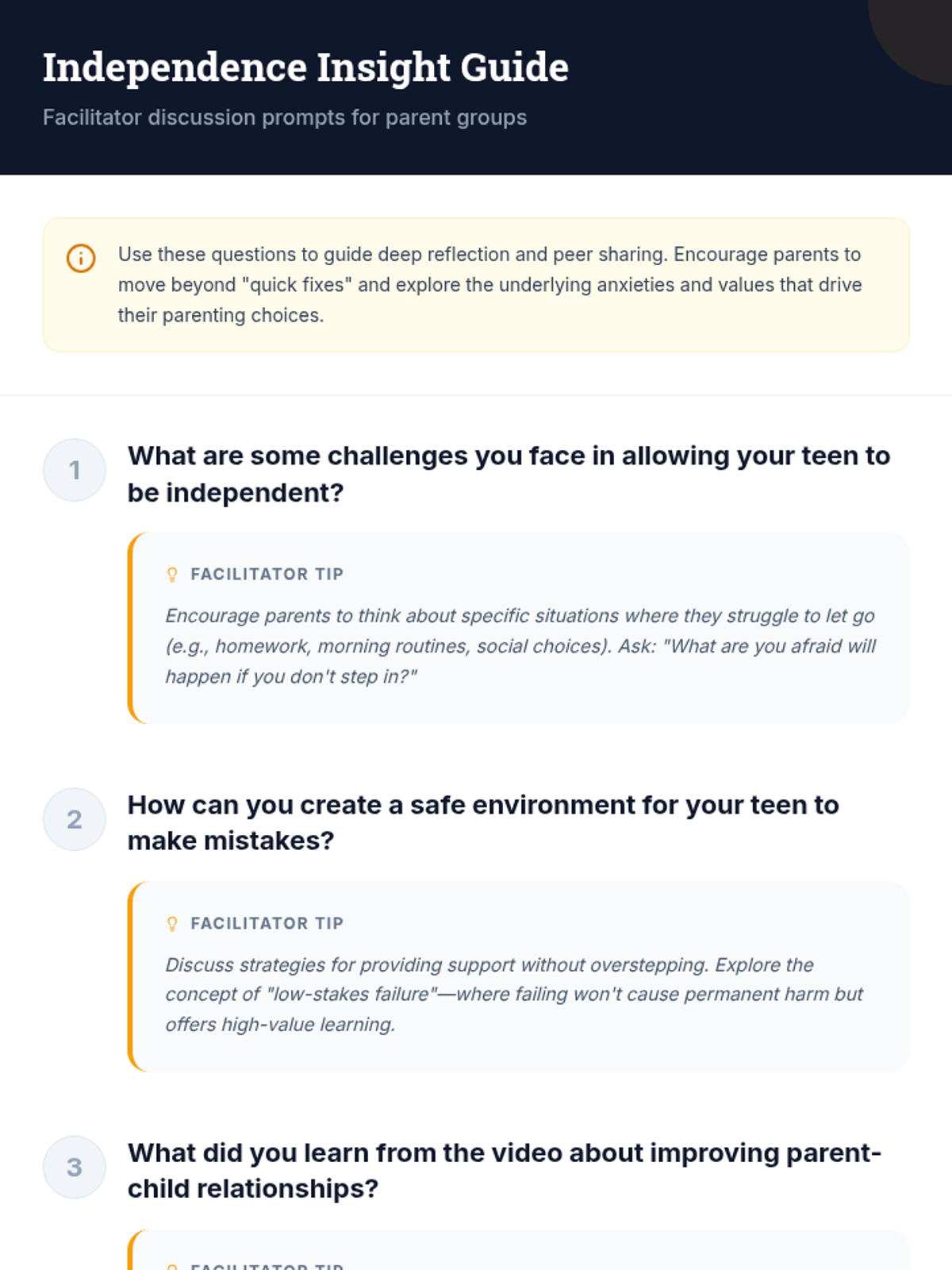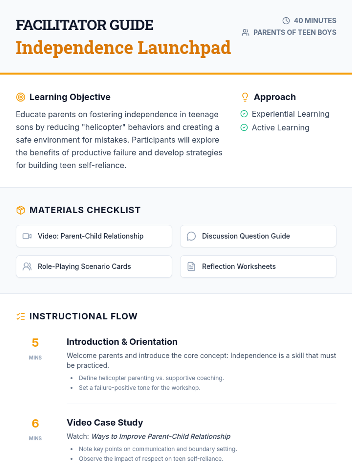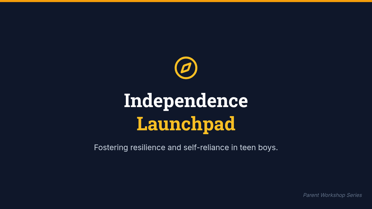 A 40-minute workshop for parents of teen boys focused on reducing helicopter parenting and fostering self-reliance through experiential learning and failure-positive environments.