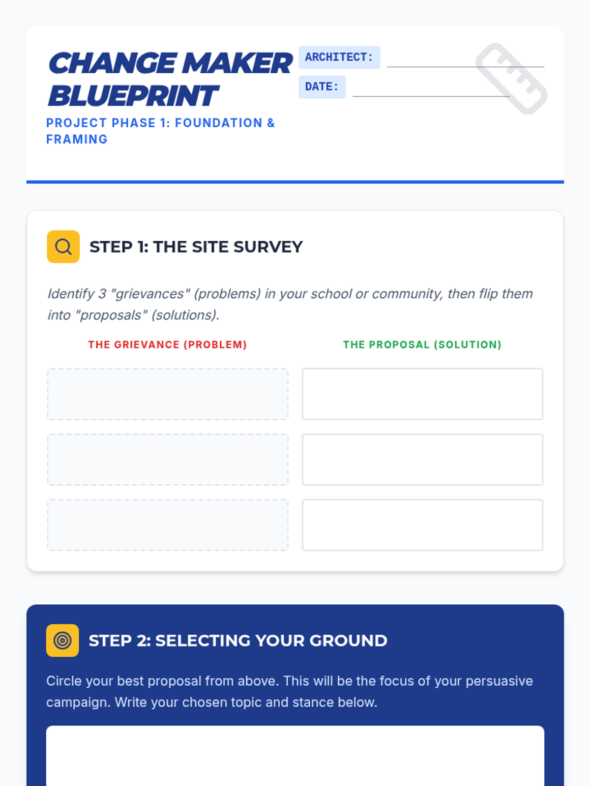 Students transition from identifying community problems to formulating a clear thesis statement that serves as the foundation for their persuasive argument.