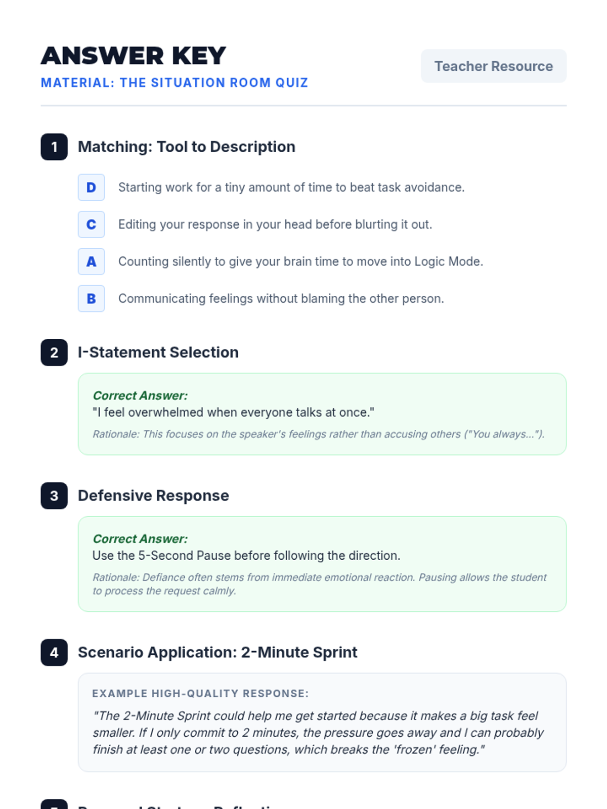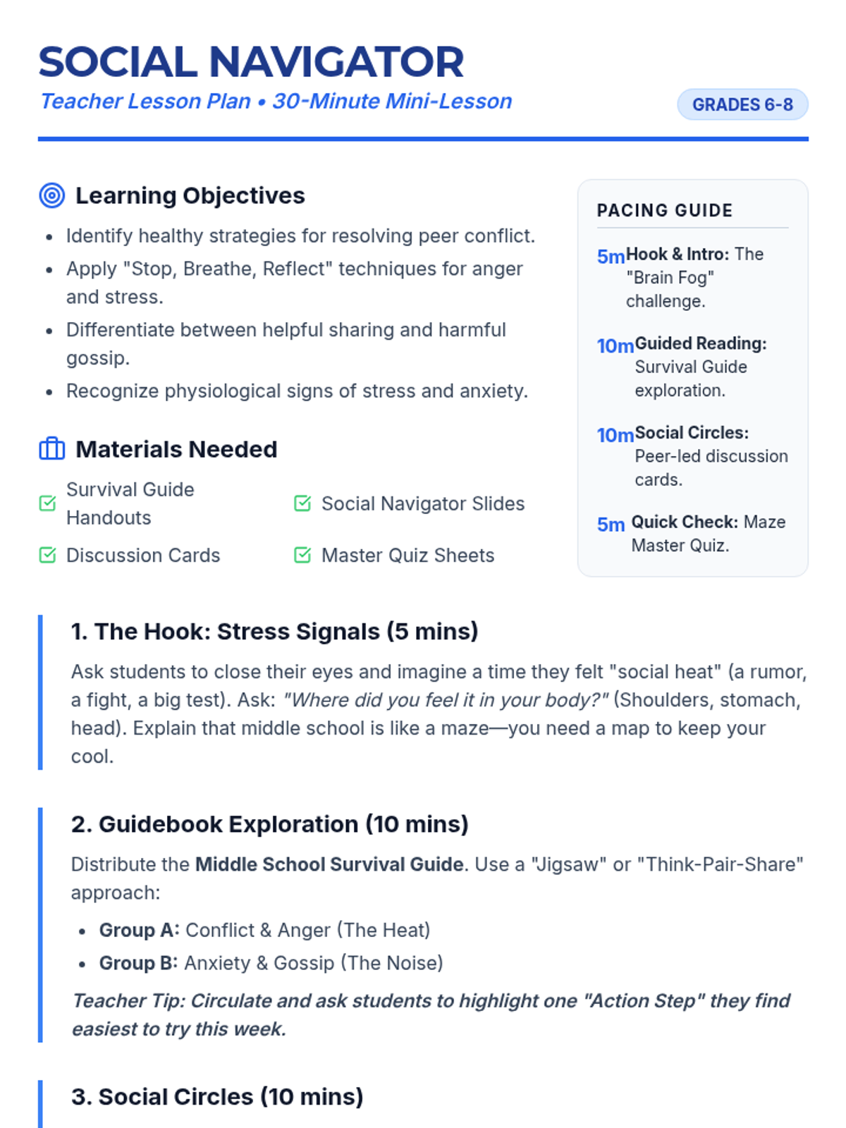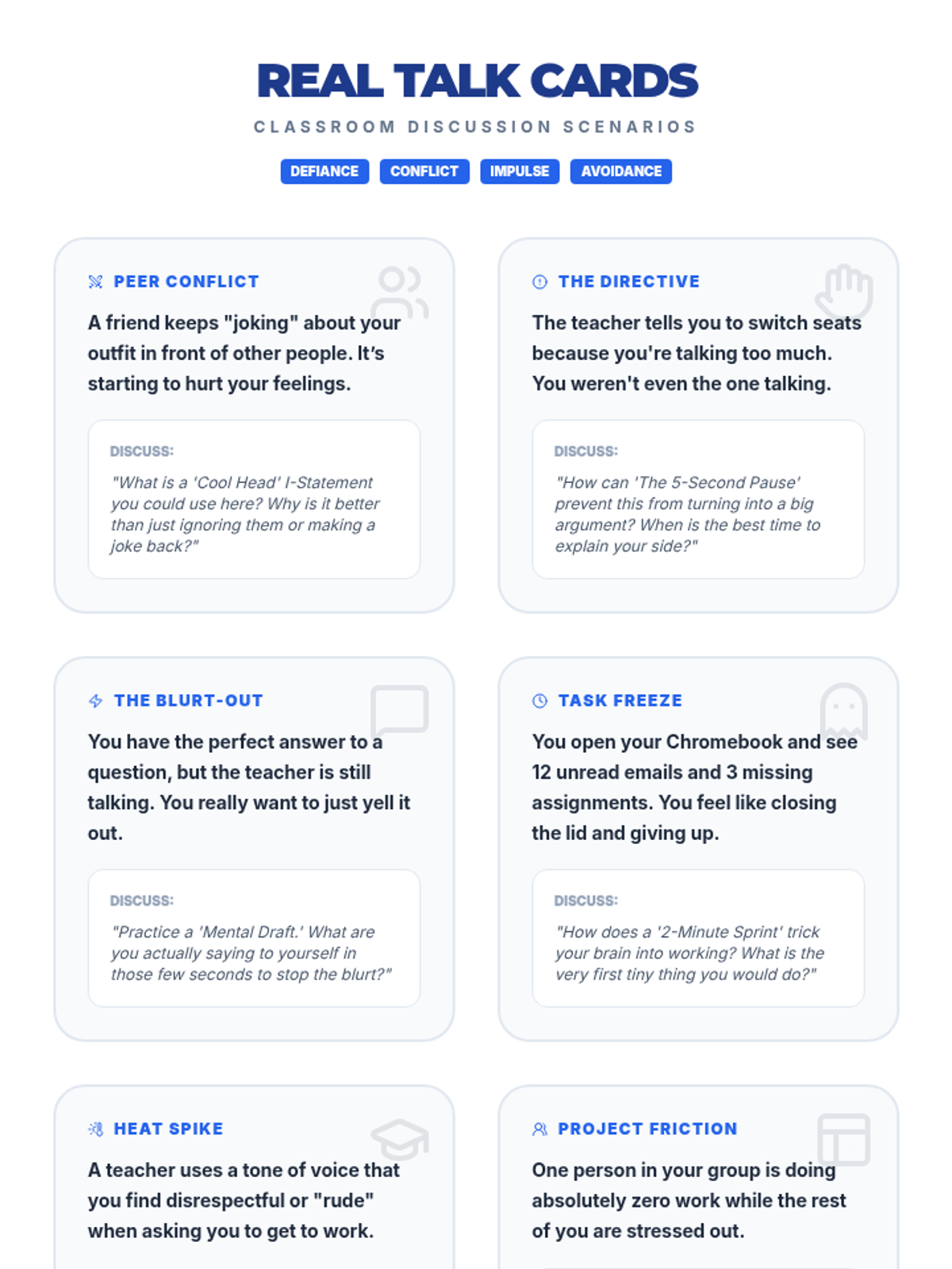 A 30-minute Social Emotional Learning lesson designed for middle schoolers to develop strategies for managing defiance, peer conflict, impulsivity, and disengagement. Students explore 'Cool Head' tools to navigate challenging classroom situations effectively.