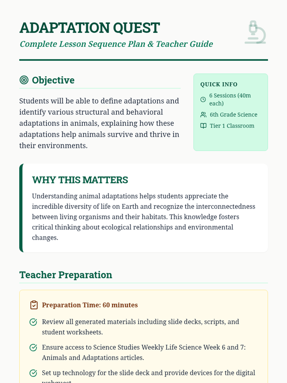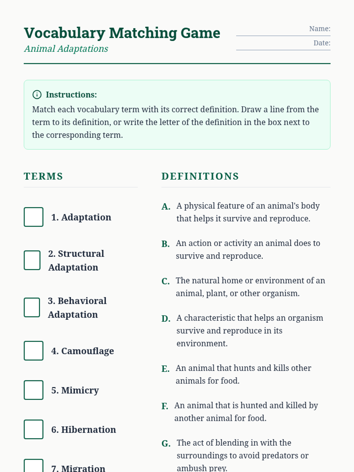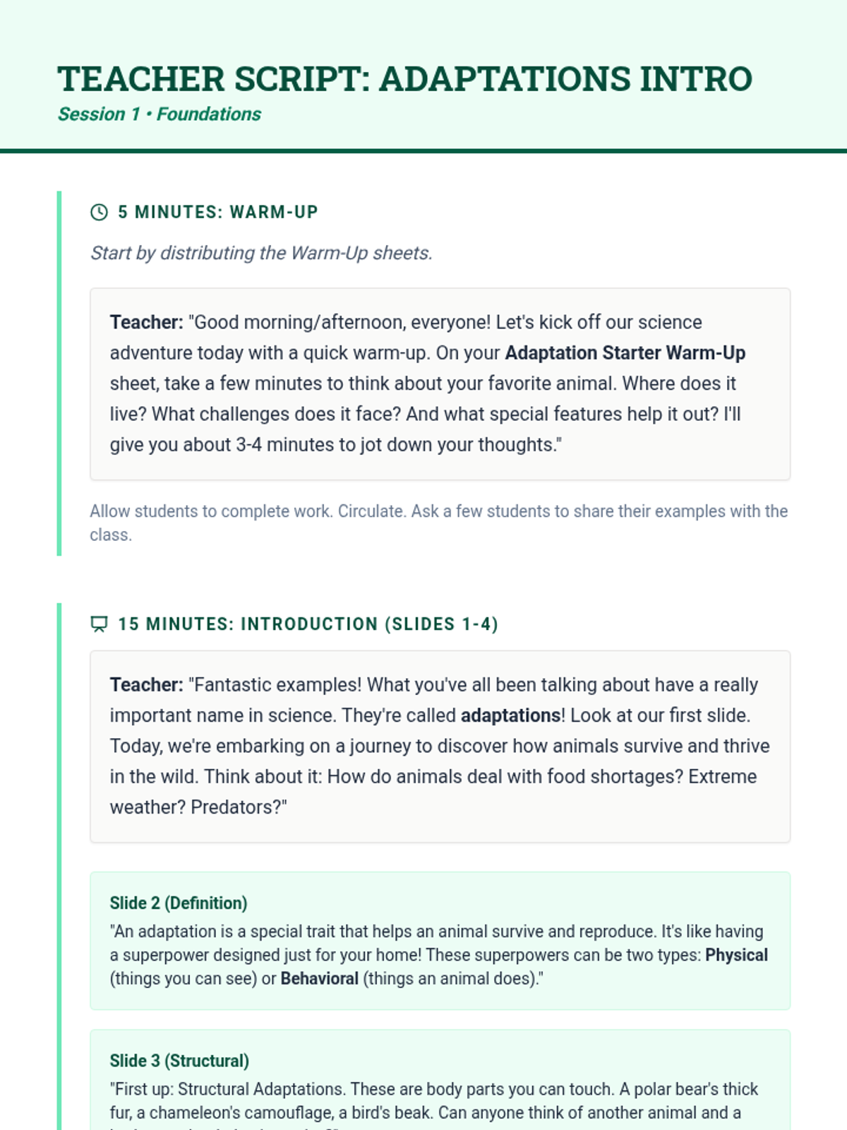 Students define adaptations and distinguish between structural and behavioral traits using real-world examples and interactive vocabulary games.