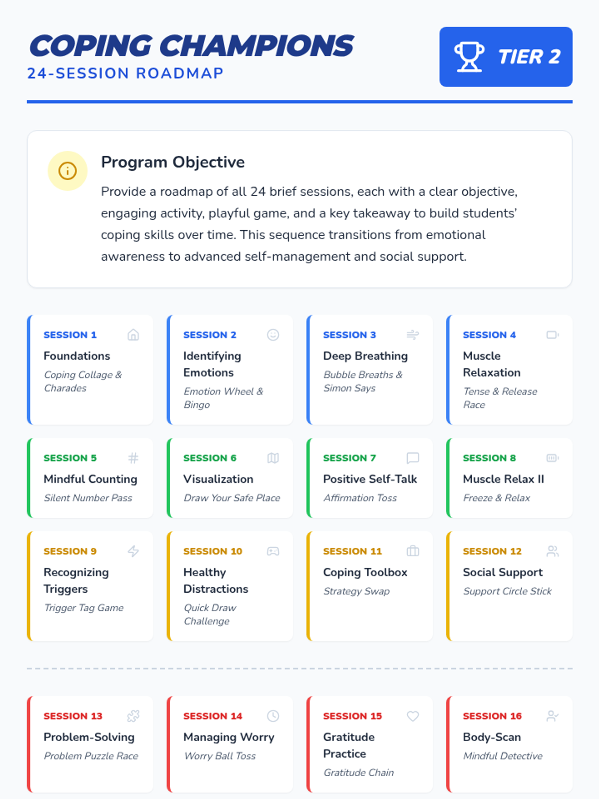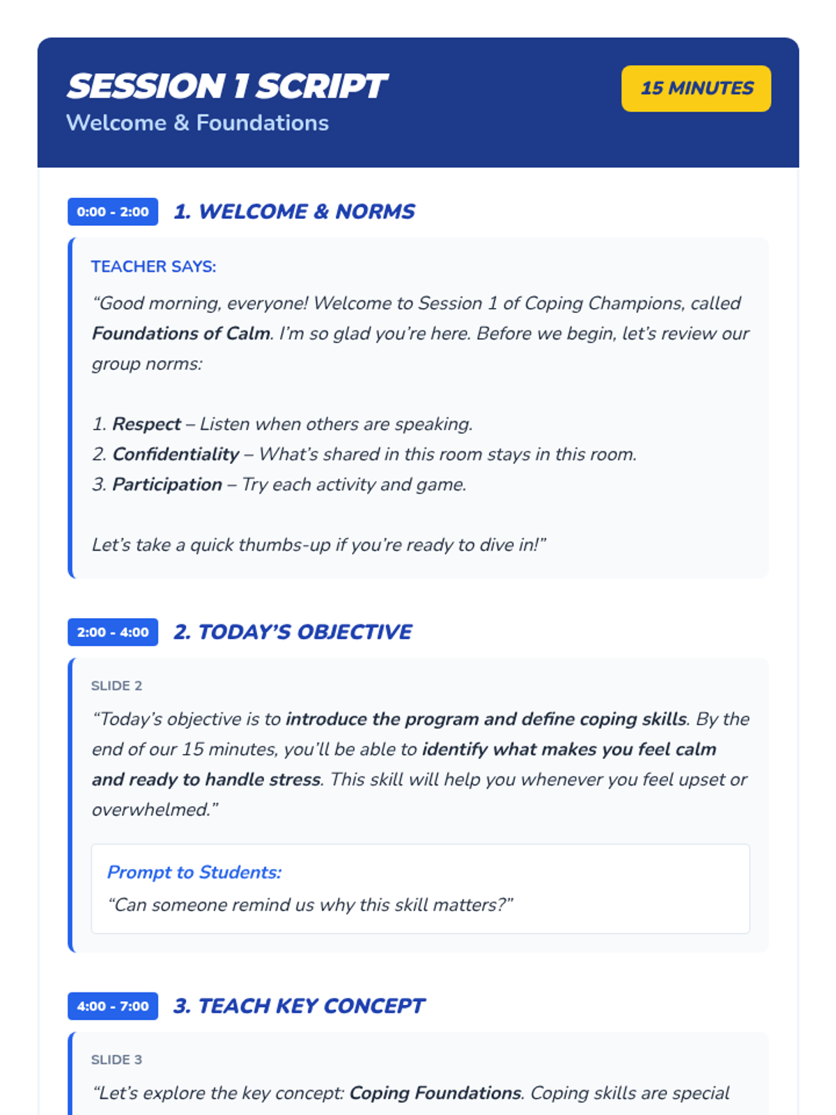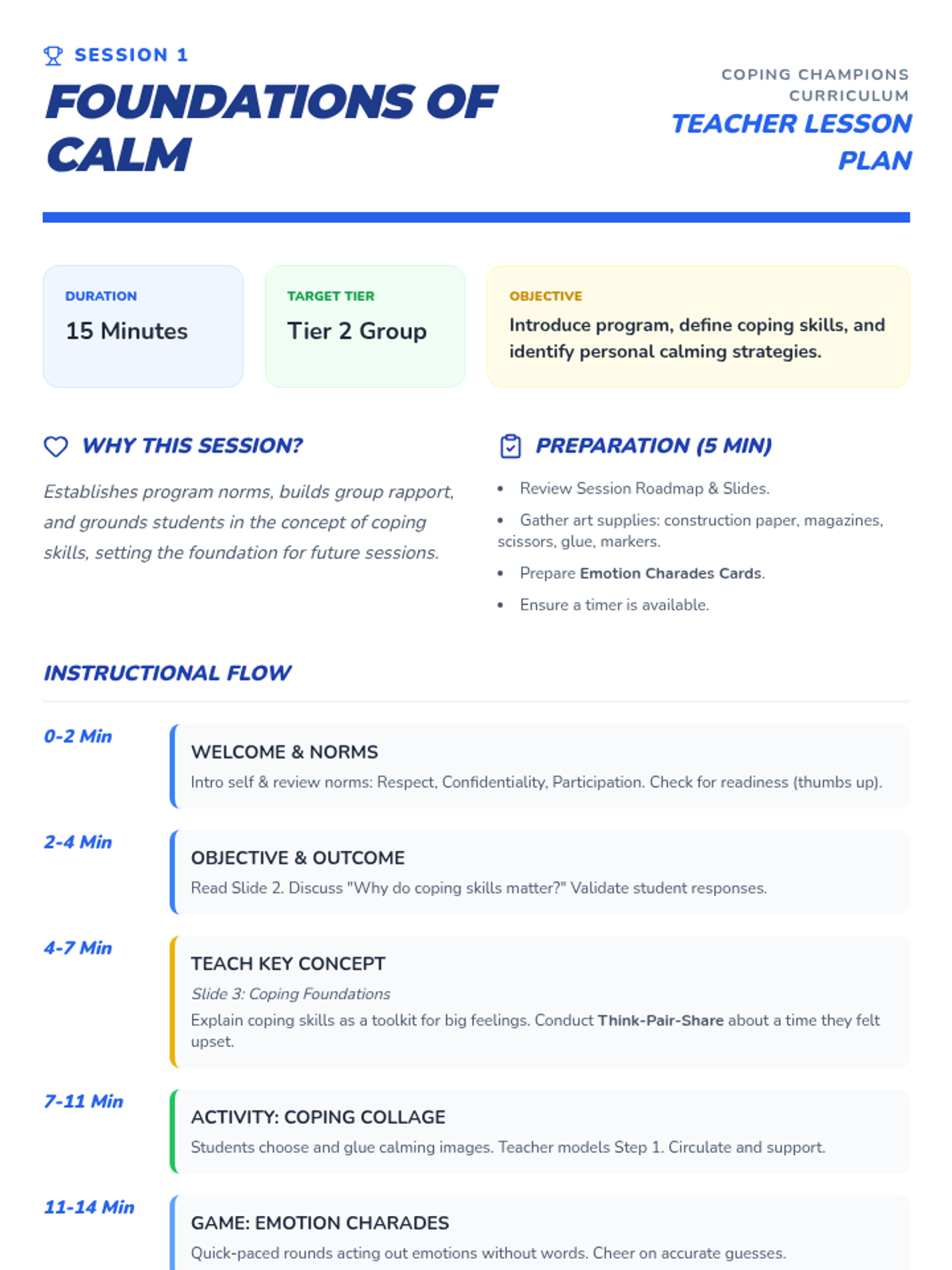 The introductory session where students learn the definition of coping skills, establish group norms, and identify personal strategies for staying calm.