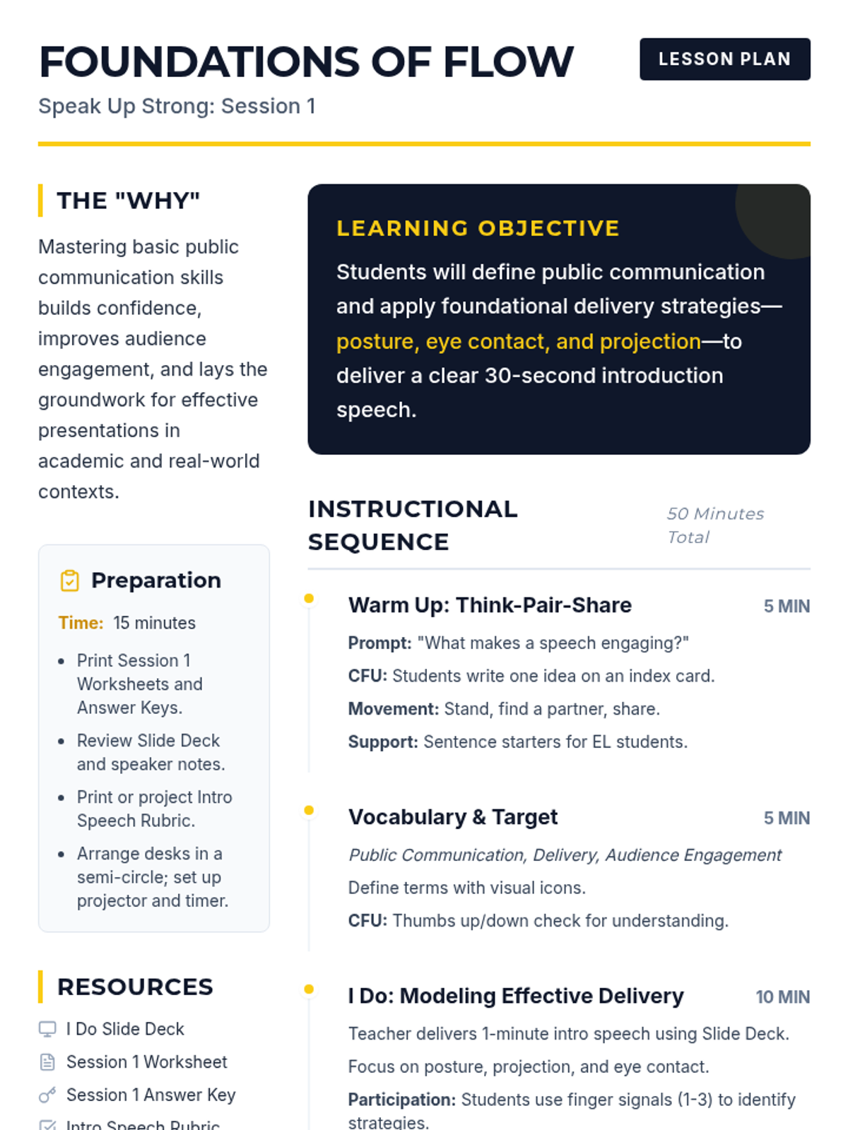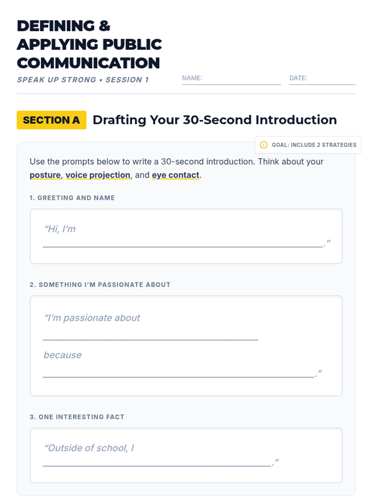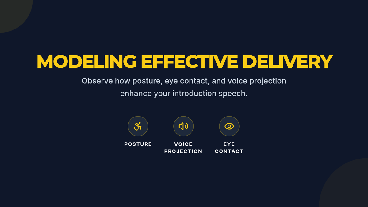 Students define public communication and master foundational delivery strategies including posture, eye contact, and projection through a 30-second introduction speech.
