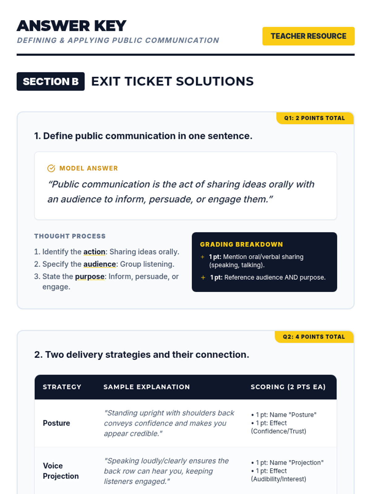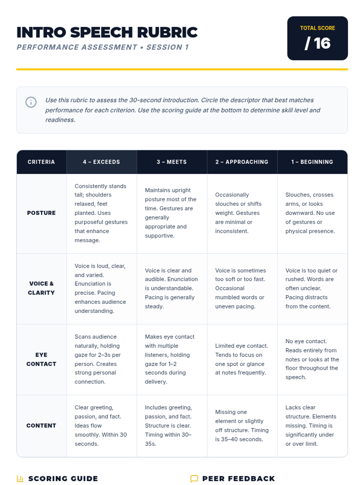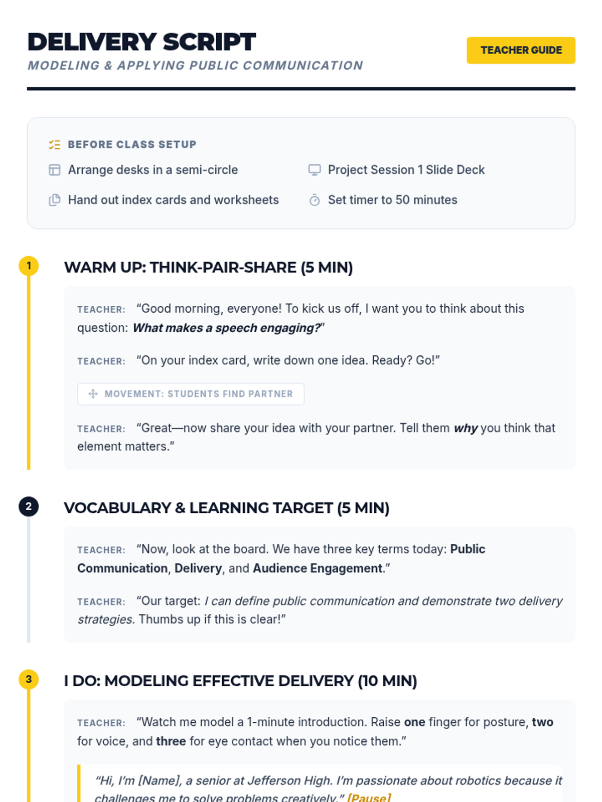 Students define public communication and master foundational delivery strategies including posture, eye contact, and projection through a 30-second introduction speech.
