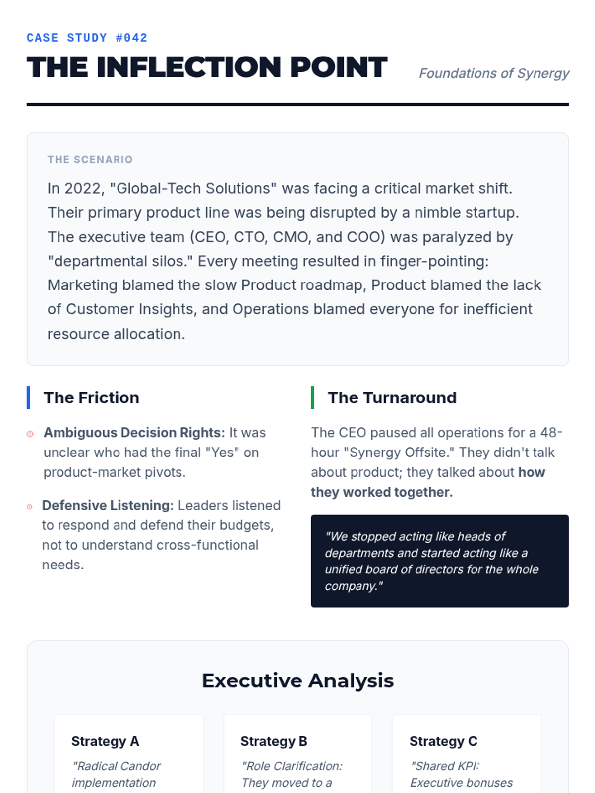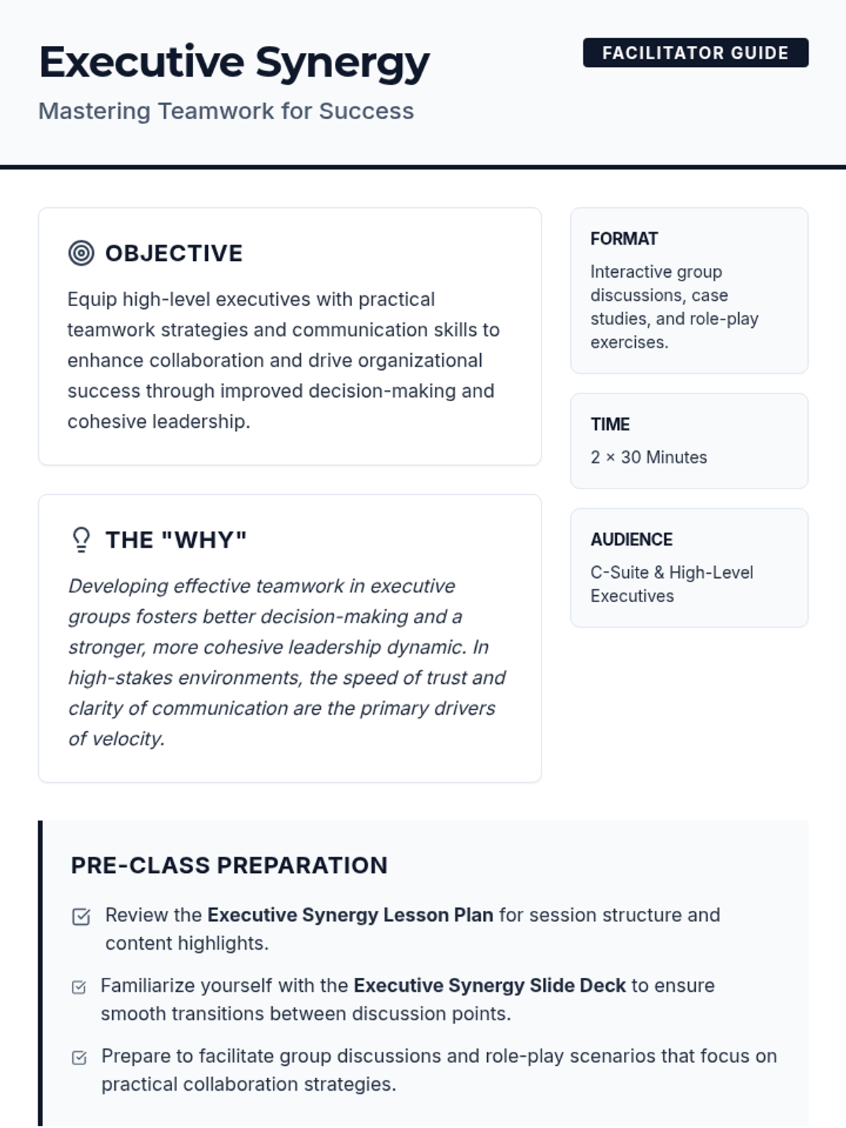 Focuses on the core principles of executive collaboration, communication strategies, and analyzing successful teamwork through case studies.