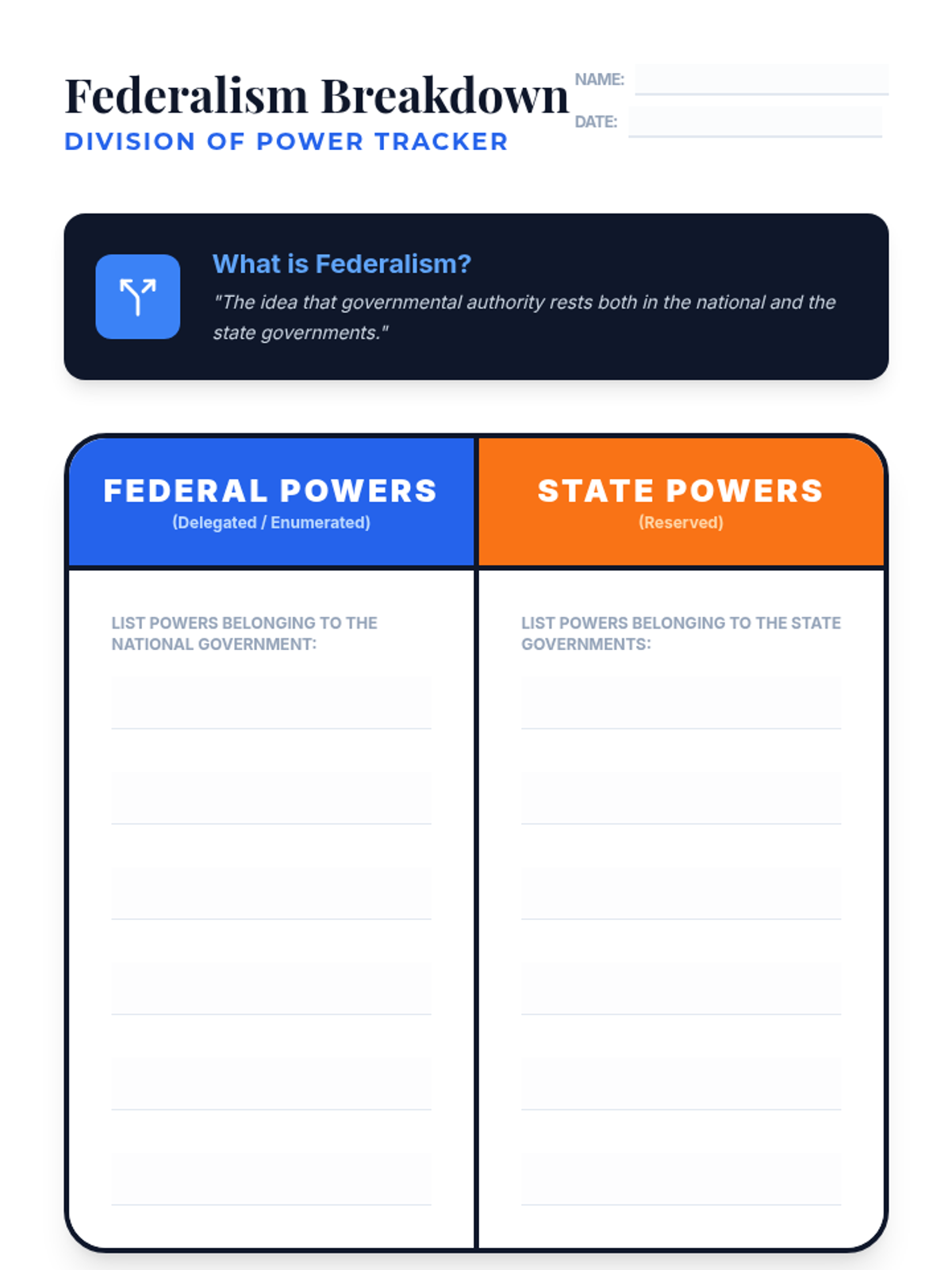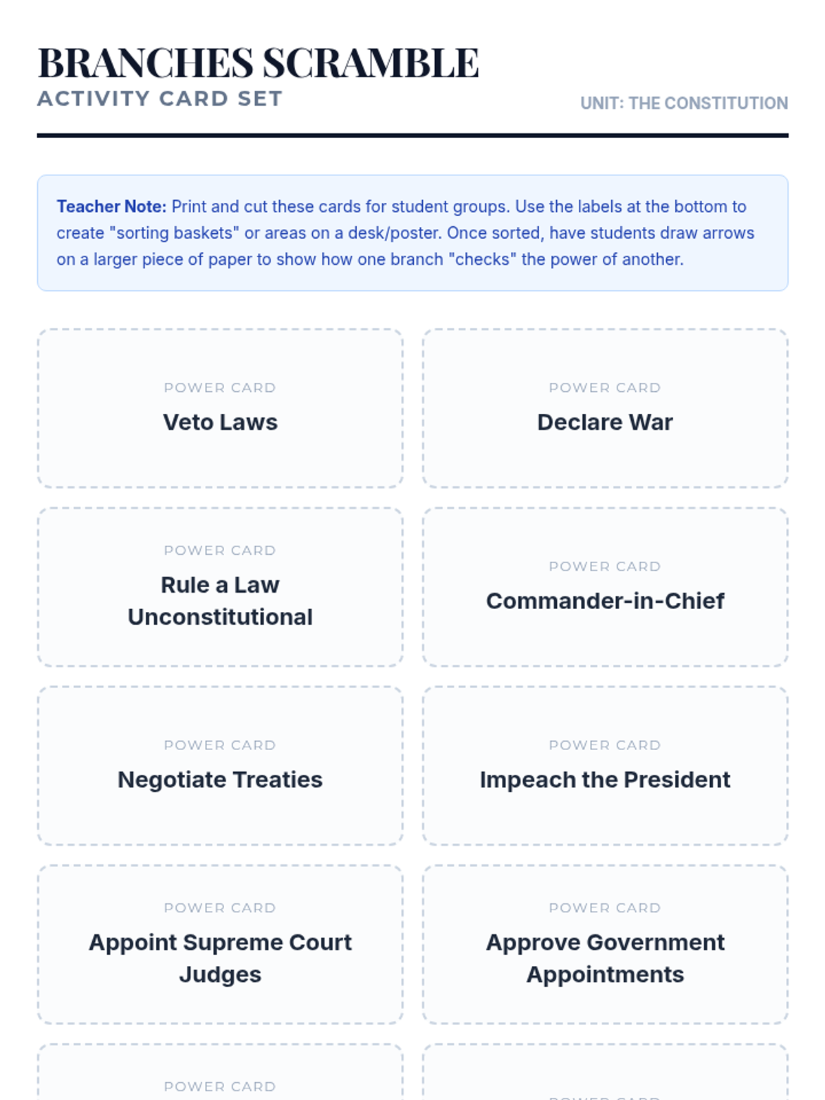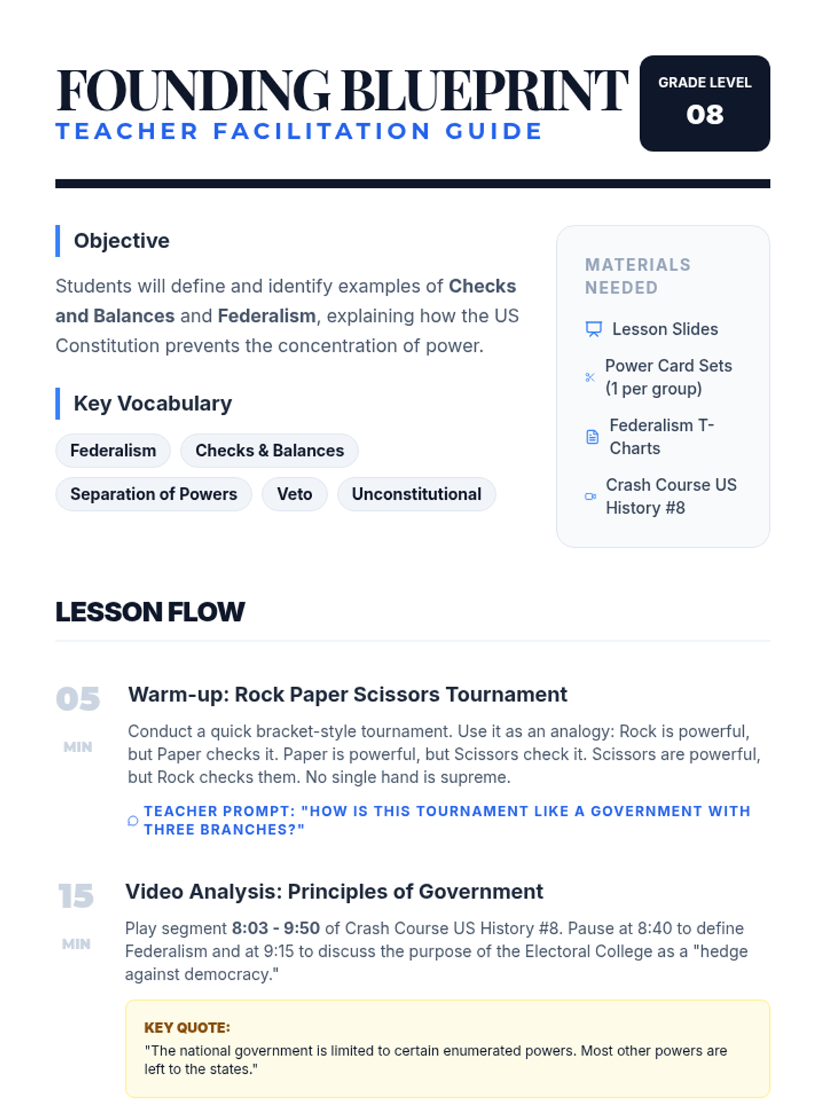An 8th-grade social studies lesson exploring the structural principles of the US Constitution through interactive analogies, video analysis, and a collaborative sorting activity. Students define and identify real-world examples of Checks and Balances and Federalism.