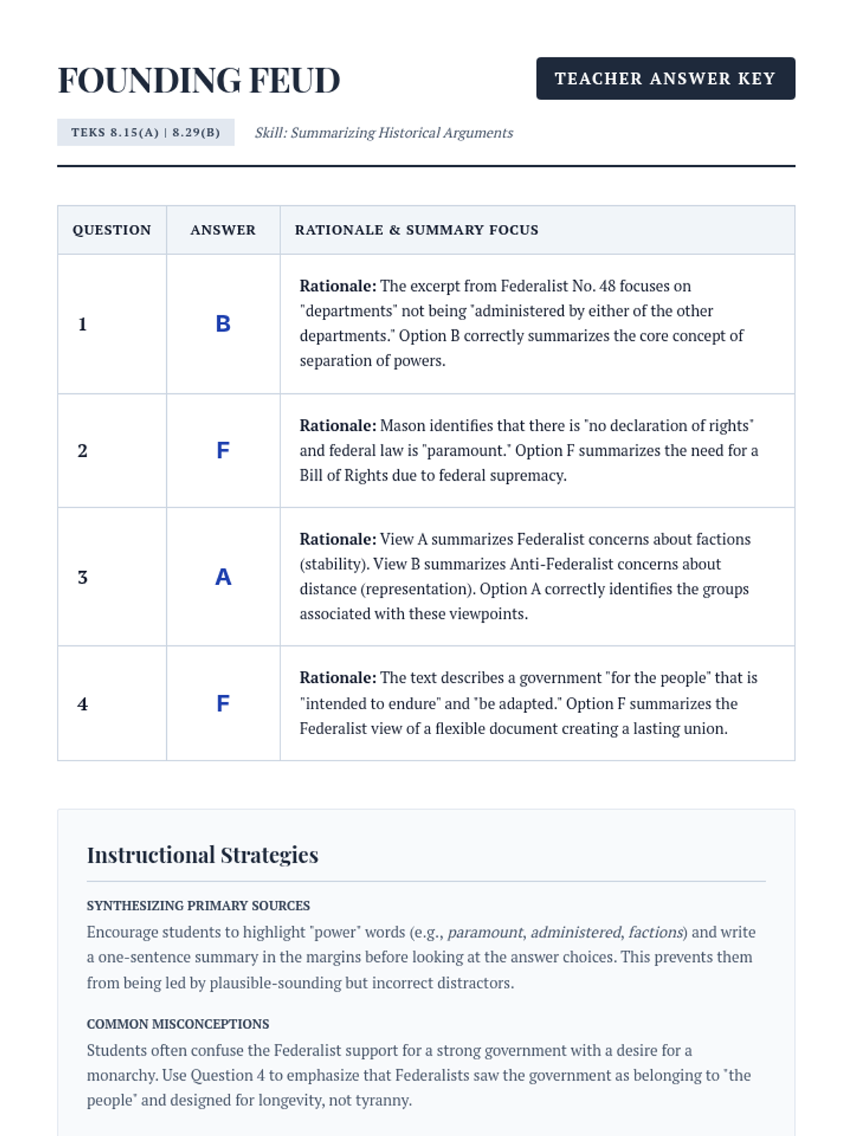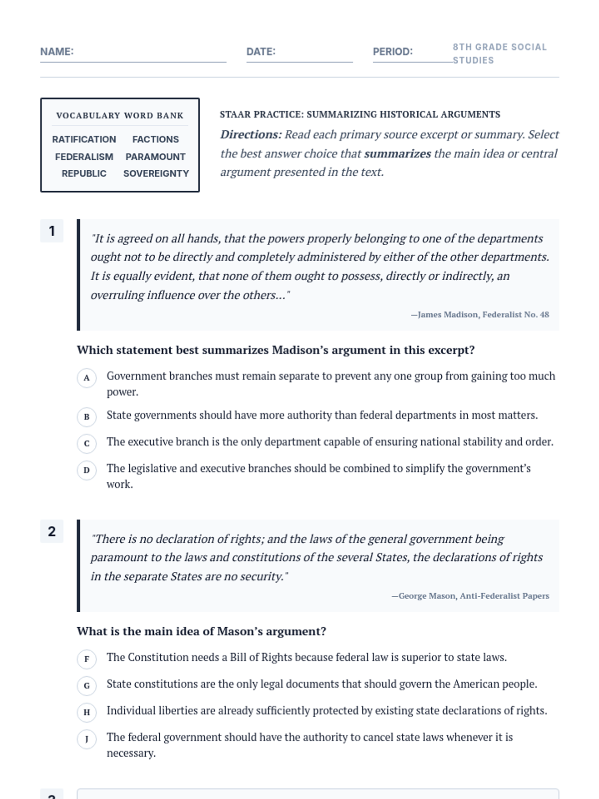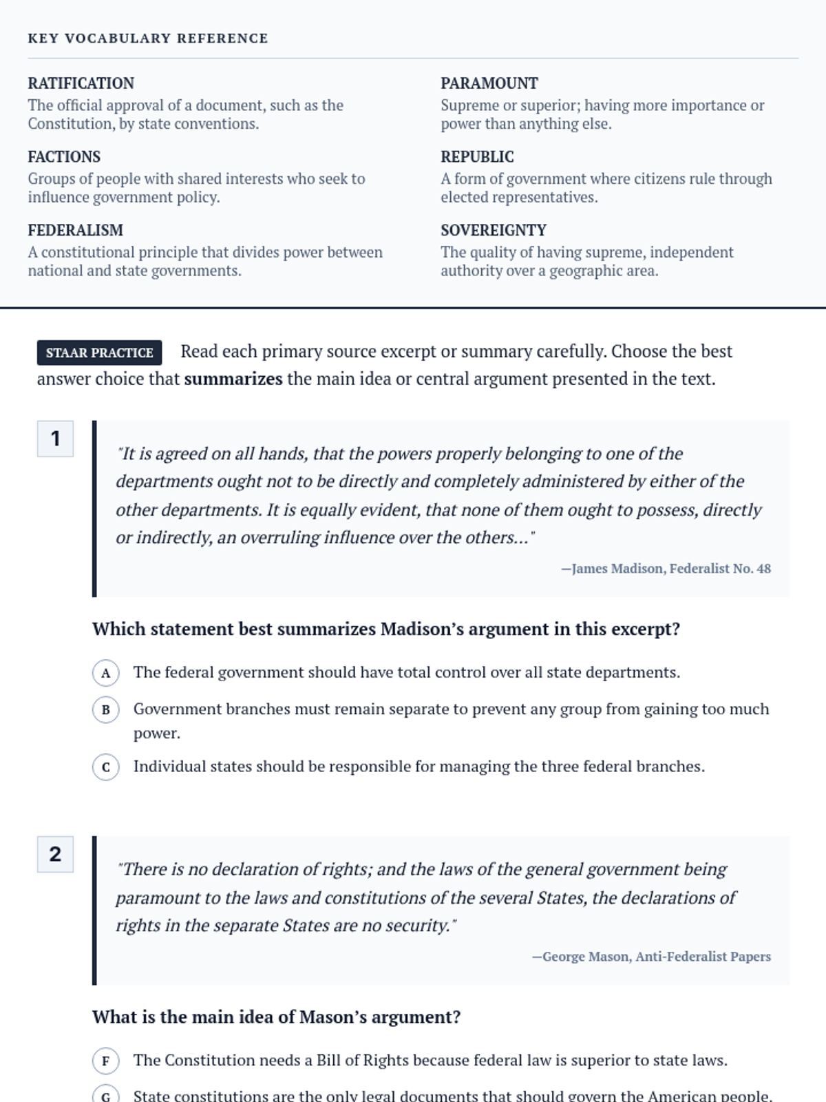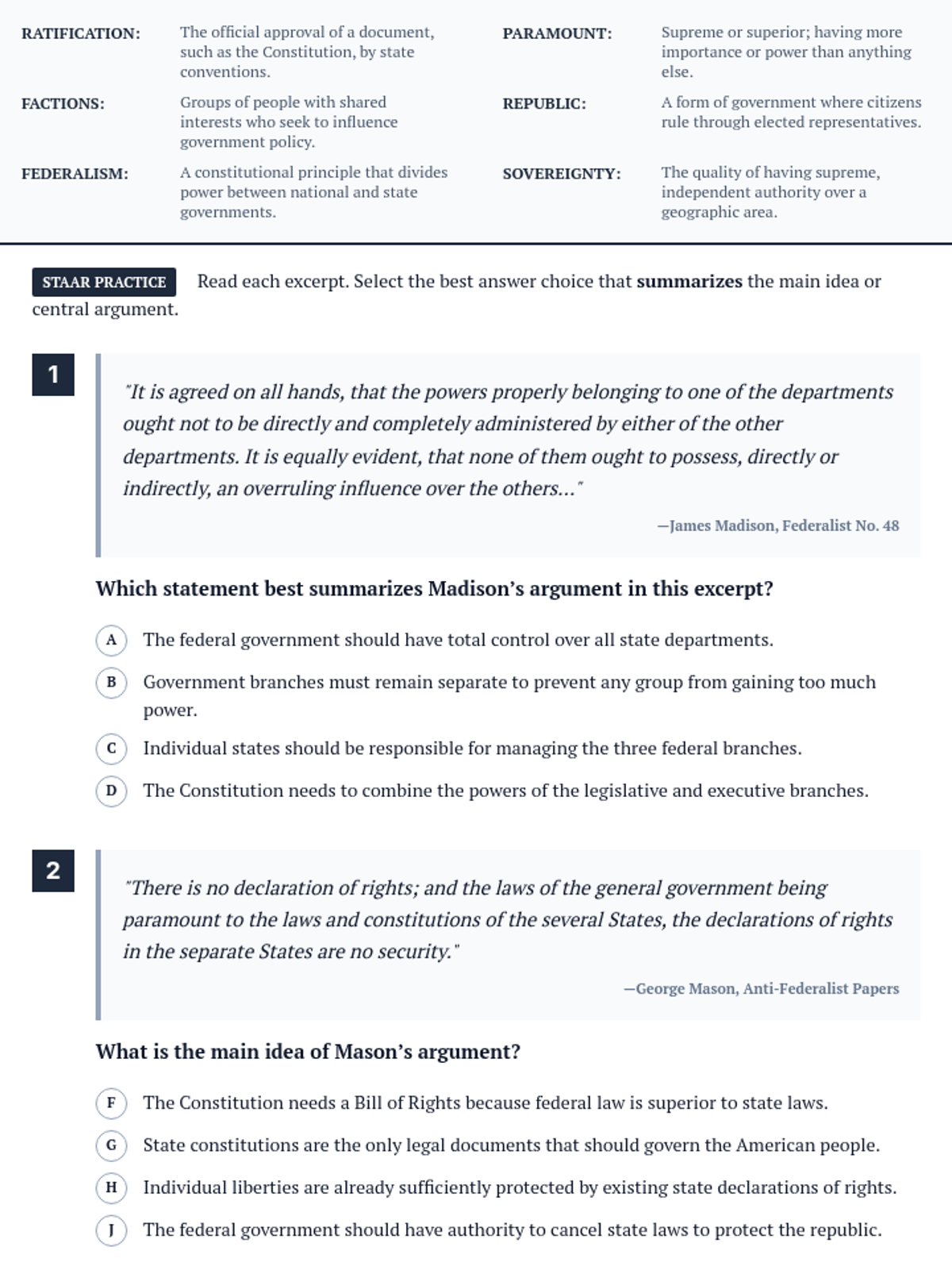 A focused practice session on the key differences between Federalists and Anti-Federalists, specifically targeting the STAAR skill of summarizing historical texts and arguments.