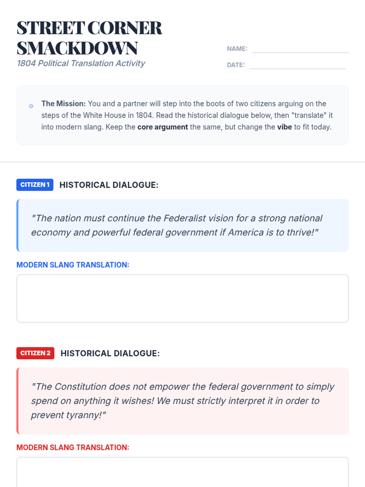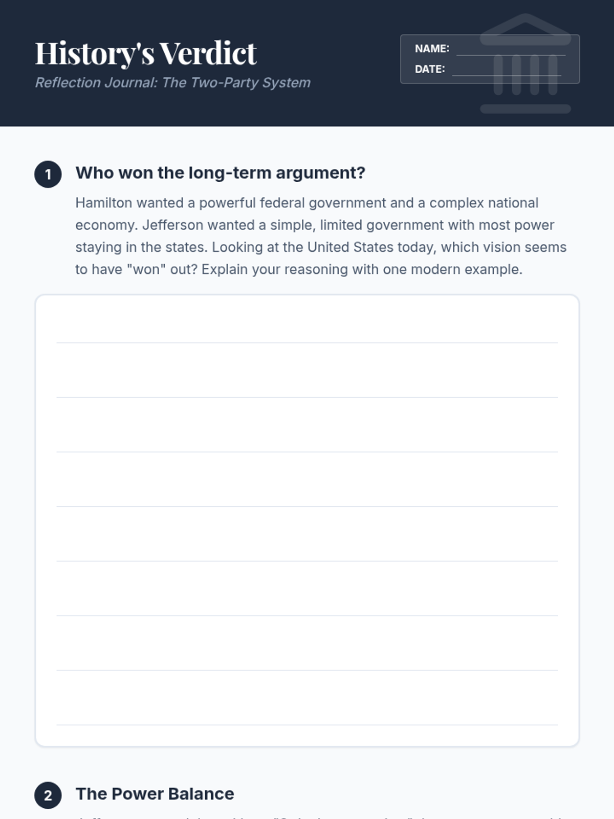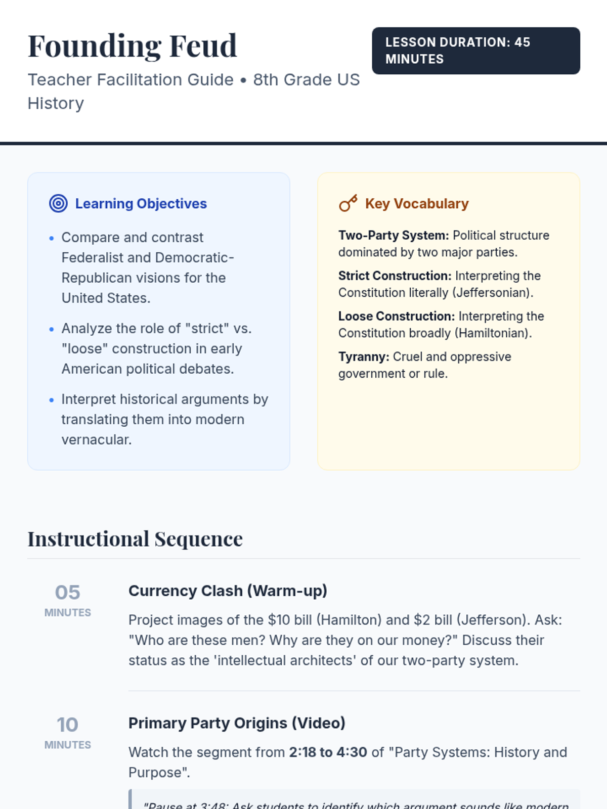 A lesson comparing the visions of Alexander Hamilton and Thomas Jefferson, focusing on the birth of the American two-party system through video analysis and modern-slang role-play.