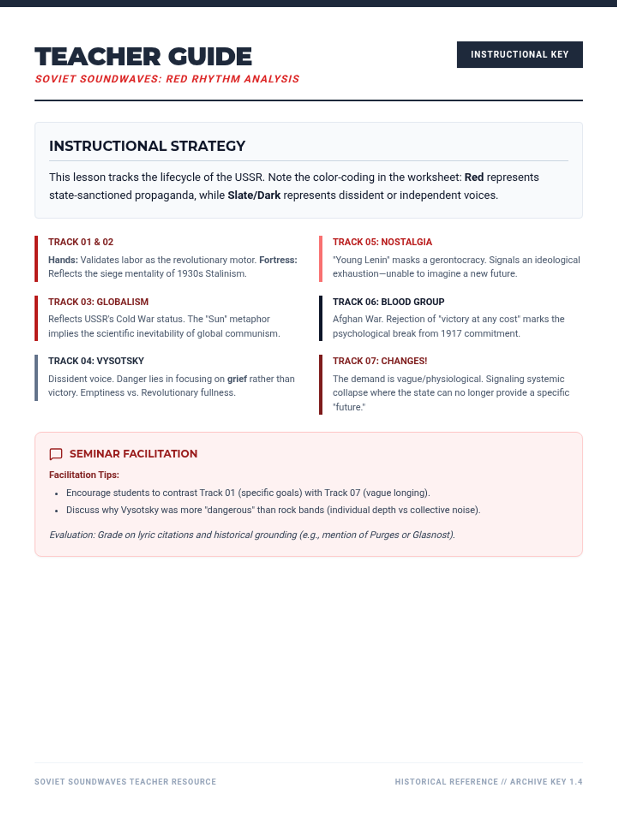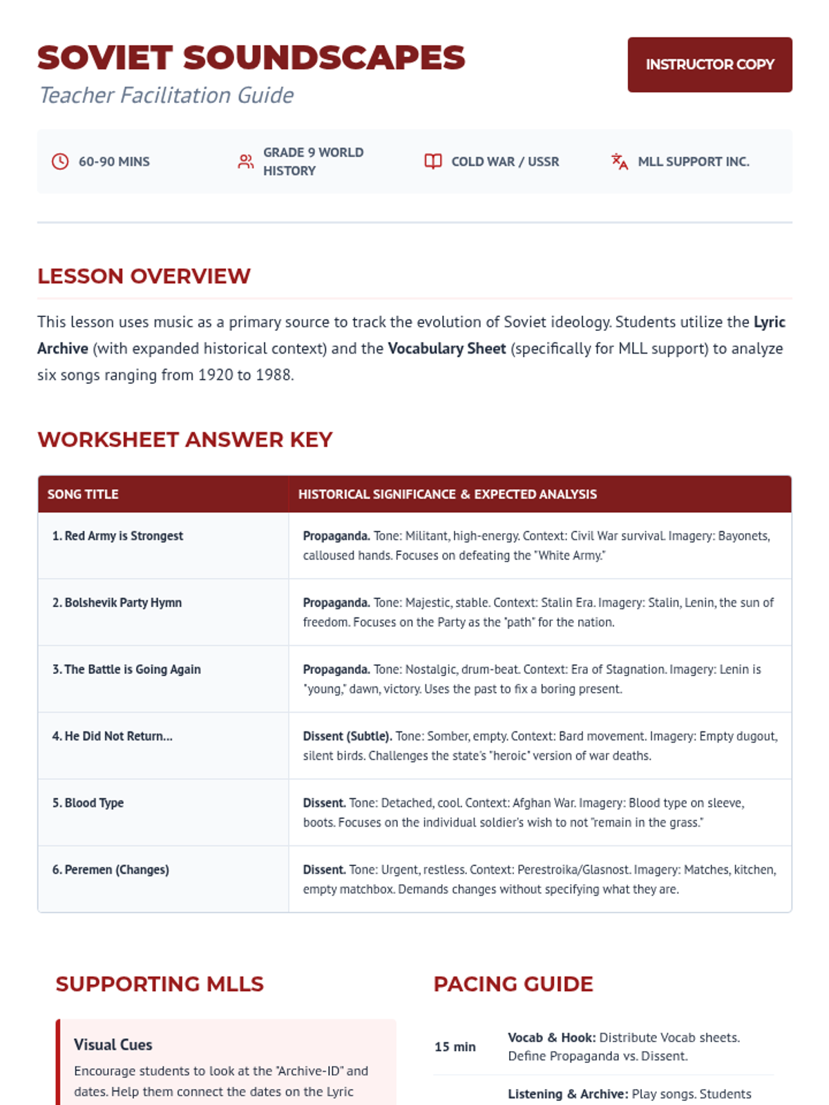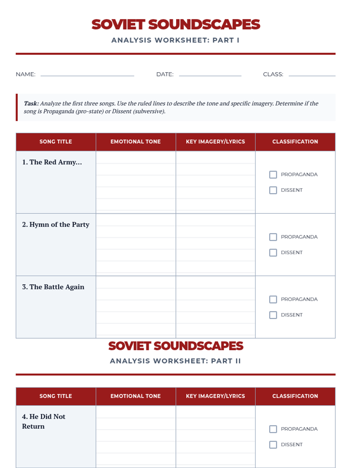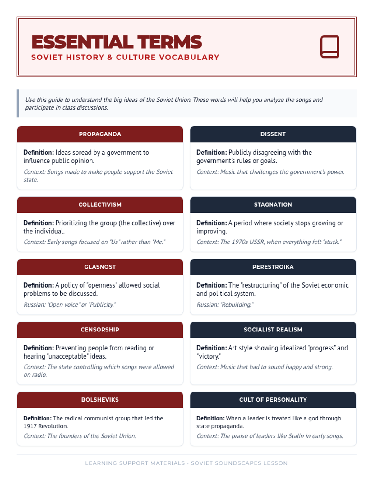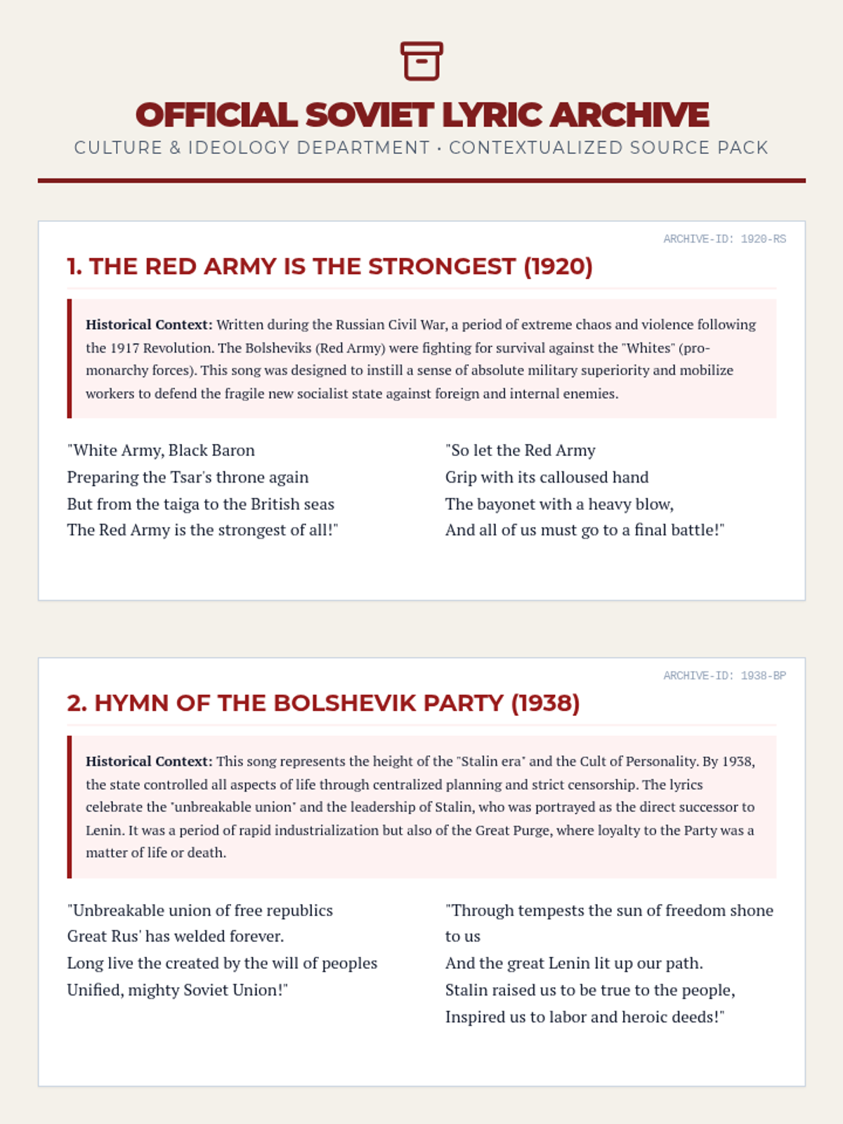 A lesson examining the evolution of Soviet history through its music, comparing state-sponsored propaganda with dissident and personal expressions.
