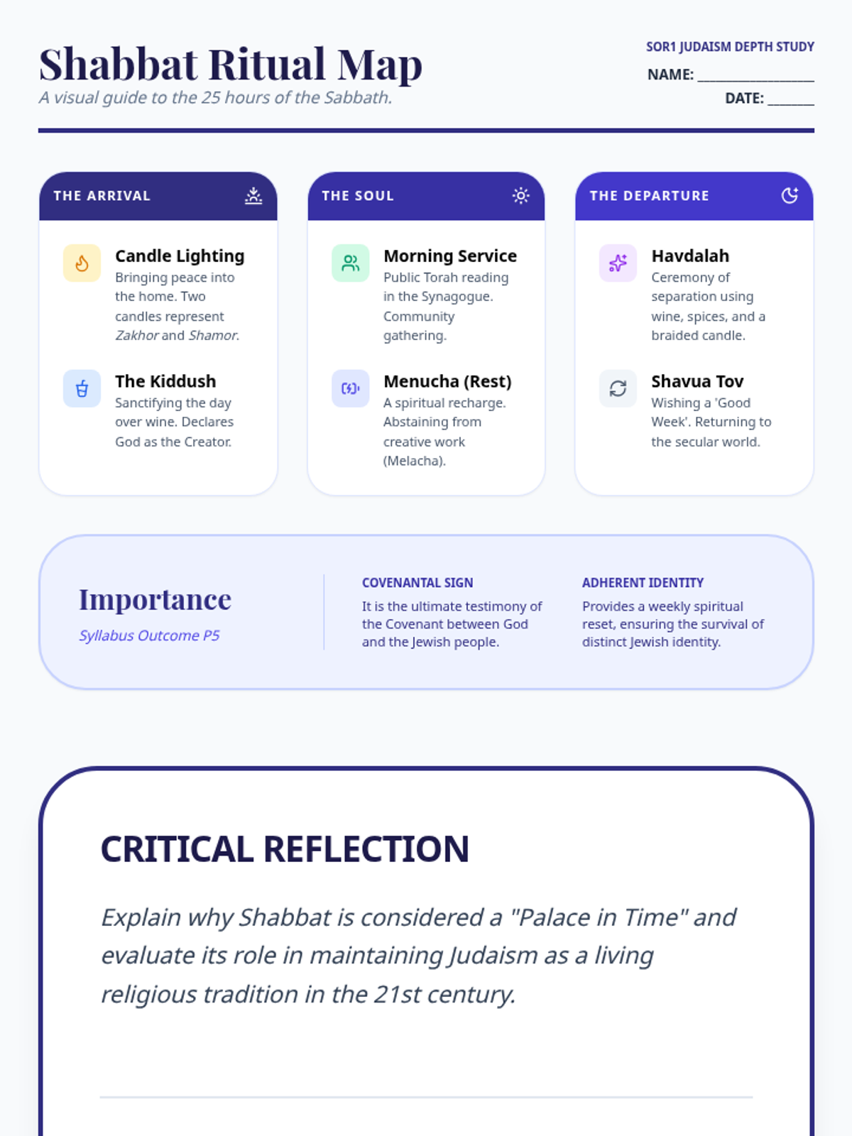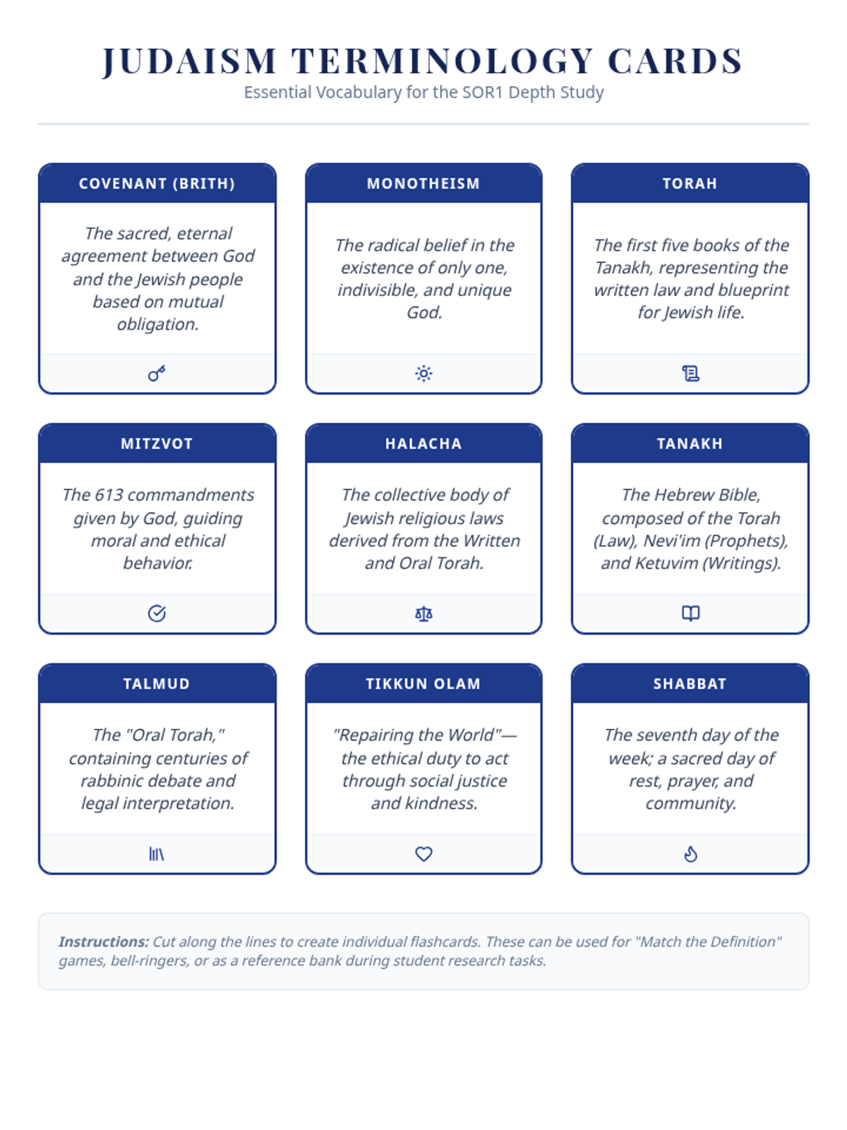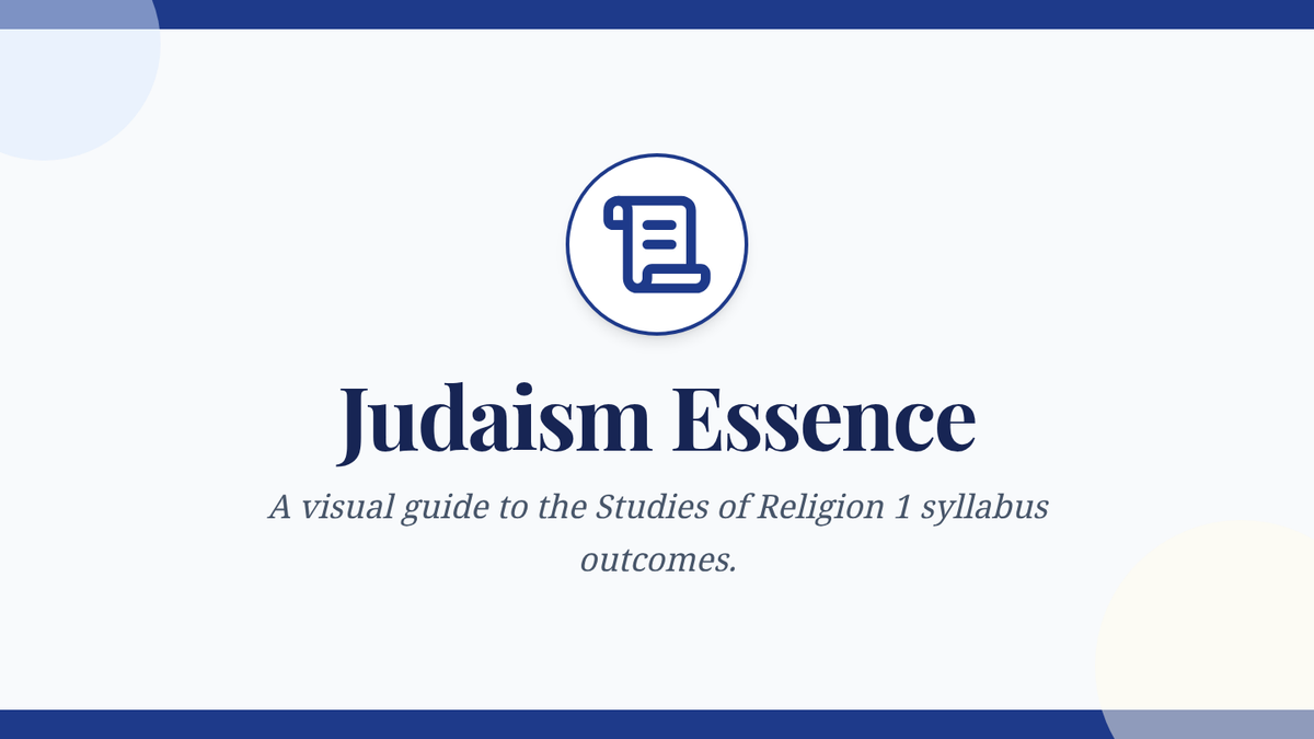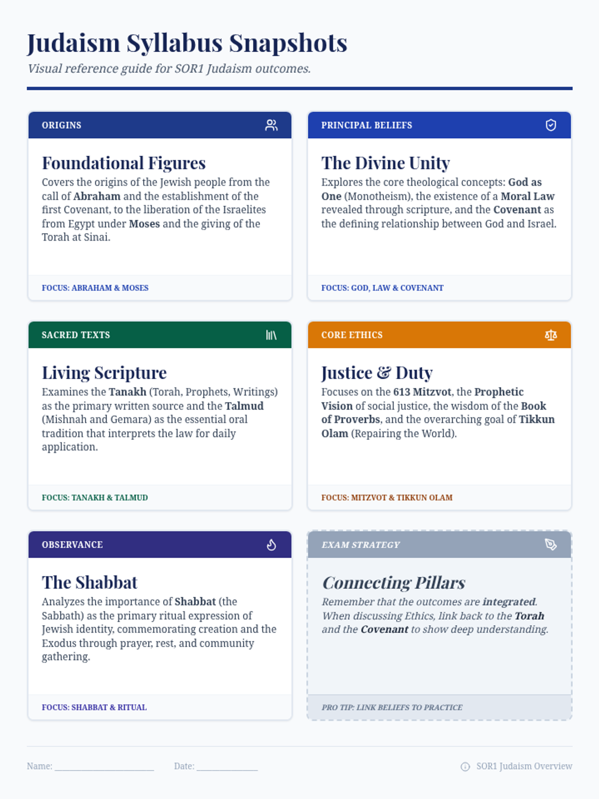 A visual overview of the core pillars of Judaism as outlined in the Studies of Religion 1 syllabus, featuring concise summaries and symbolic illustrations.