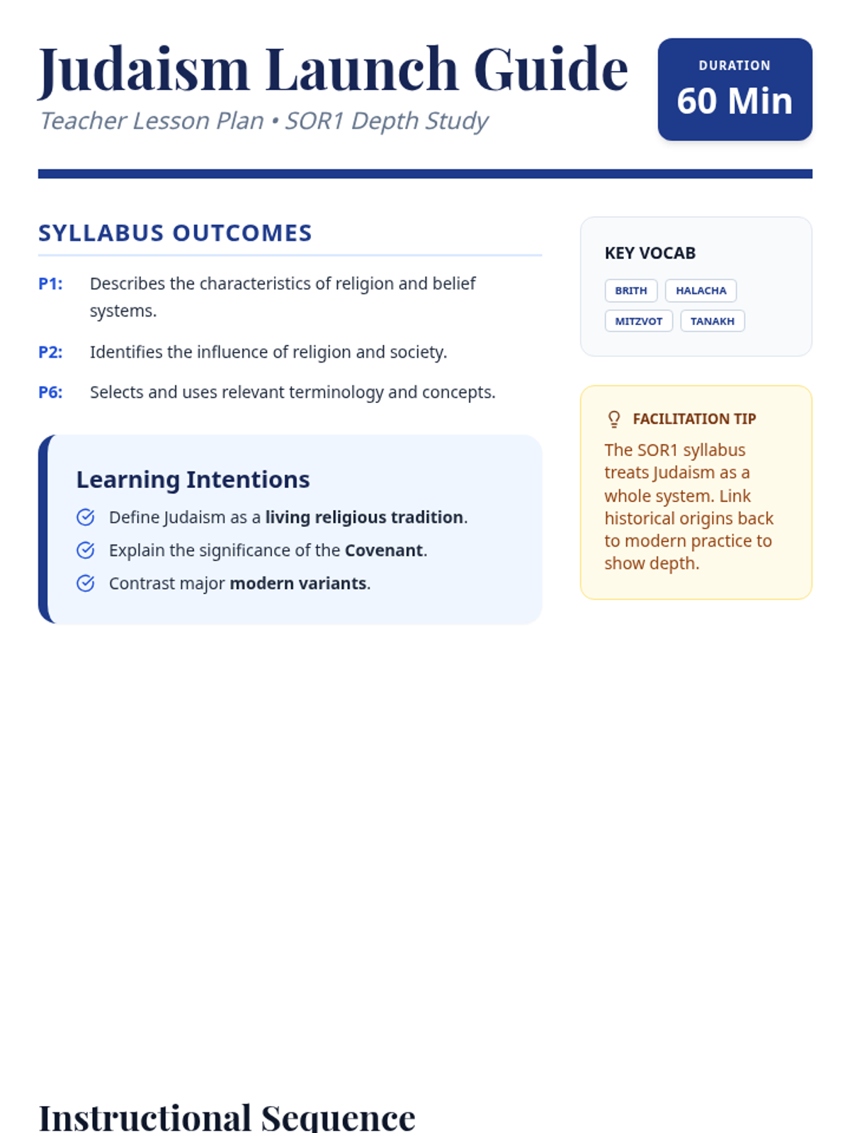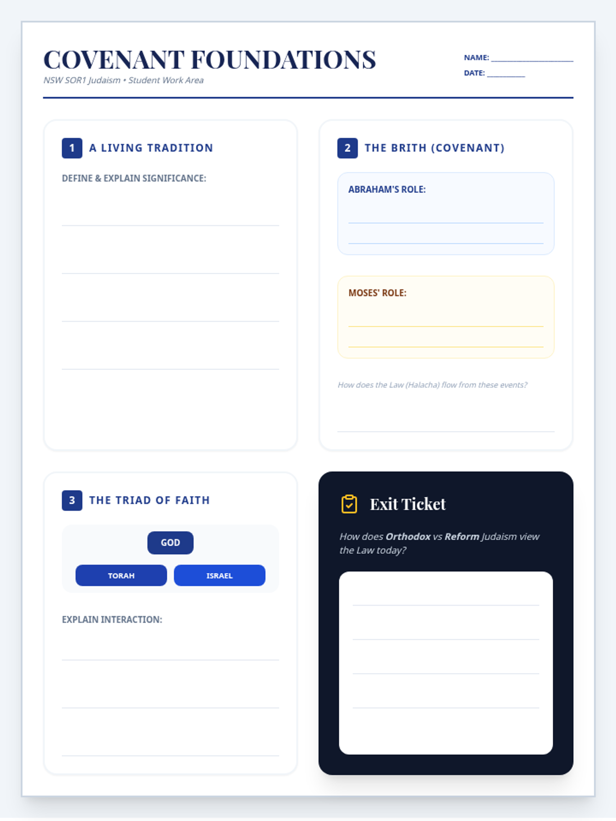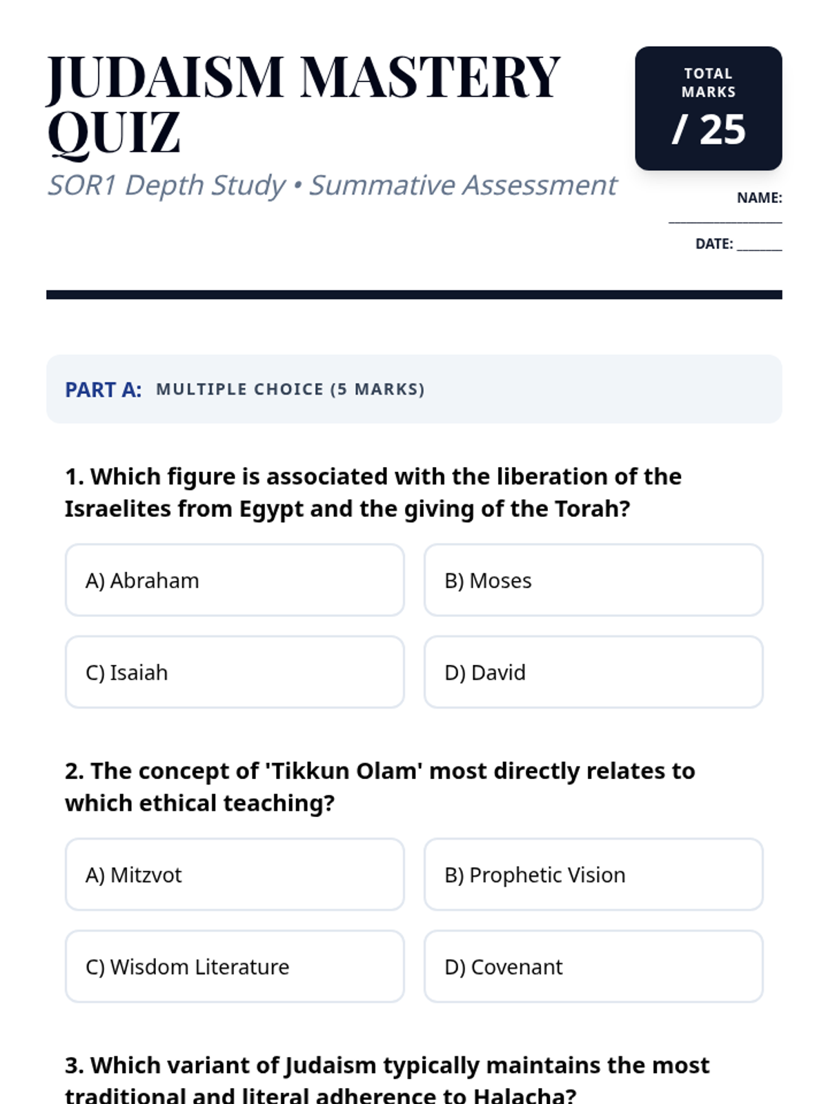 A visual overview of the core pillars of Judaism as outlined in the Studies of Religion 1 syllabus, featuring concise summaries and symbolic illustrations.