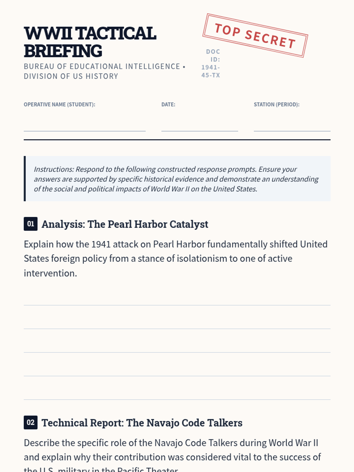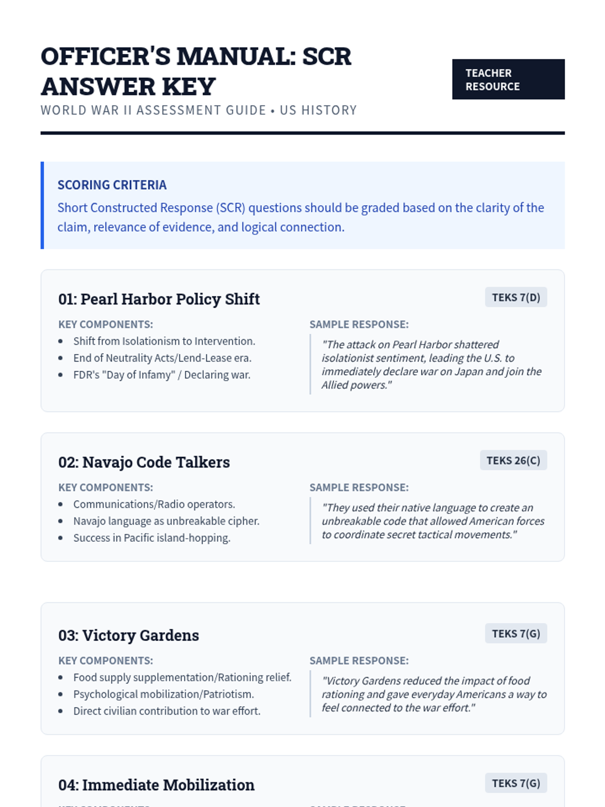 A lesson exploring the domestic and military impacts of WWII, specifically focusing on the attack at Pearl Harbor, the contribution of the Navajo Code Talkers, and the home front mobilization of Victory Gardens.
