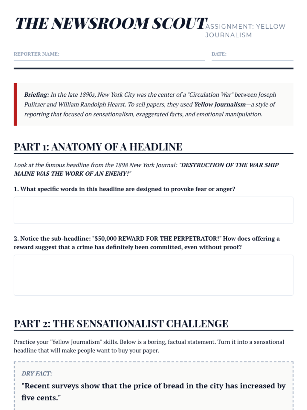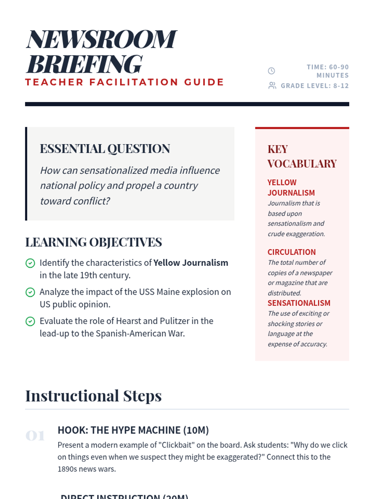 A deep dive into the sensational world of yellow journalism and its pivotal role in propelling the United States into the Spanish-American War. Students analyze historical headlines and the impact of the USS Maine's sinking on public opinion.