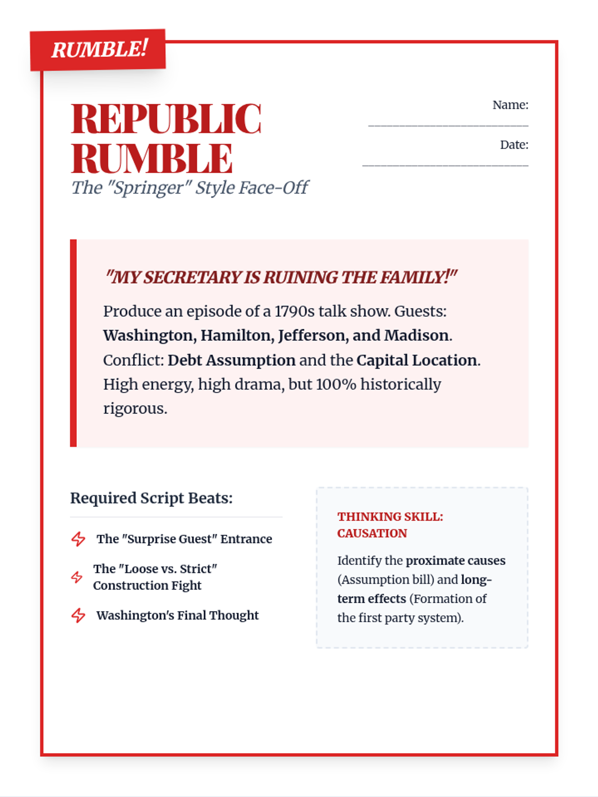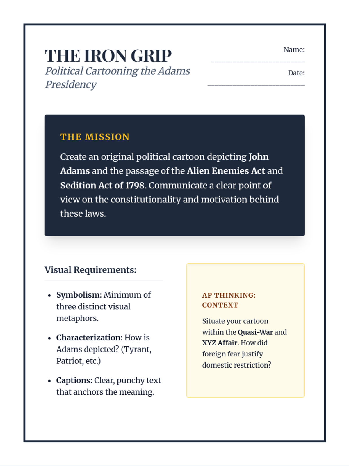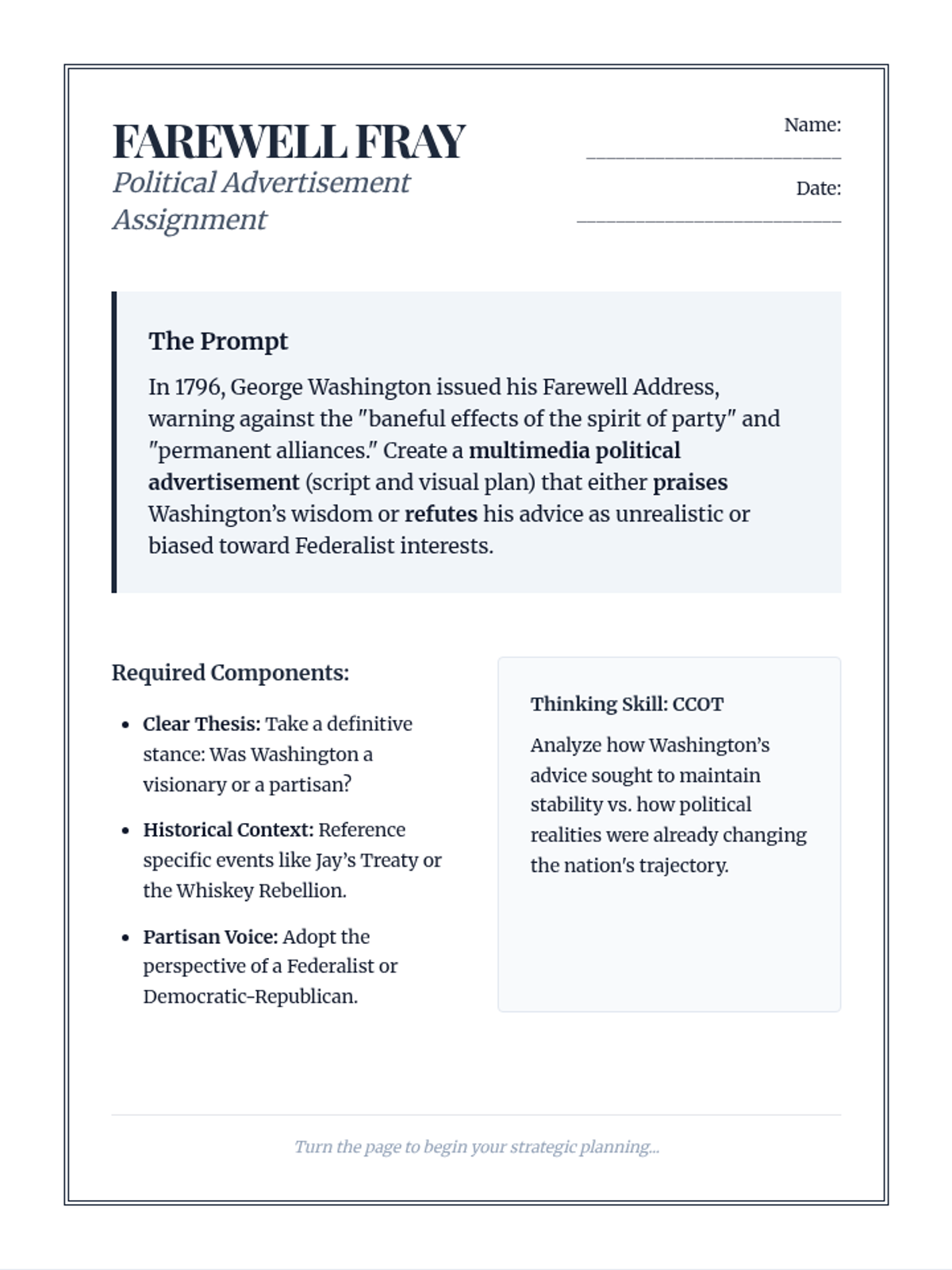 A comprehensive set of project-based learning assignments for AP U.S. History focusing on the political conflicts of the Early Republic (1789-1800), including the emergence of the first party system and the presidency of John Adams.
