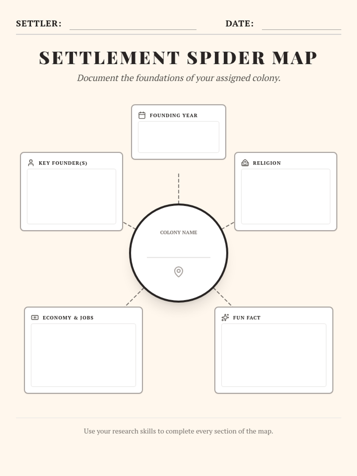 Students explore the 13 American colonies by researching and documenting key characteristics using a spider map graphic organizer.