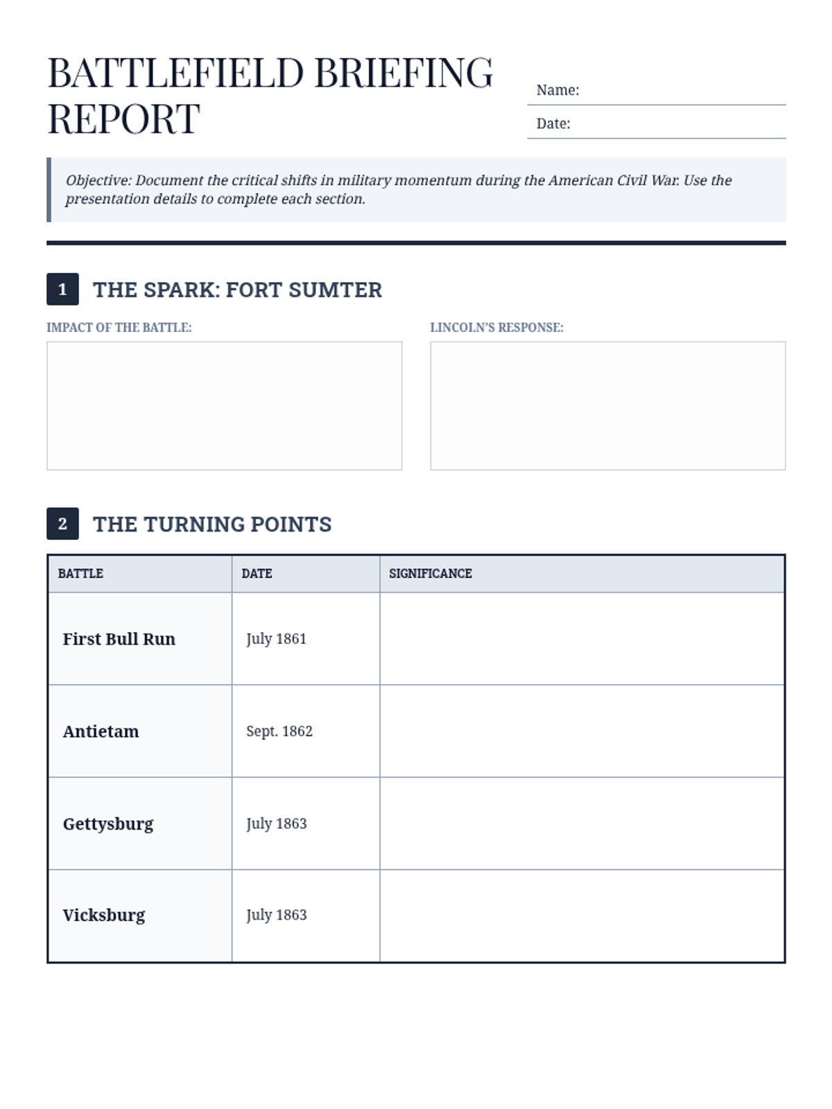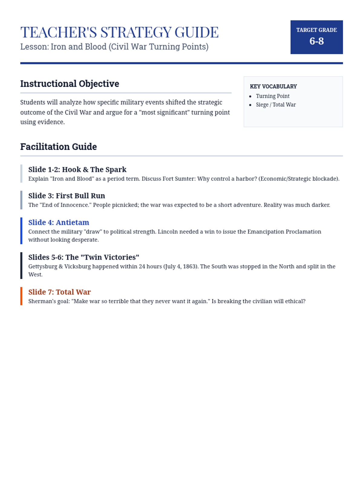 A focused exploration of the military turning points of the American Civil War, designed for middle school students to understand how specific battles shifted the momentum of the conflict.
