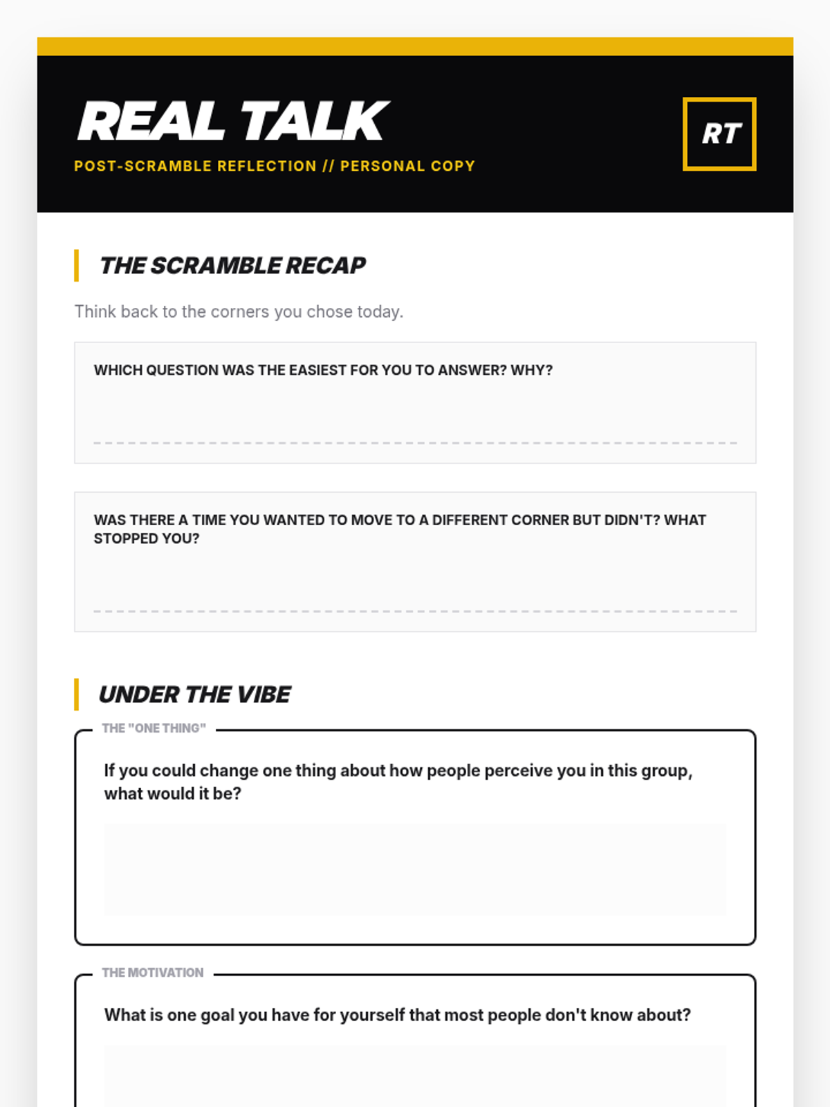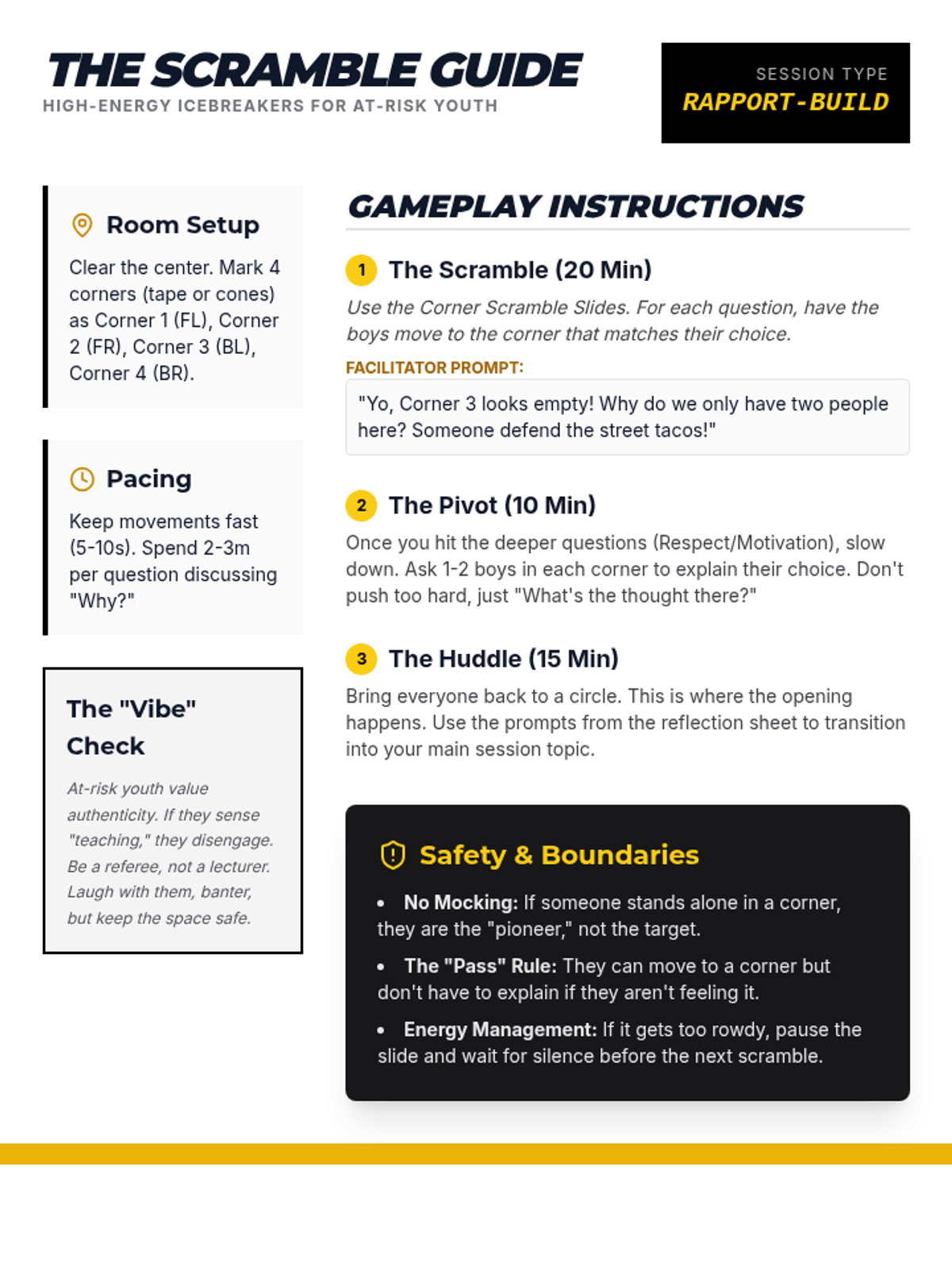 A direct, high-energy icebreaker session for high school boys using a 4-corner movement game to build group rapport through playful debate and choices.
