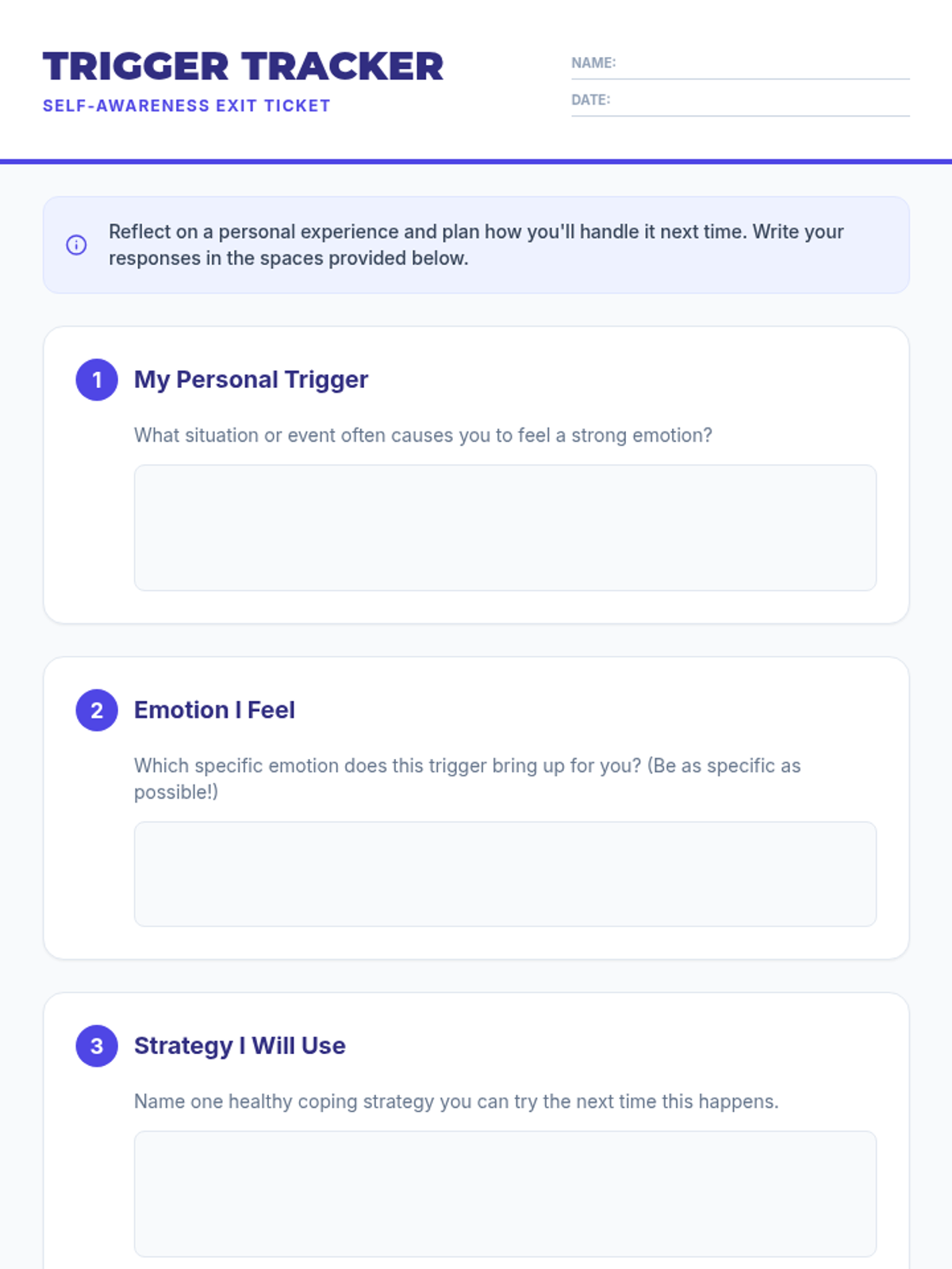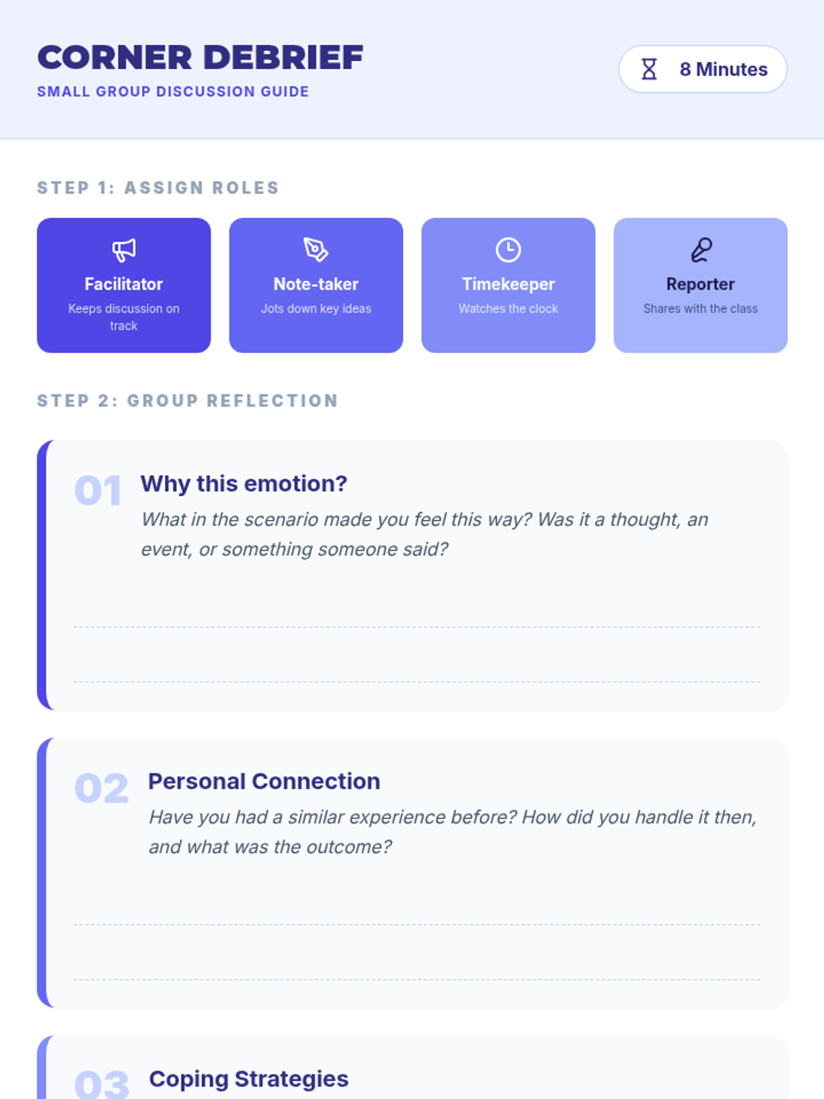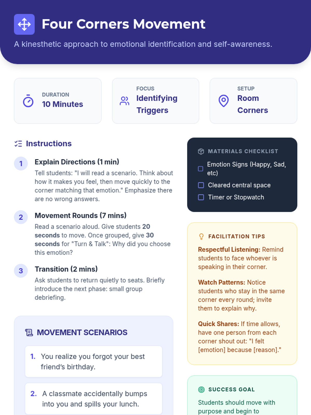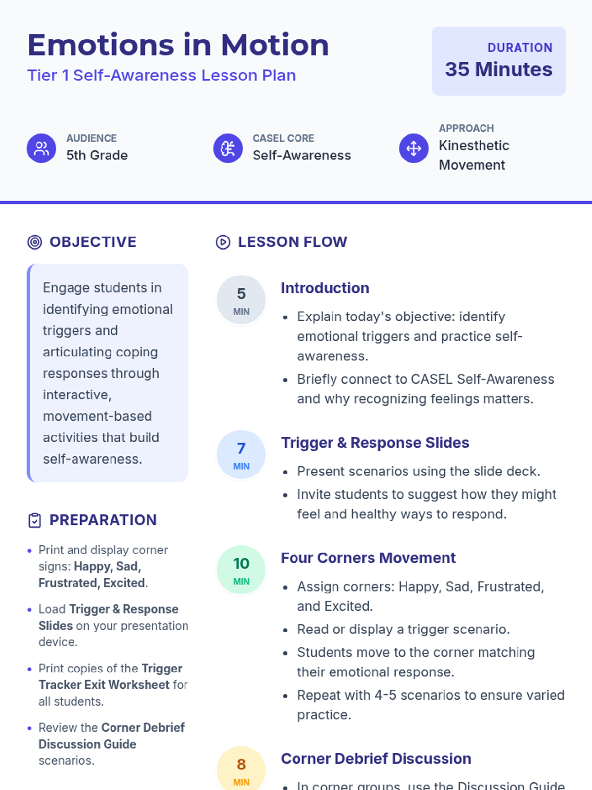 An interactive, movement-based lesson where 5th graders explore self-awareness by identifying emotional triggers and responses through corner-based discussions. This Tier 1 session supports CASEL Self-Awareness by helping students recognize and articulate feelings in real-life scenarios.