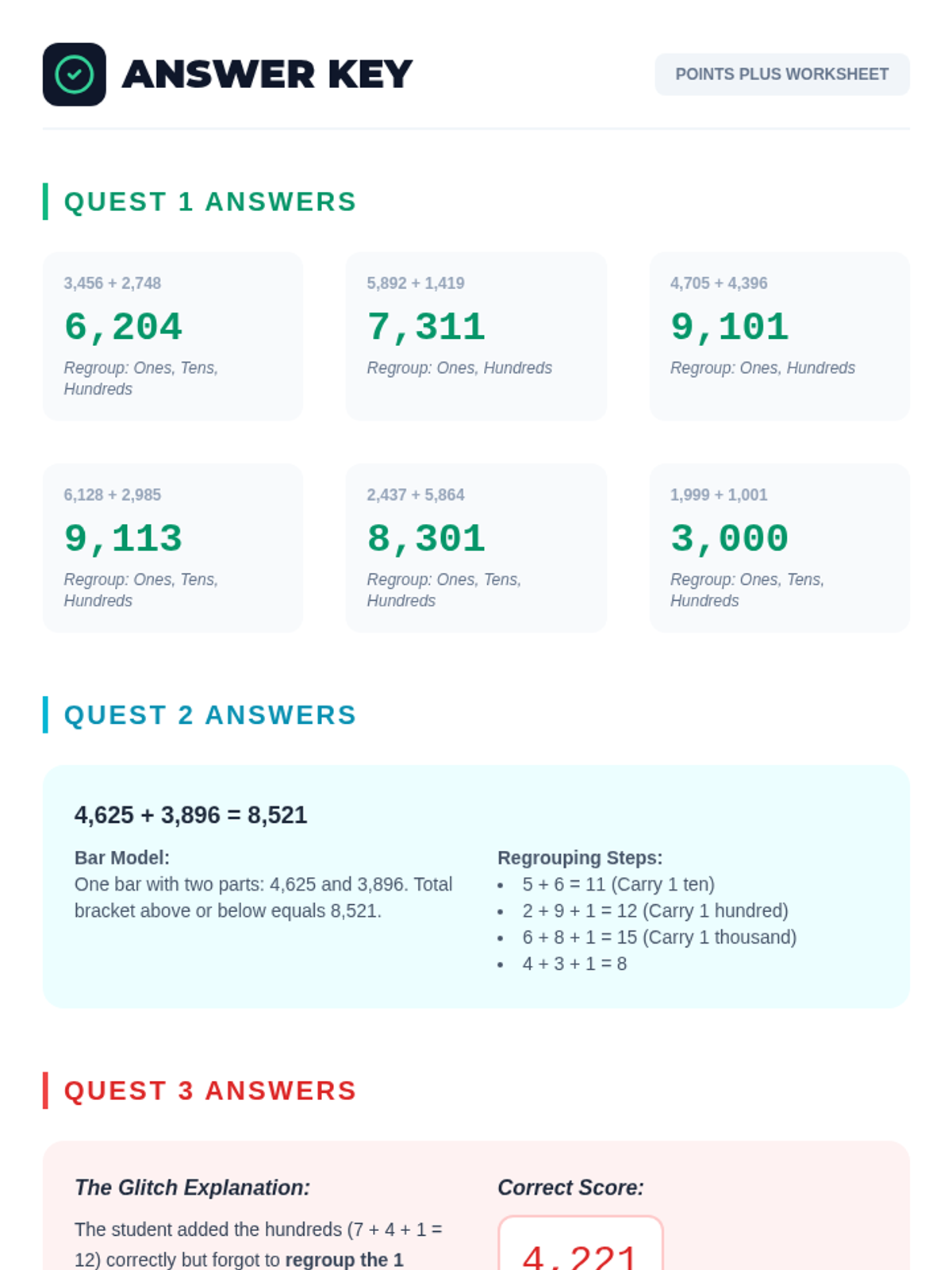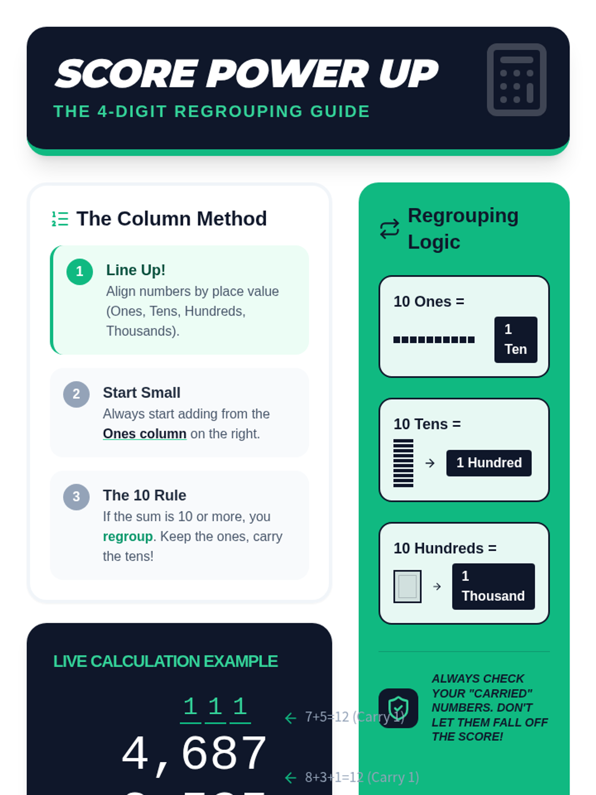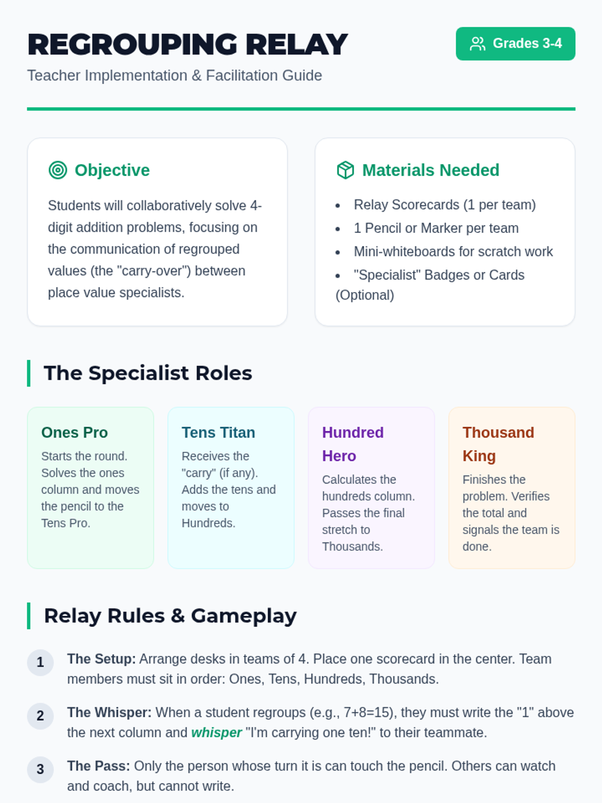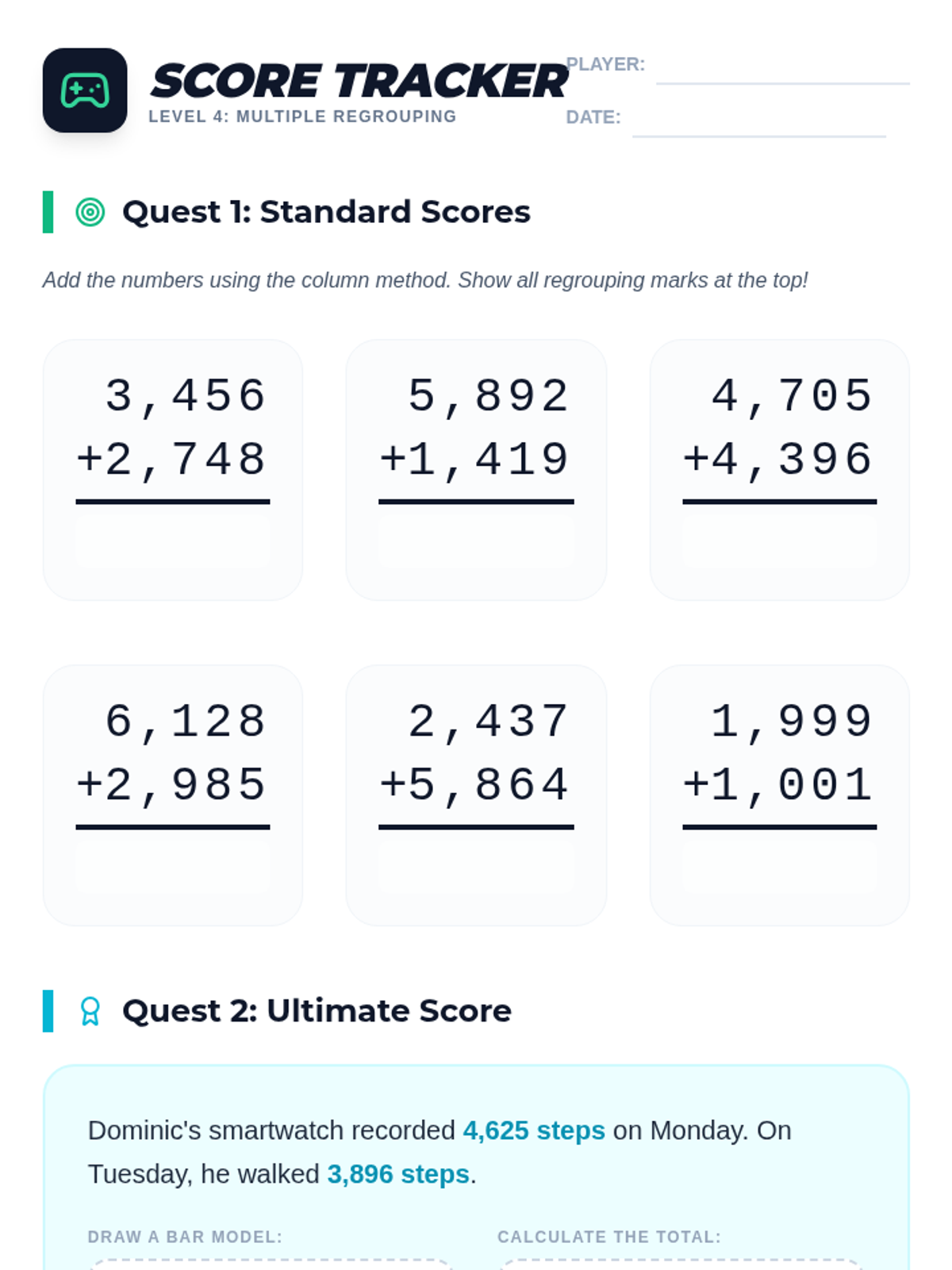 Students master 4-digit addition with multiple regrouping steps through a collaborative relay activity and game-score analysis based on real-world scenarios.
