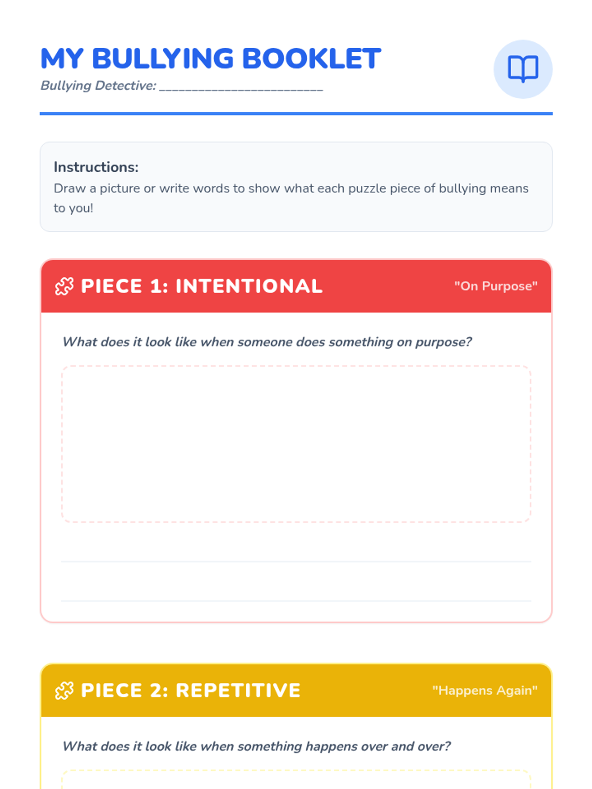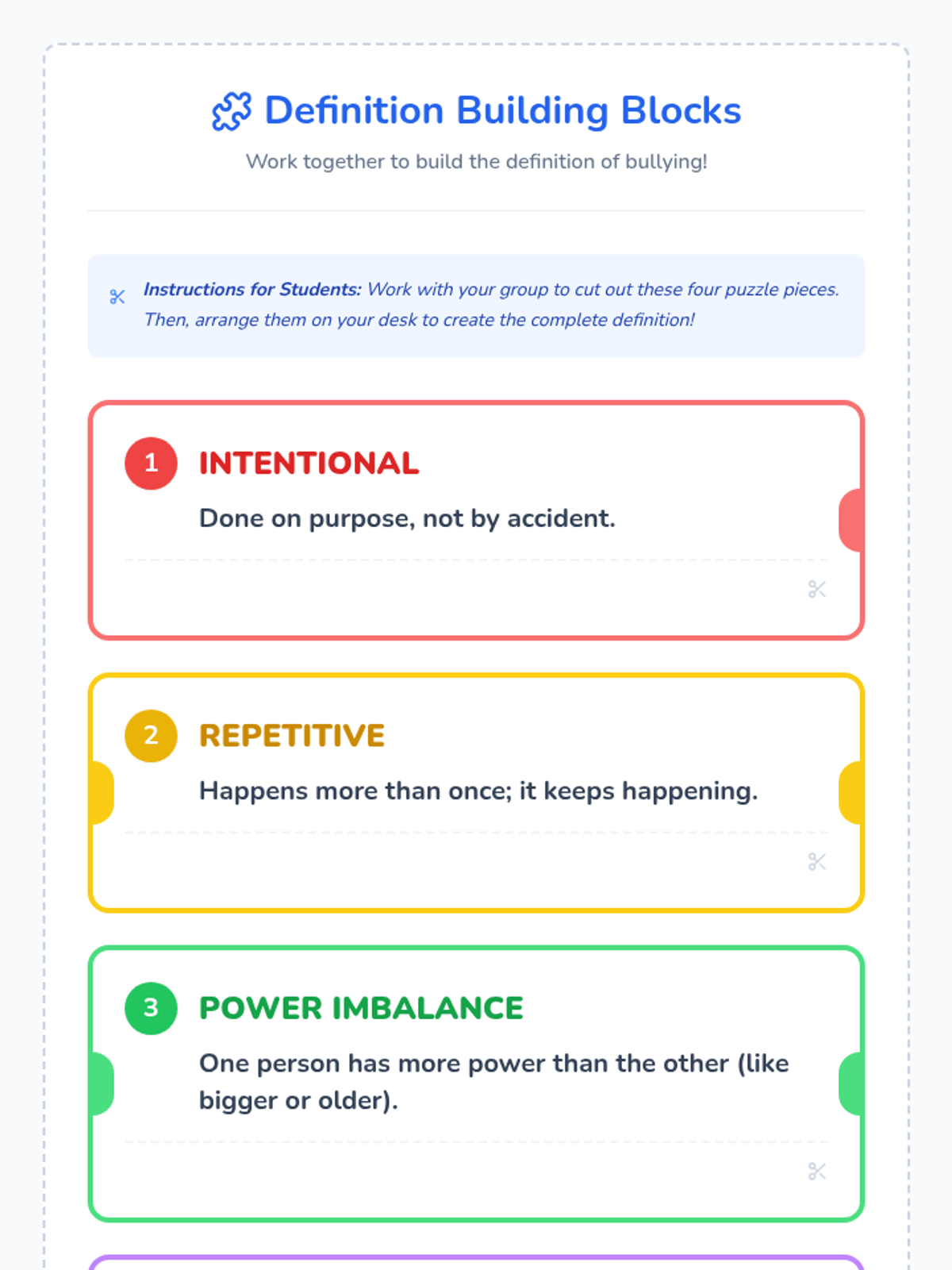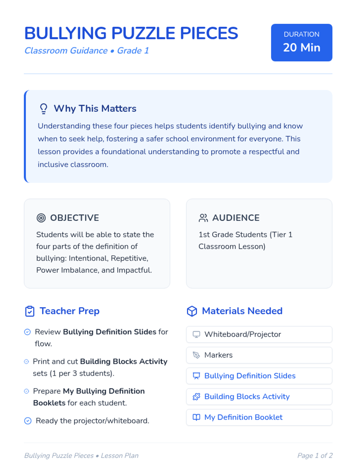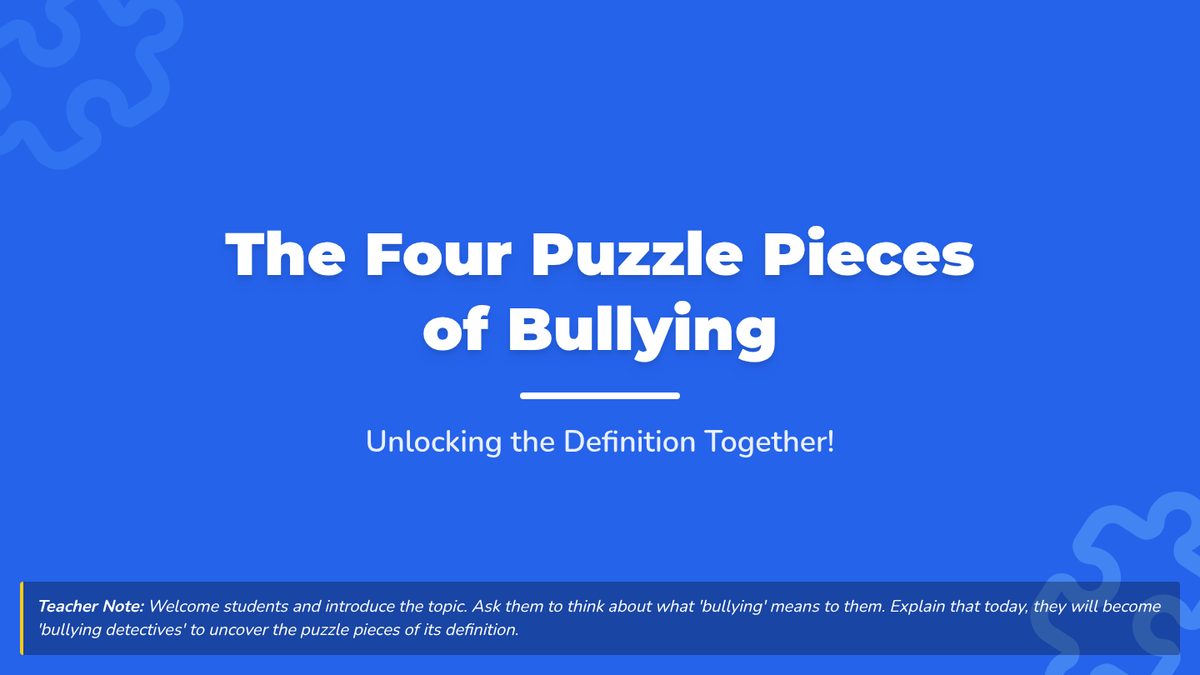 A 20-minute Tier 1 classroom lesson for 1st graders that breaks down the definition of bullying into four clear 'puzzle pieces': intentional, repetitive, power imbalance, and impactful. Students engage with slides, a hands-on building block activity, and a personal reflection booklet.