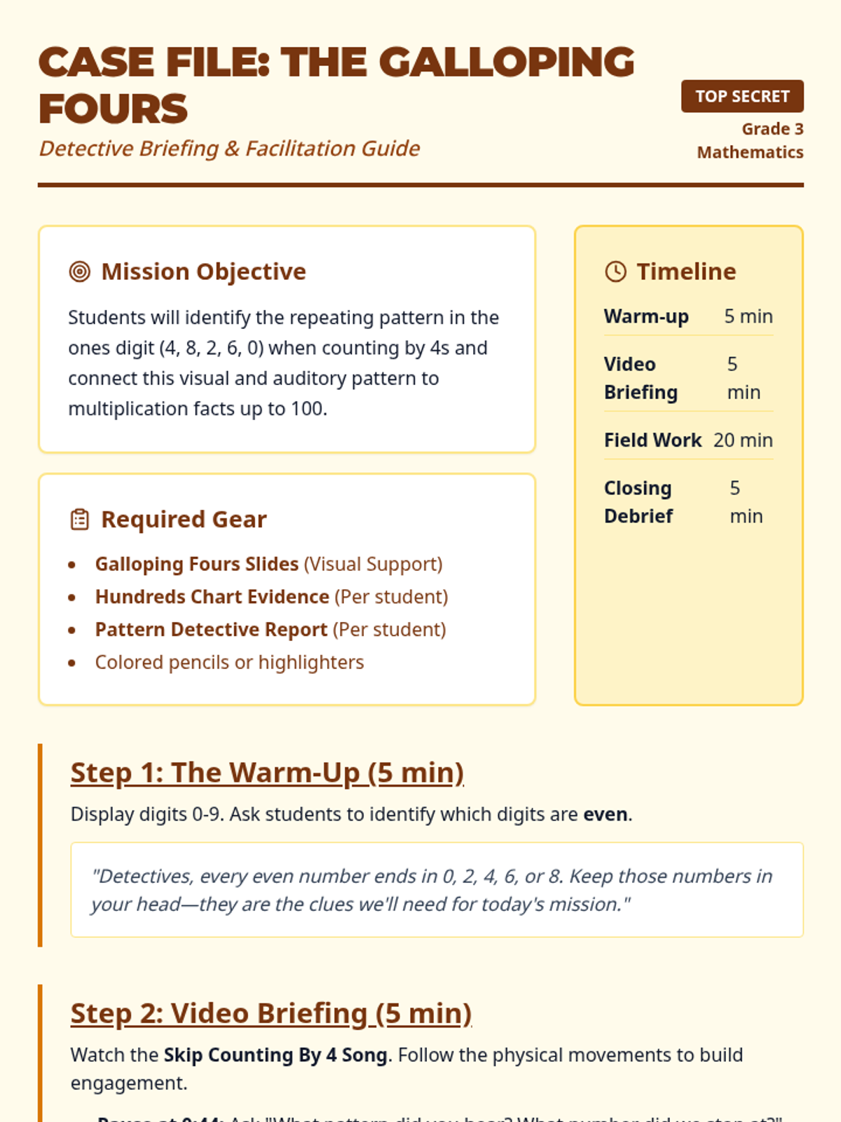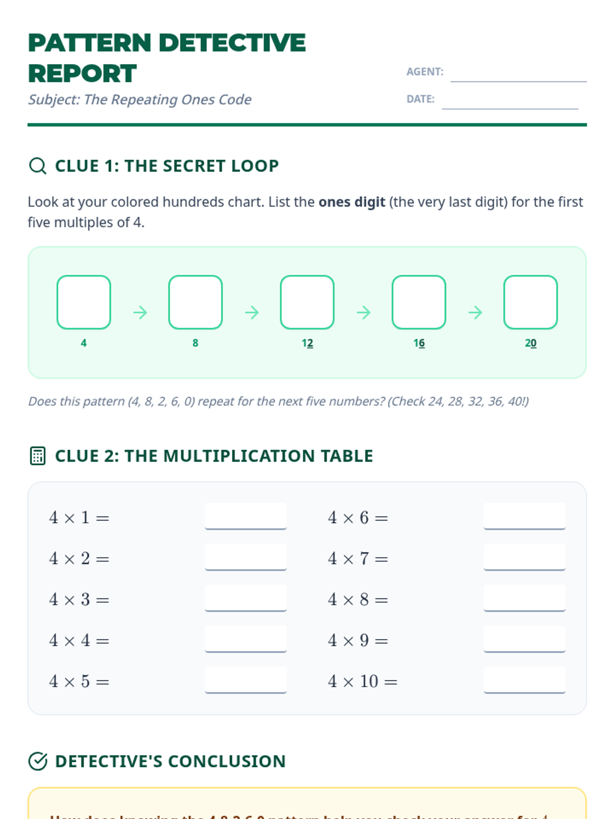 Students investigate skip counting by 4s to discover the repeating 4-8-2-6-0 pattern in the ones digit and relate it to multiplication facts.
