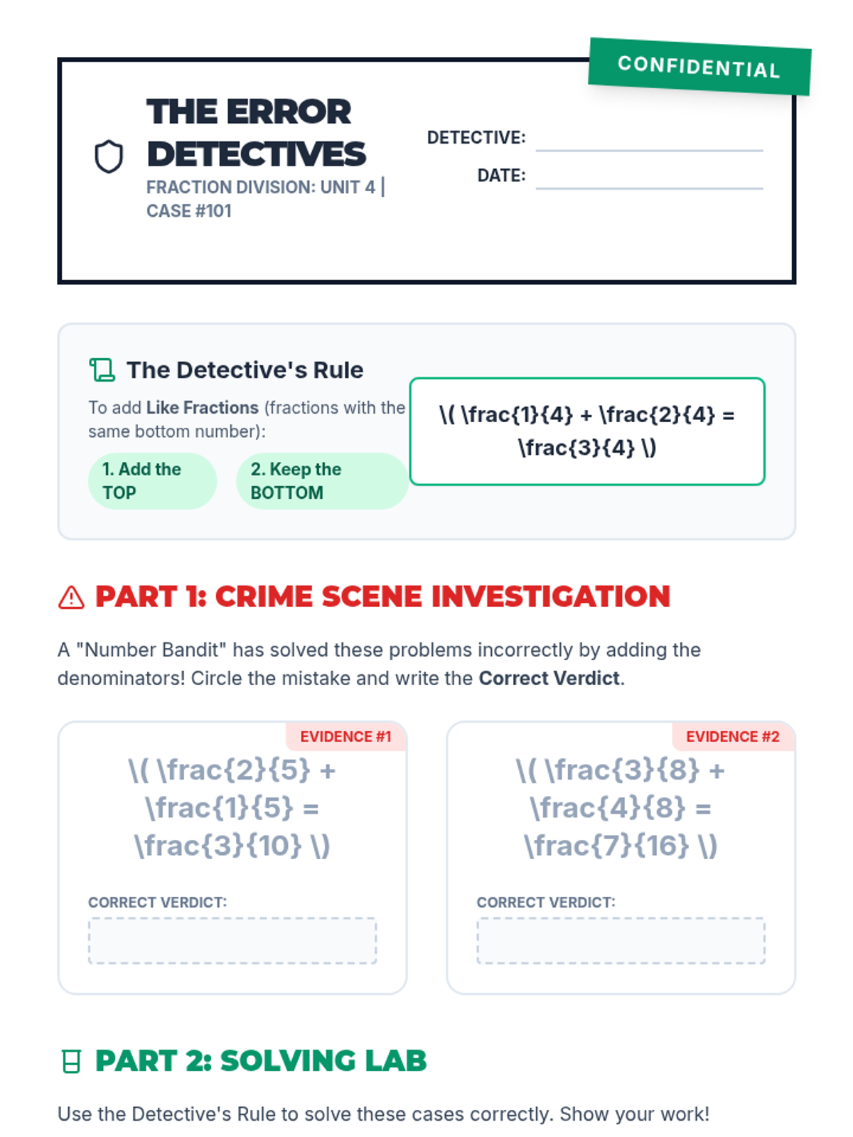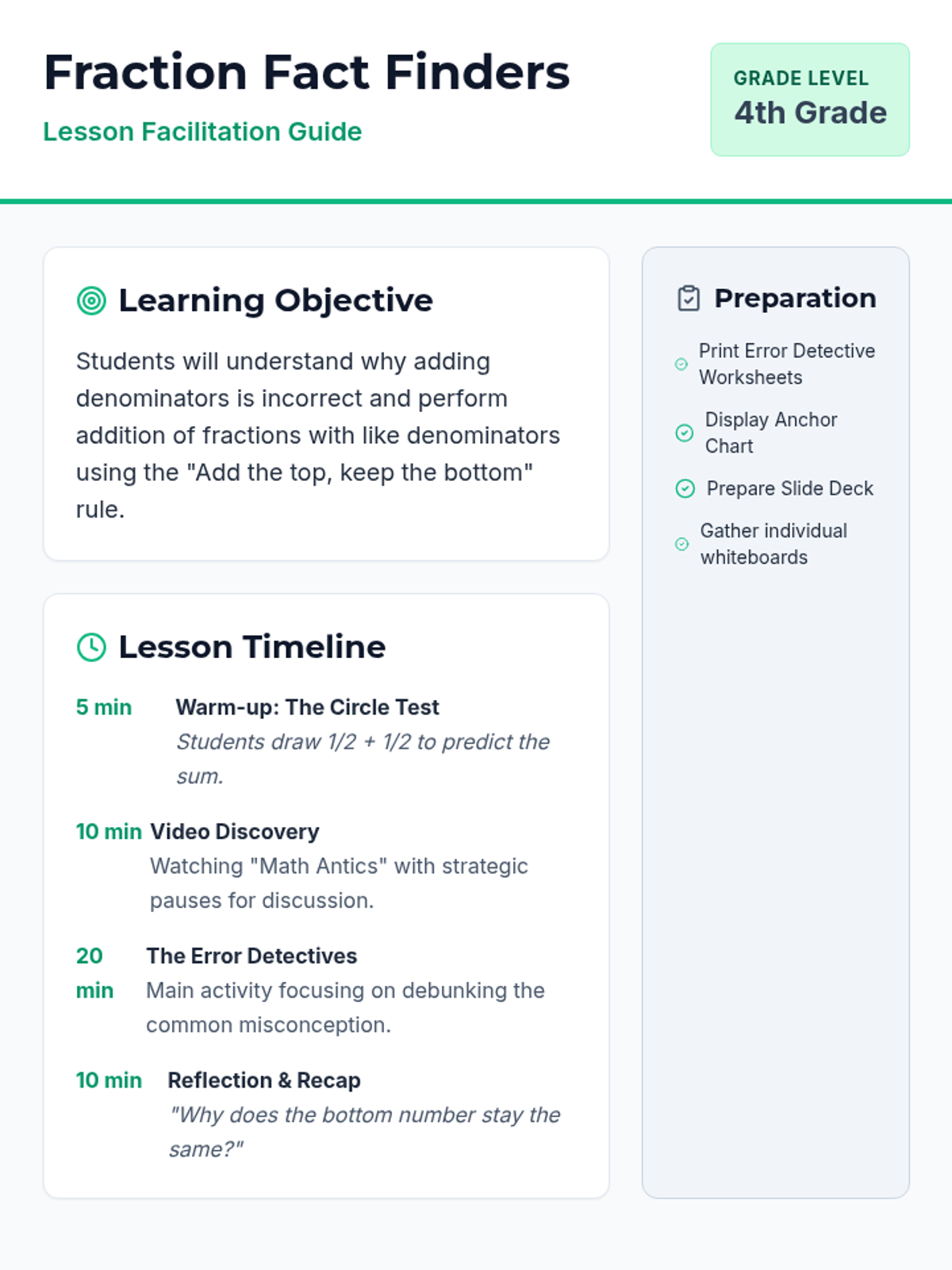 A comprehensive lesson for 4th graders on adding fractions with like denominators, focusing on the common misconception of adding denominators and using visual models to prove the correct method.
