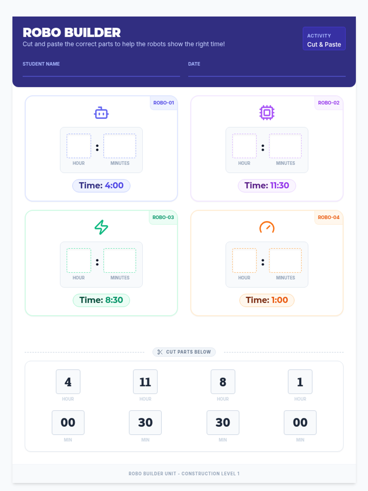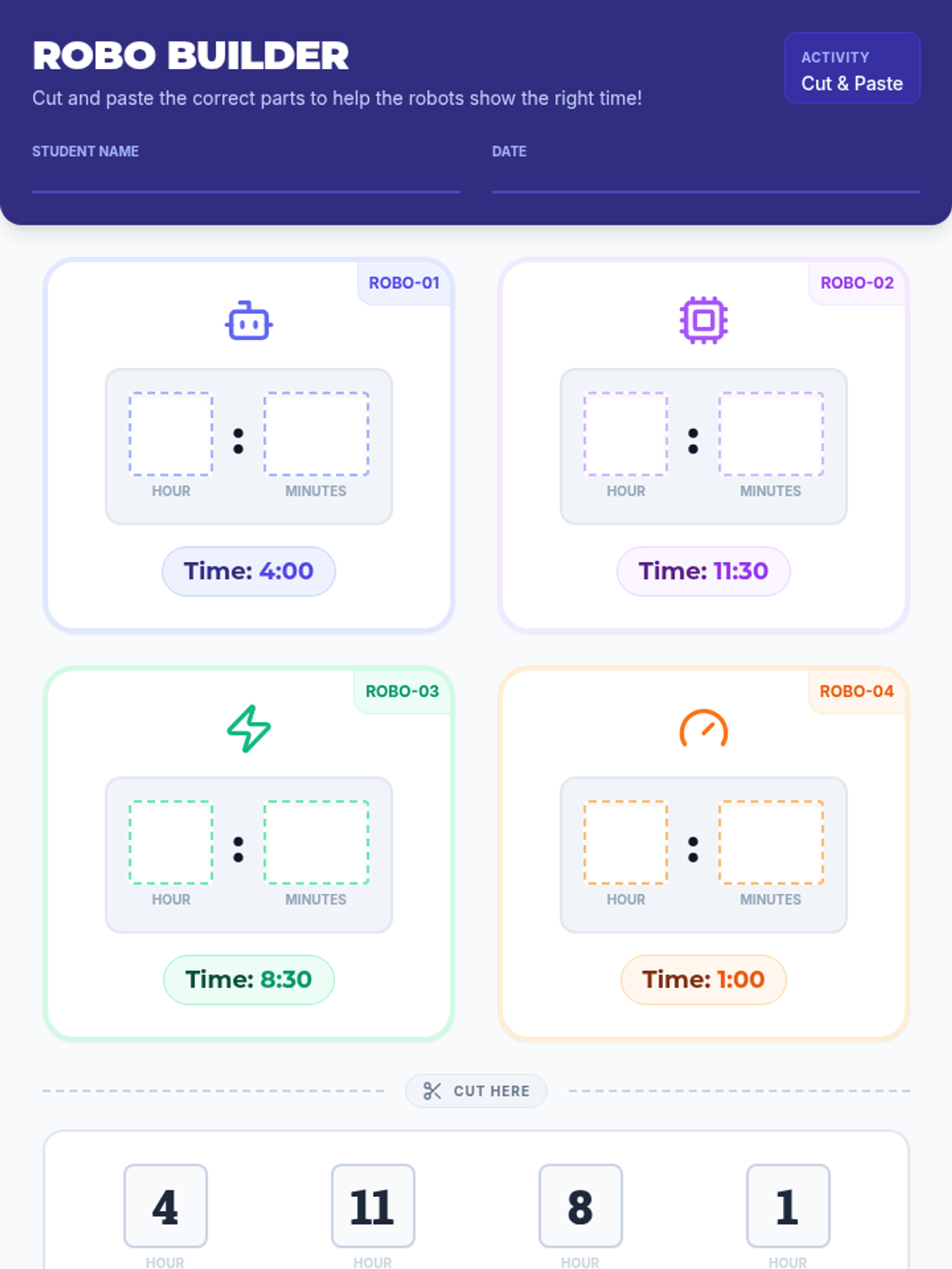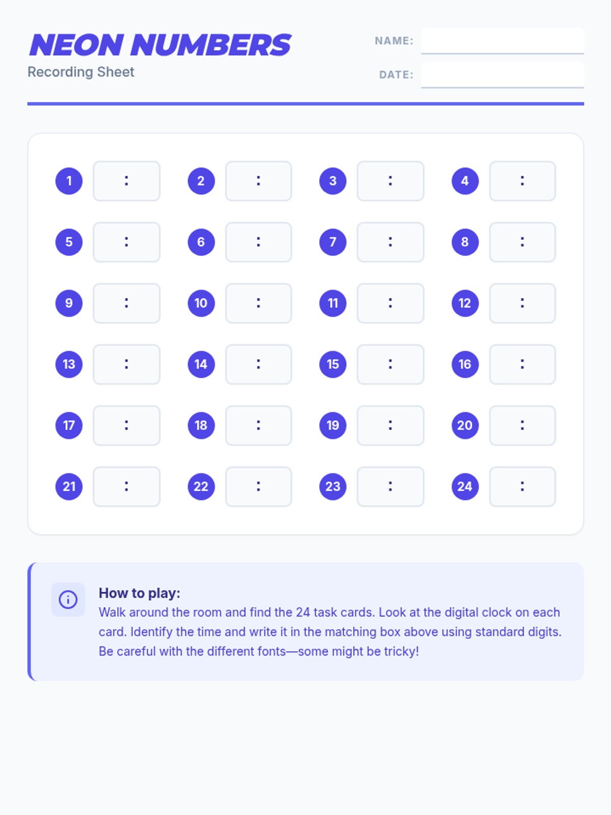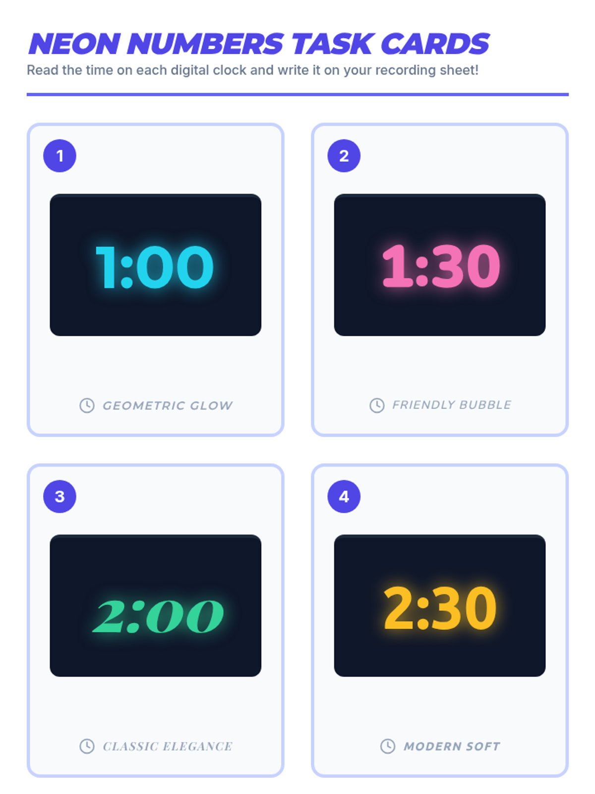 A high-energy matching activity where students pair neon digital clock displays with standard digital time cards. Focuses on reinforcing identification of hours and half-hours through kinesthetic play.