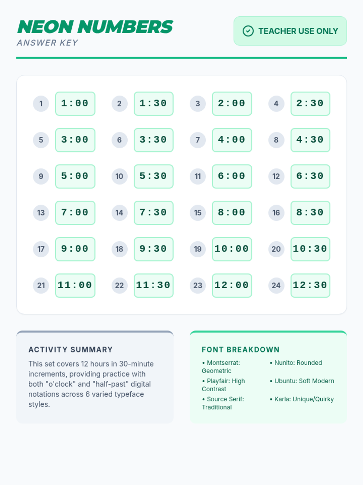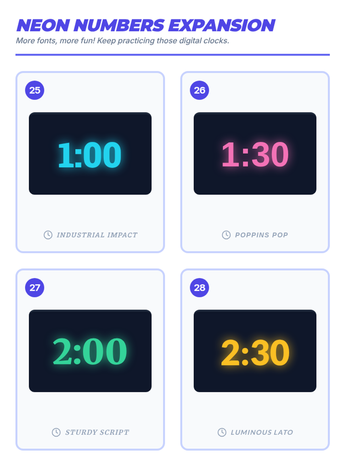 A lesson focused on reading digital time in various fonts and styles, covering every hour and half-hour. Students practice identifying digits across different typefaces to build fluency in reading digital displays.