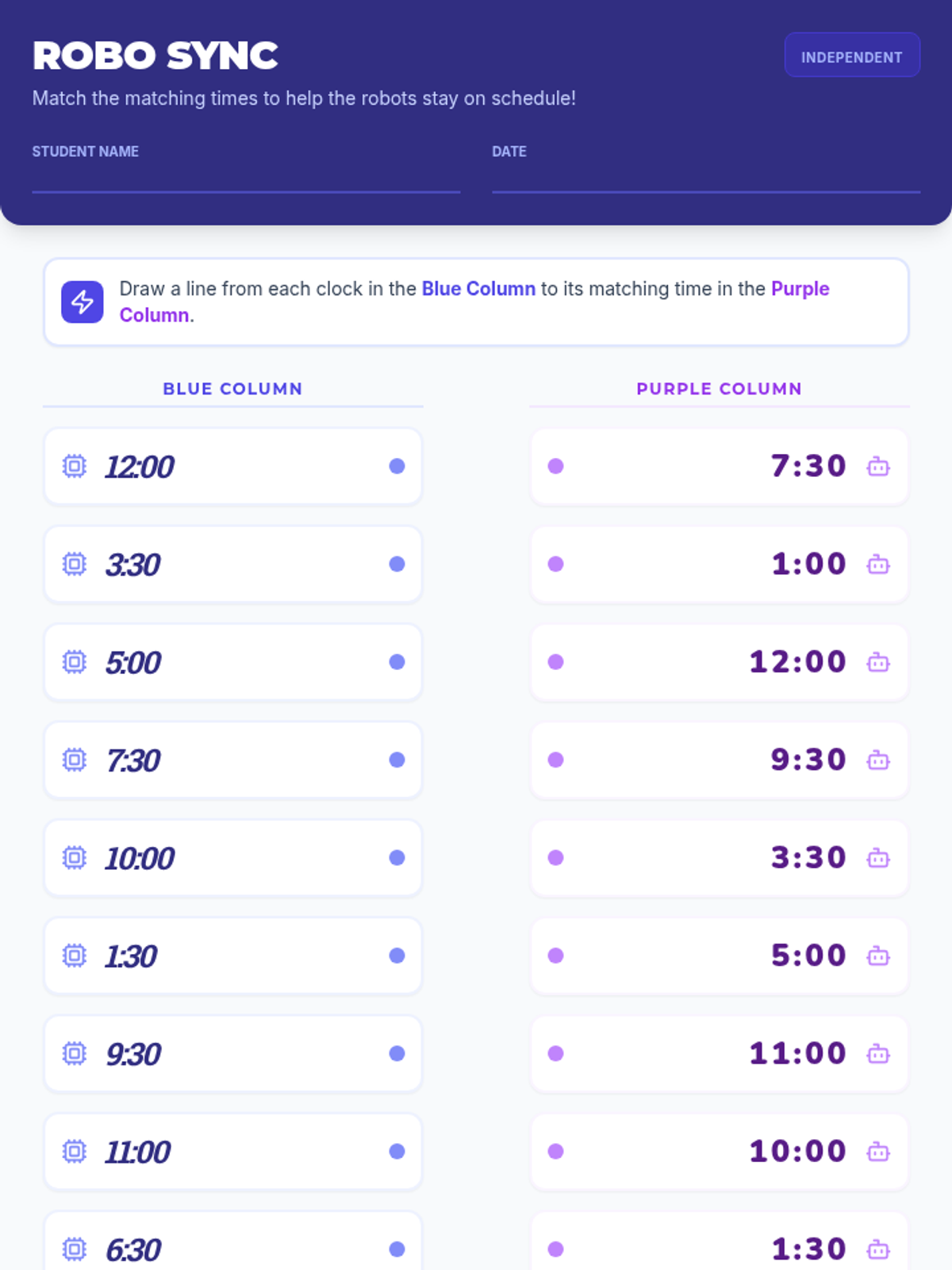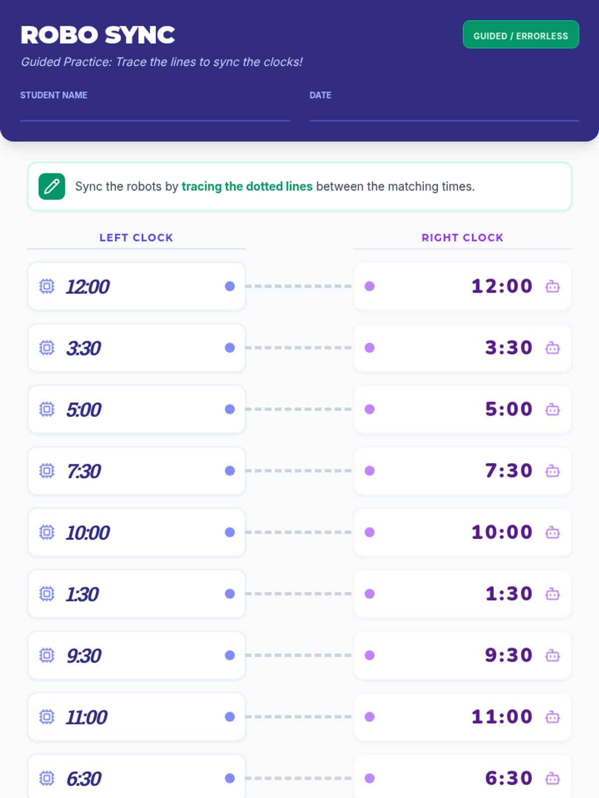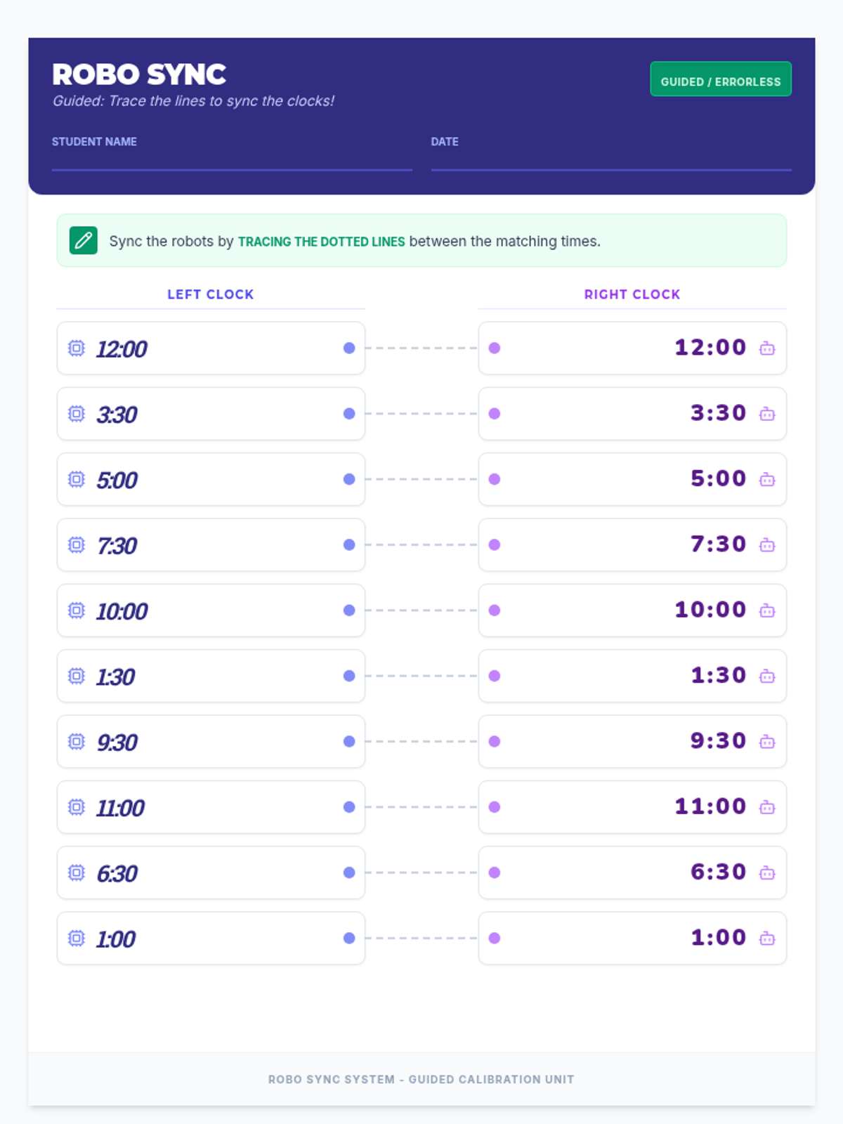 A hands-on lesson for primary students to master reading 12-hour clocks to the hour and half-hour through a matching game. Students will connect analog clock faces with their corresponding digital representations.