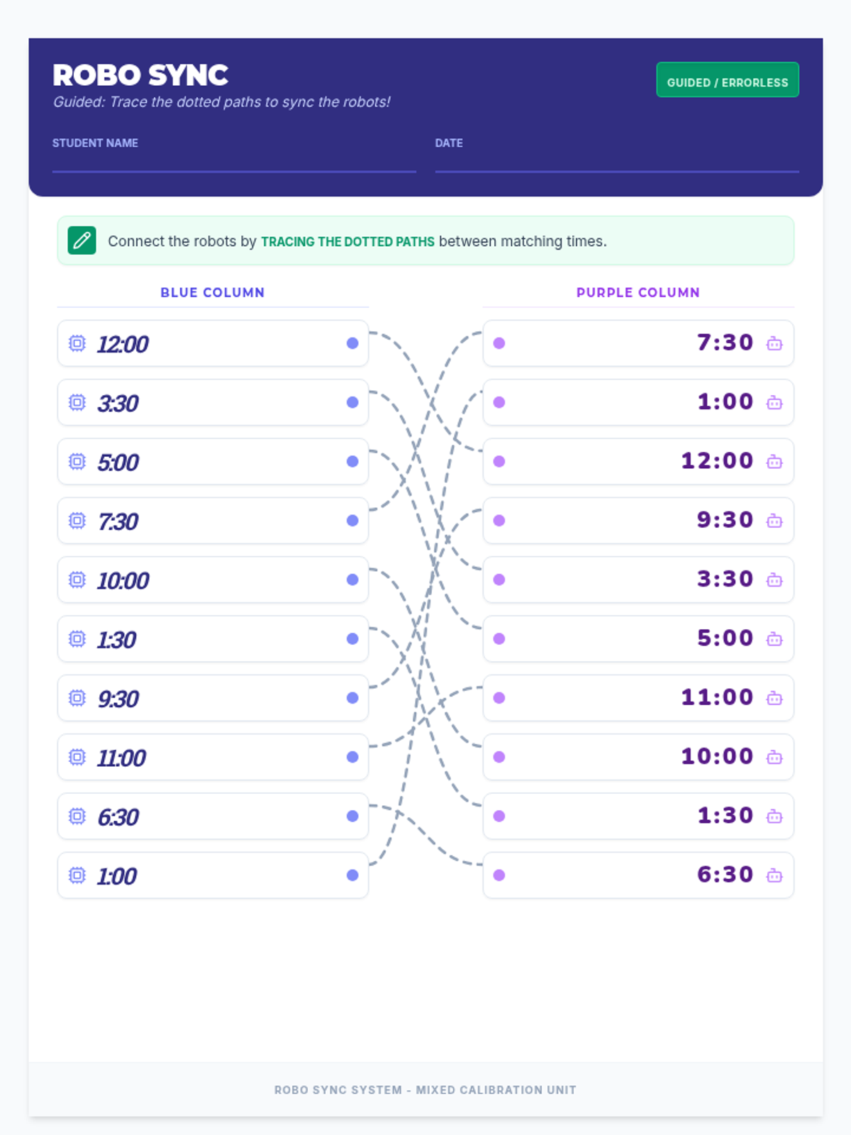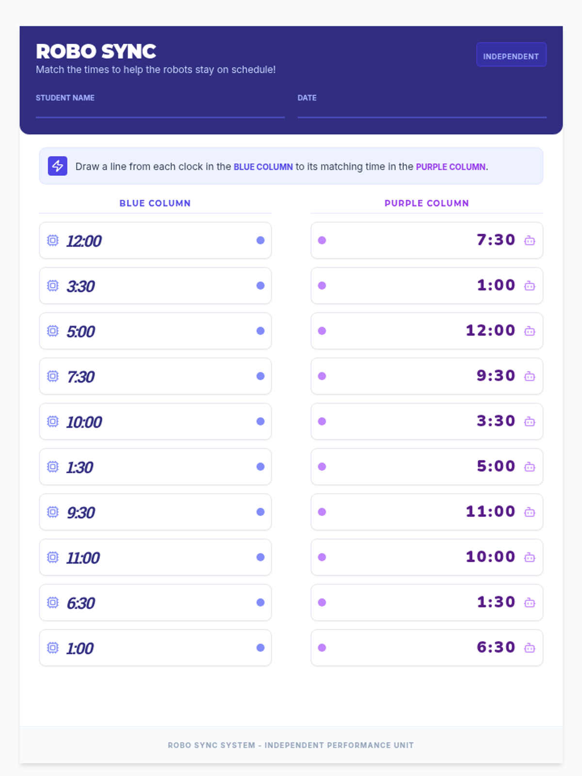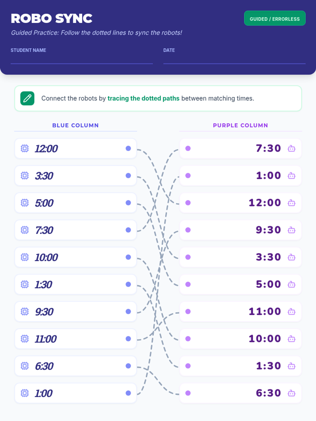 A hands-on lesson for primary students to master reading 12-hour clocks to the hour and half-hour through a matching game. Students will connect analog clock faces with their corresponding digital representations.