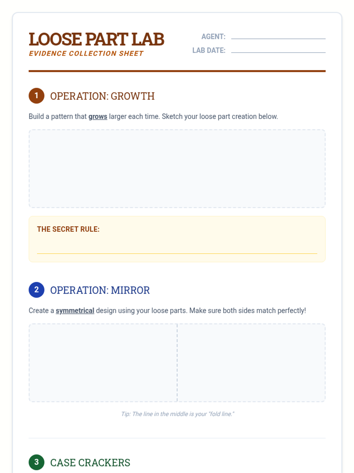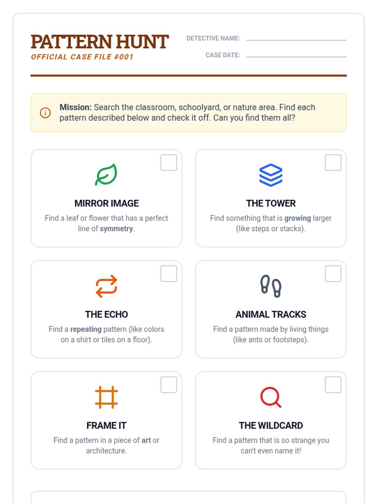 A hands-on exploration of patterns in nature, art, and the environment. Students move beyond simple repetition to discover growing patterns and symmetry using loose parts and detective-style observation.