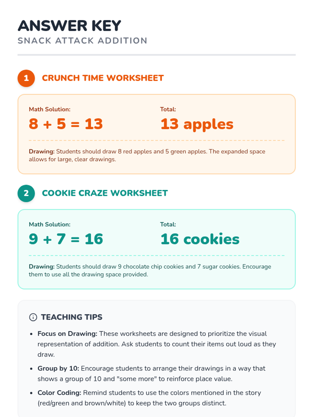 Focuses on the core concept of bundling 10 ones to make 1 ten. Includes high-repetition practice circling groups of ten and counting leftovers.
