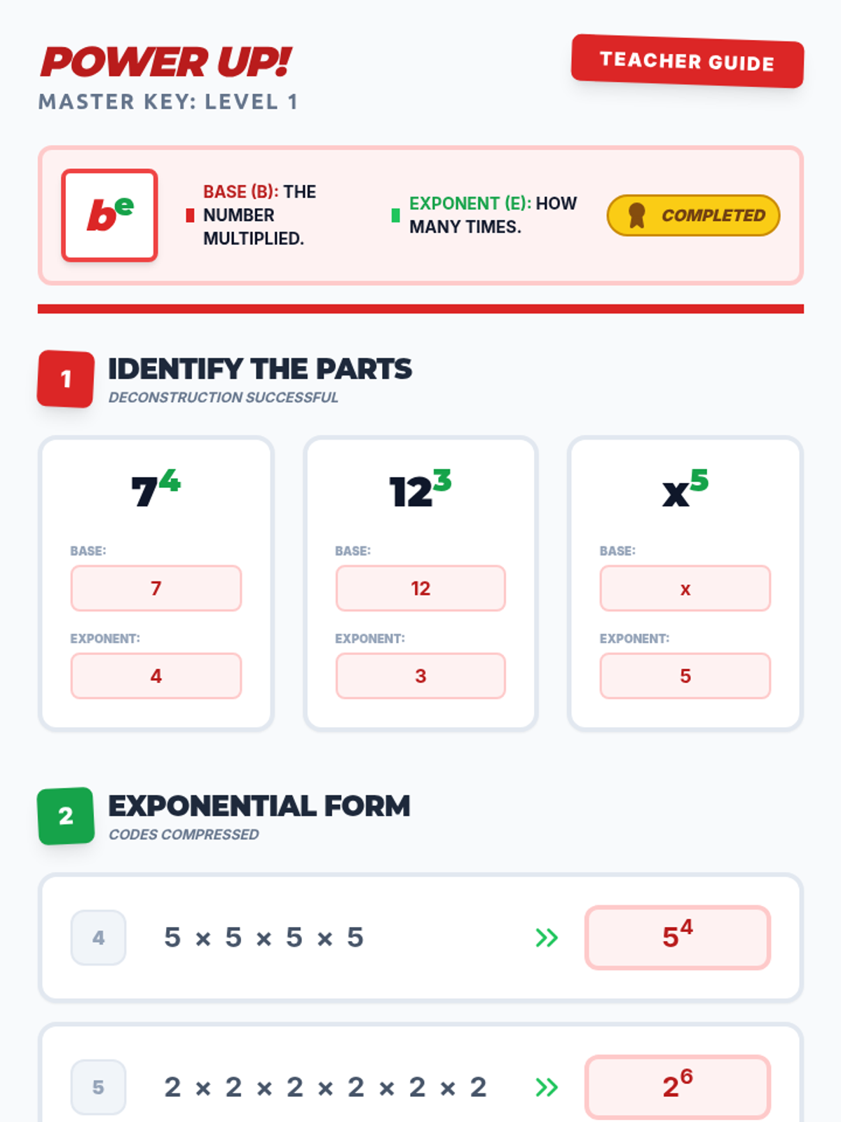 An introductory lesson on exponents where students identify parts of an exponential expression, convert repeated multiplication to power form, and calculate basic values.