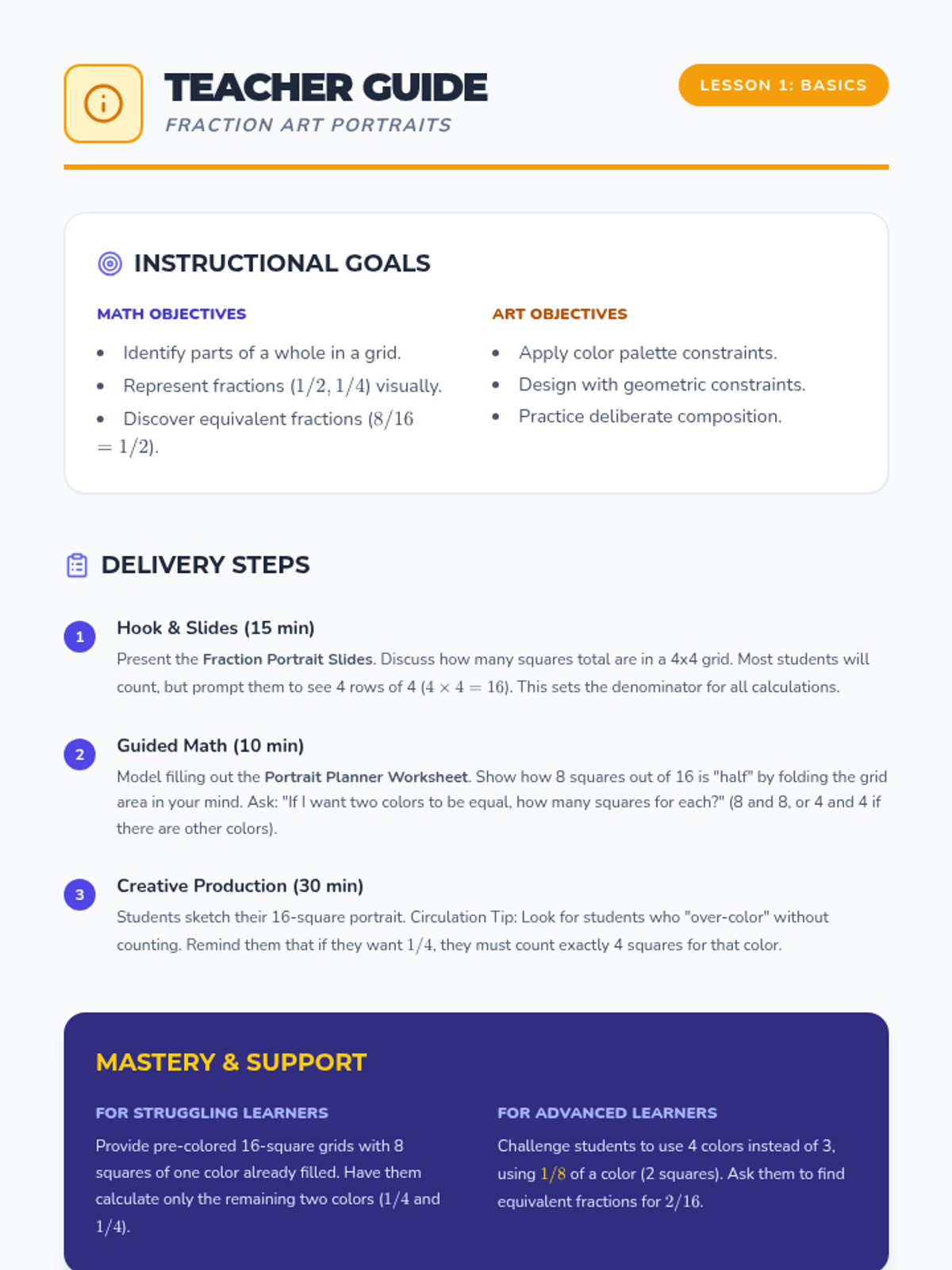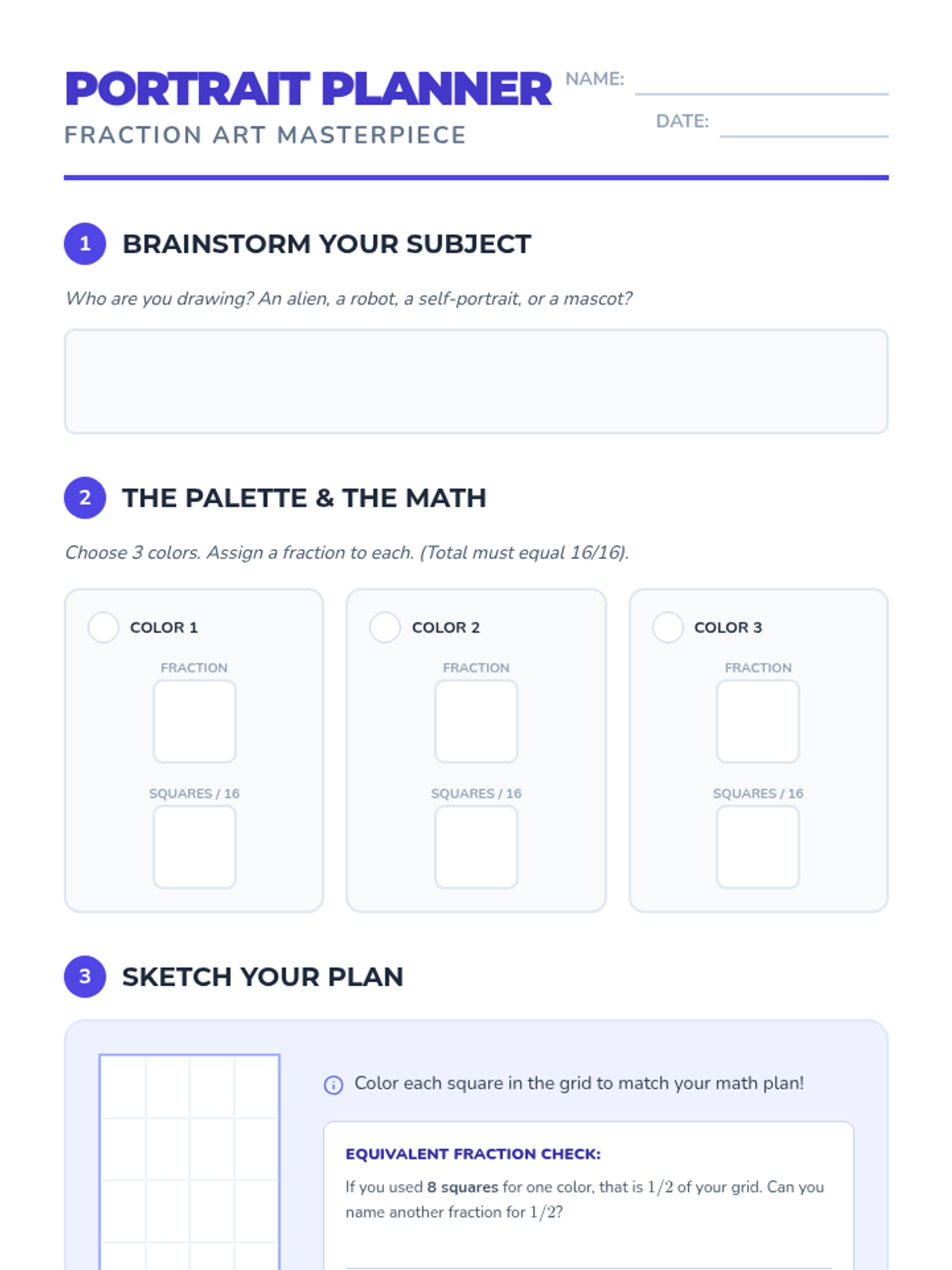 A creative math-art integration where students design grid-based portraits to explore parts of a whole, specifically focusing on halves, fourths, and equivalent fractions.