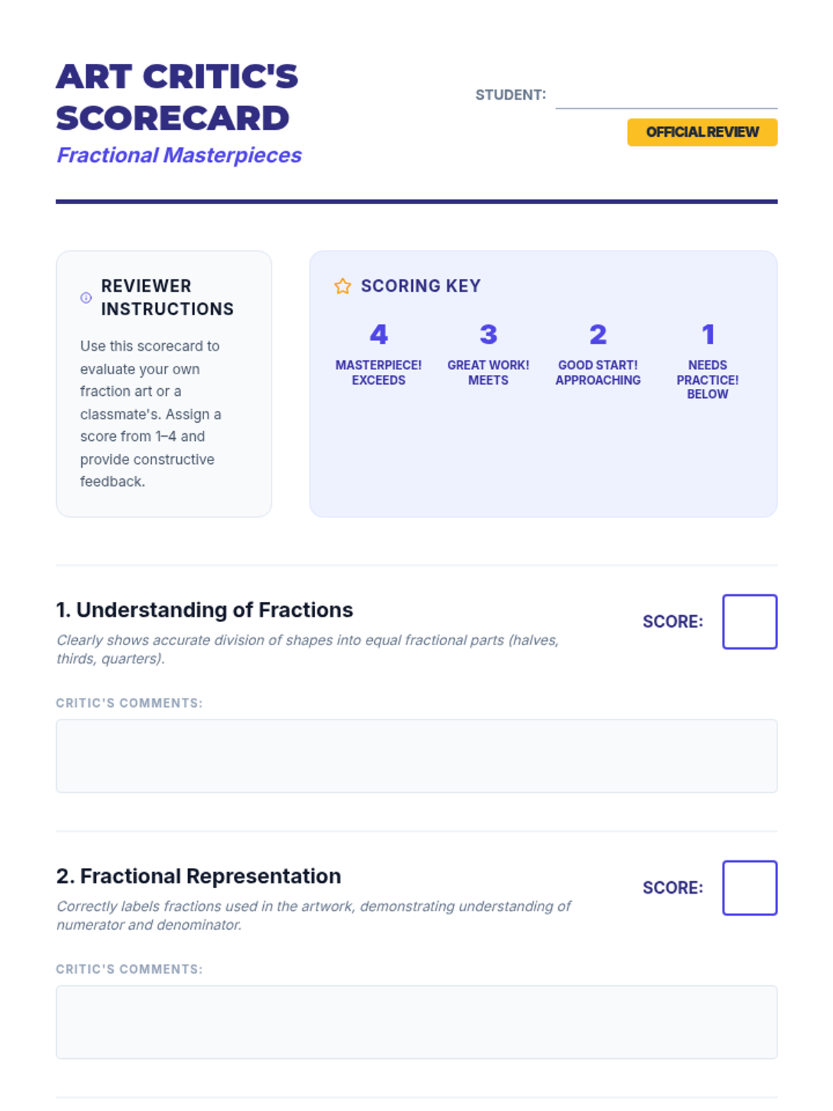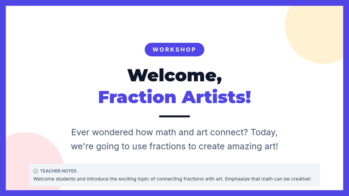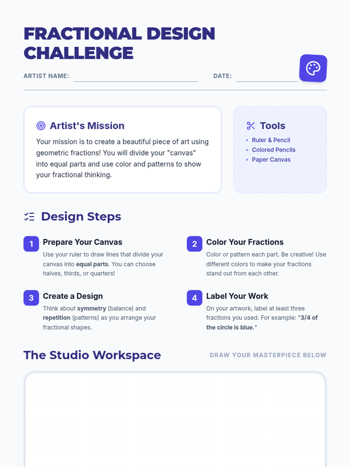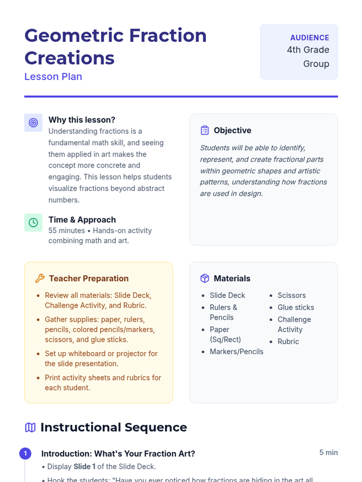 A creative, small-group lesson for 4th graders that integrates art and mathematics. Students will explore fractions by creating geometric designs and tessellations, making abstract concepts tangible through visual patterns.