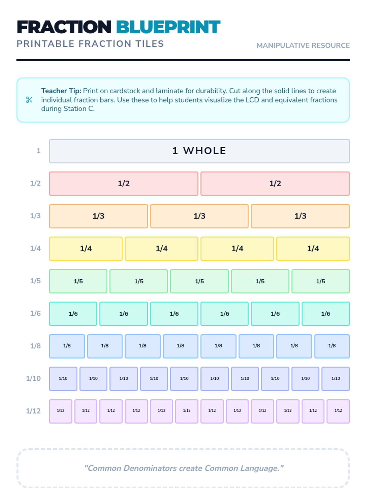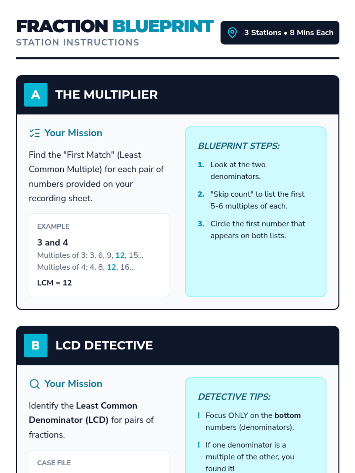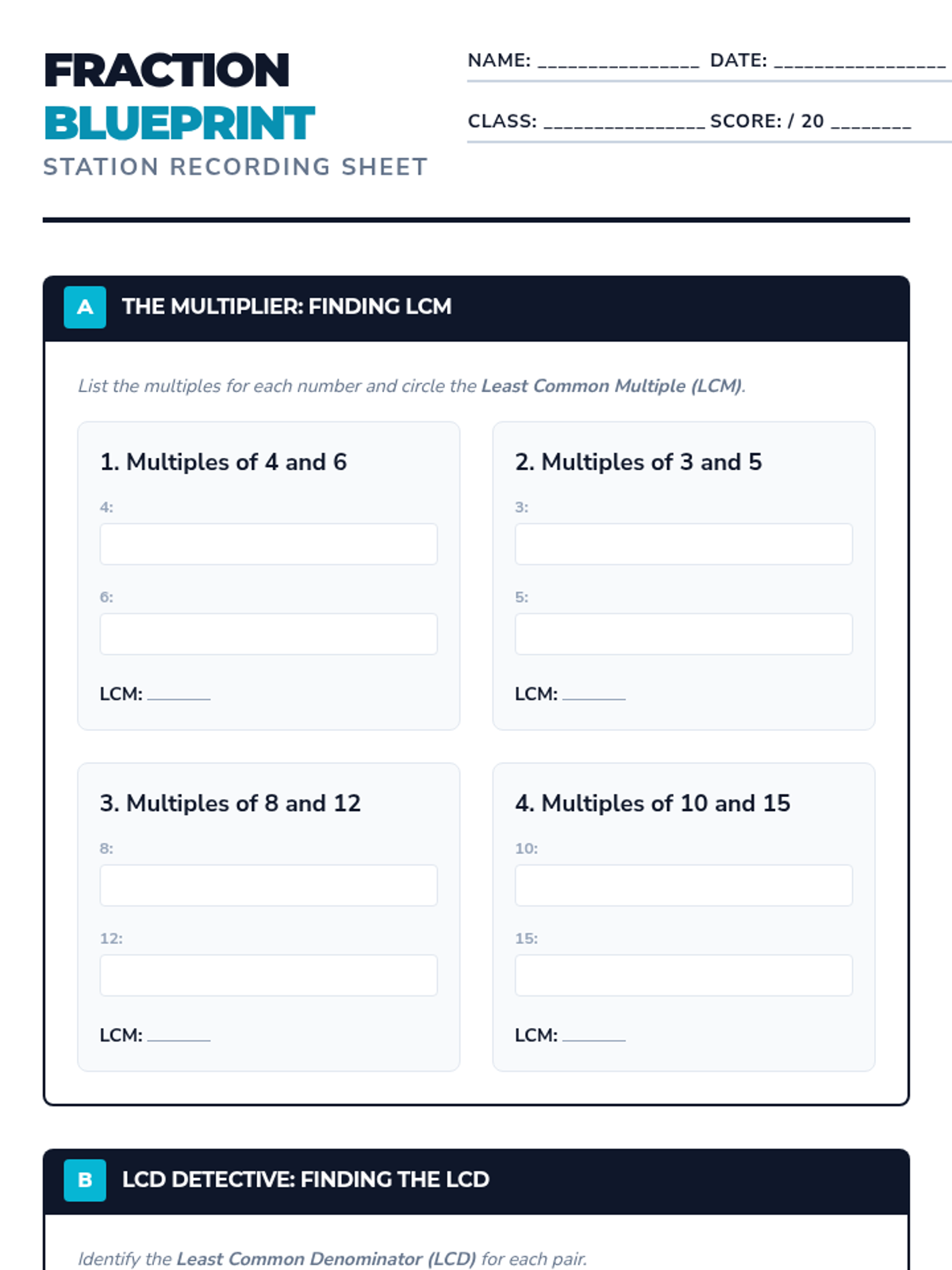 A comprehensive lesson focused on determining the Least Common Denominator (LCD) through finding the Least Common Multiple (LCM), preparing students for adding and subtracting fractions with unlike denominators.