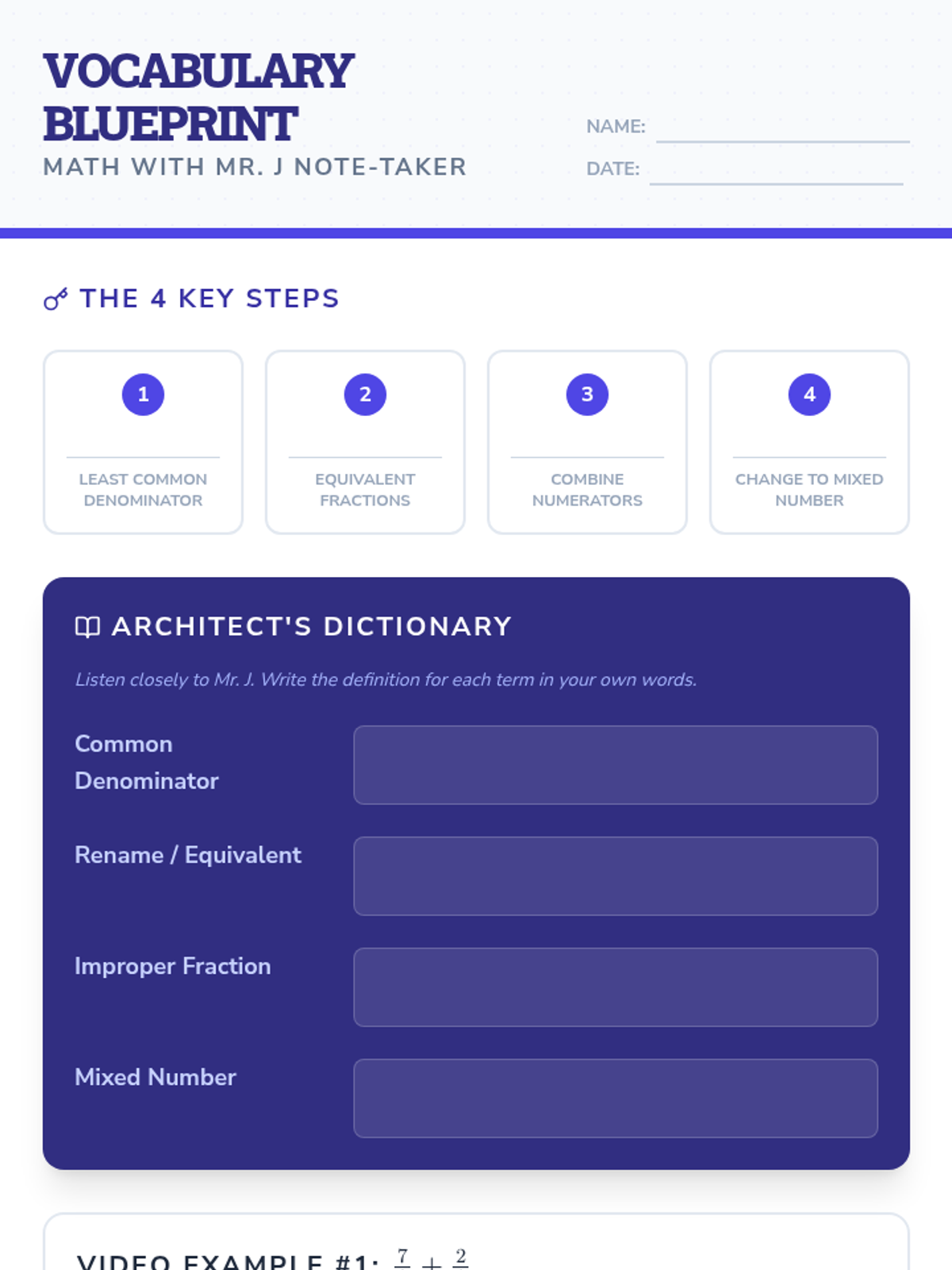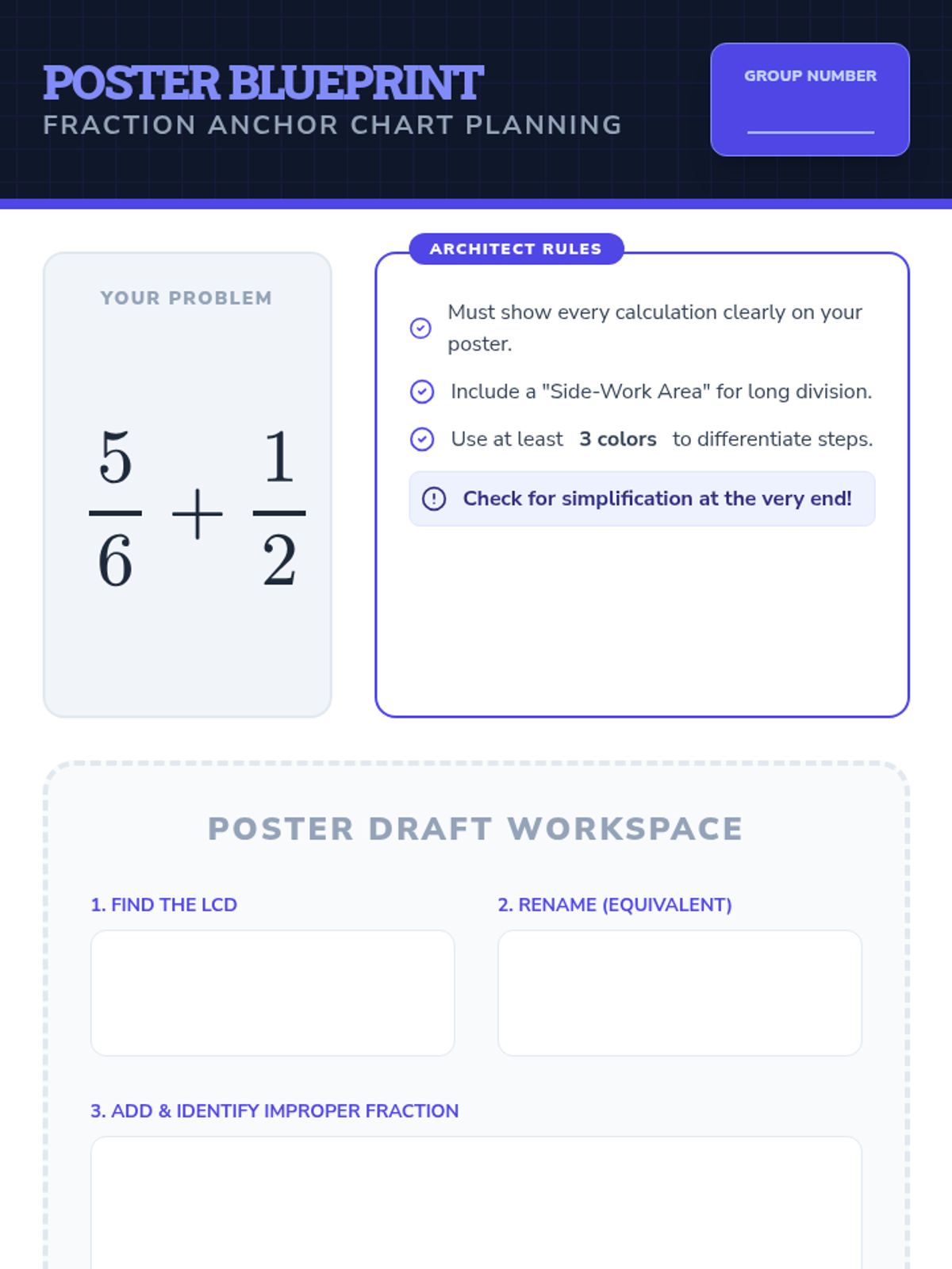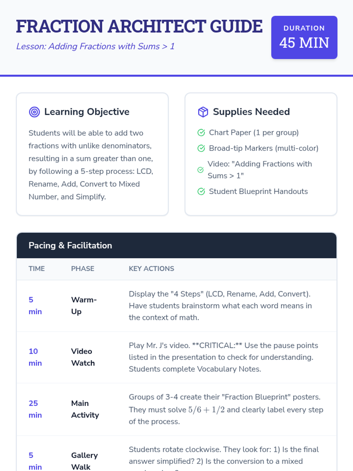 A comprehensive lesson on adding fractions with sums greater than one, featuring video-guided vocabulary notes, a collaborative anchor chart project, and a concluding gallery walk. Students master finding common denominators, renaming fractions, and converting improper fractions to mixed numbers.