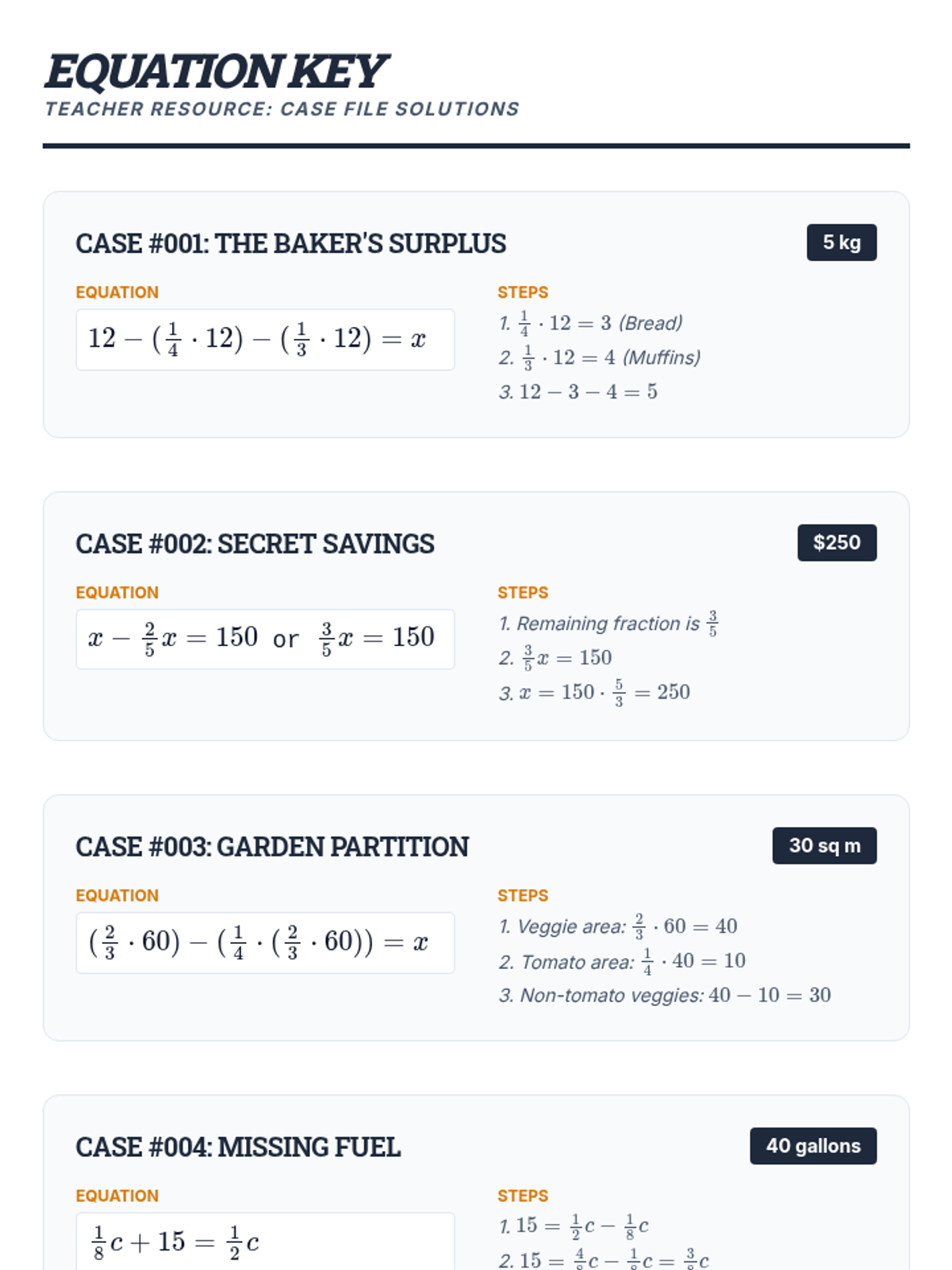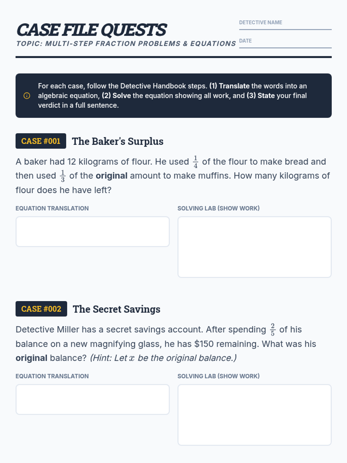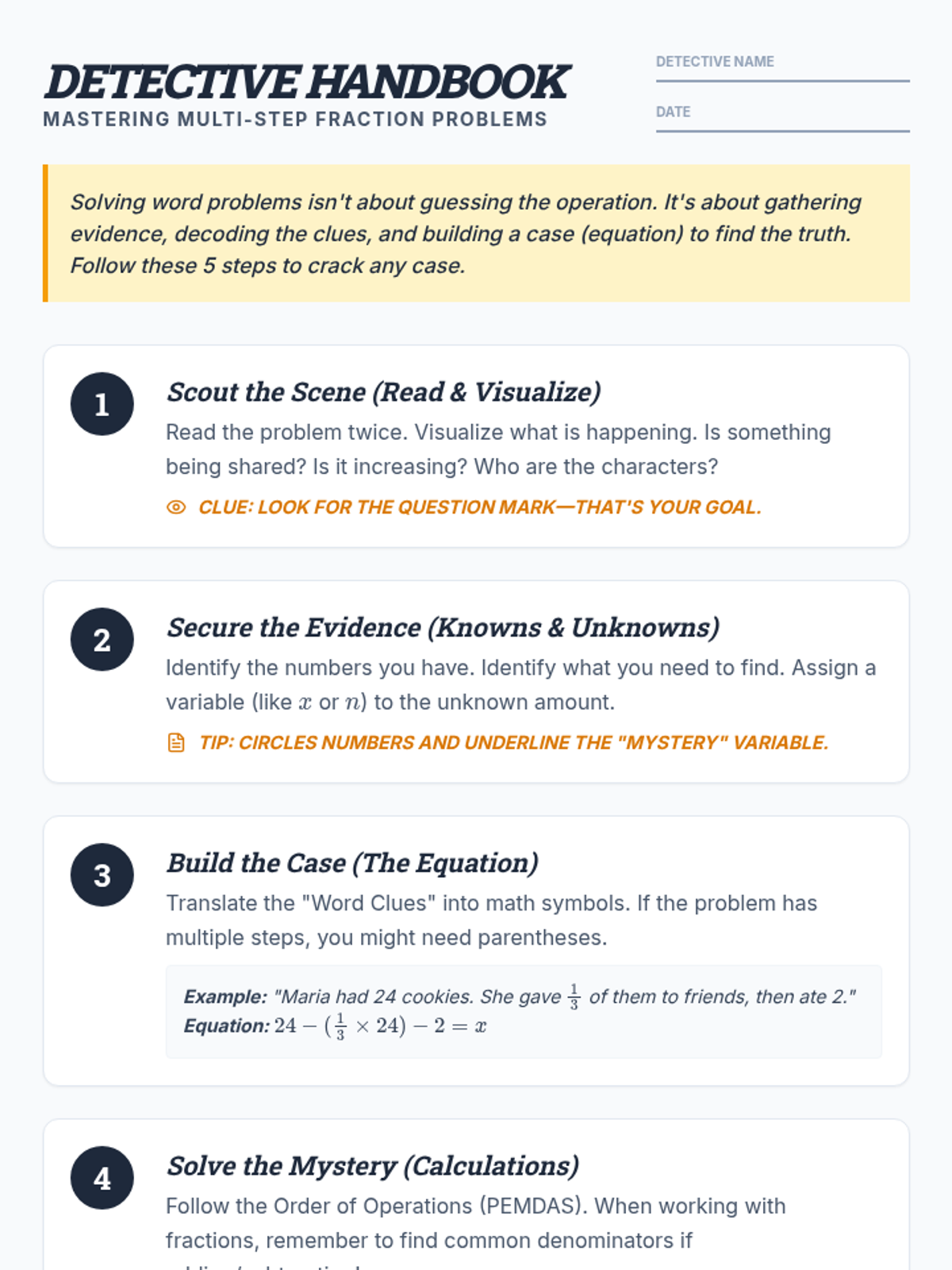 A comprehensive lesson on decoding multi-step word problems involving fractions and algebraic translation using a detective-themed approach.