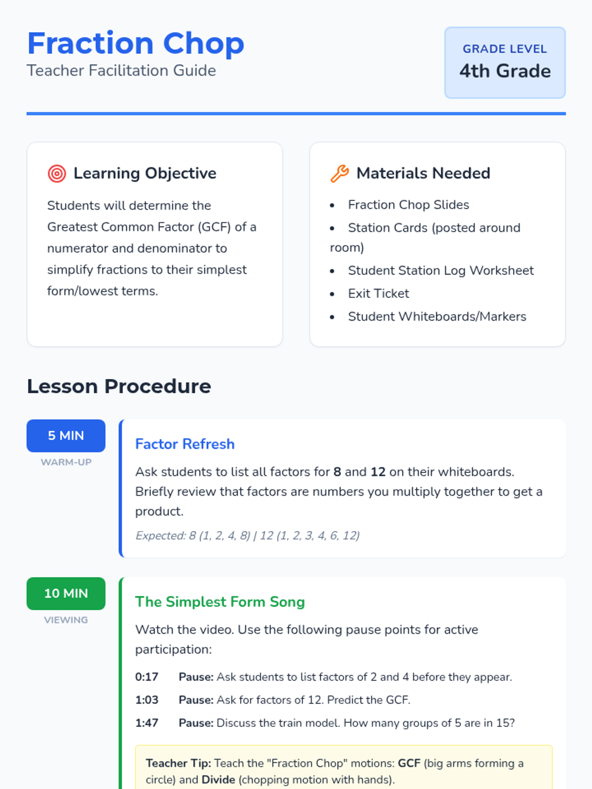 A 4th-grade math lesson focusing on using the Greatest Common Factor (GCF) to simplify fractions to their simplest form, inspired by the Numberock 'Simplest Form' song.