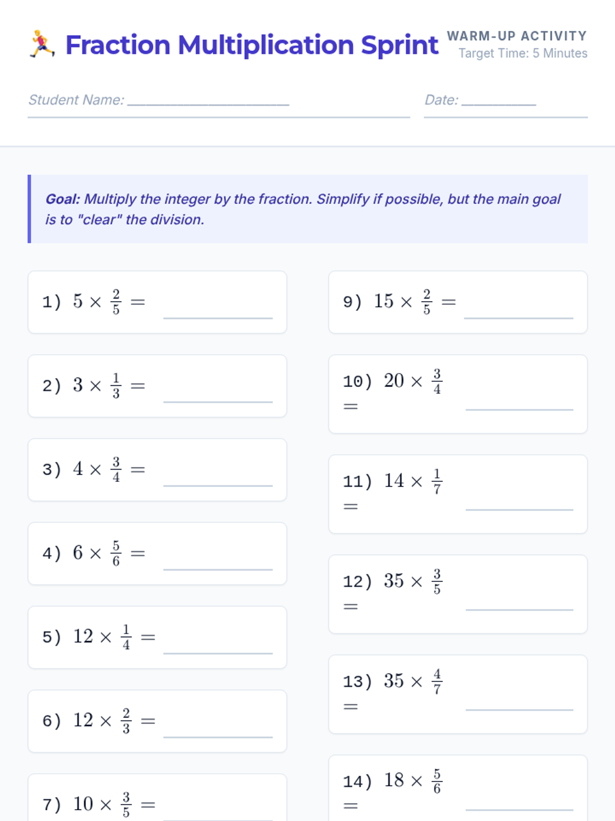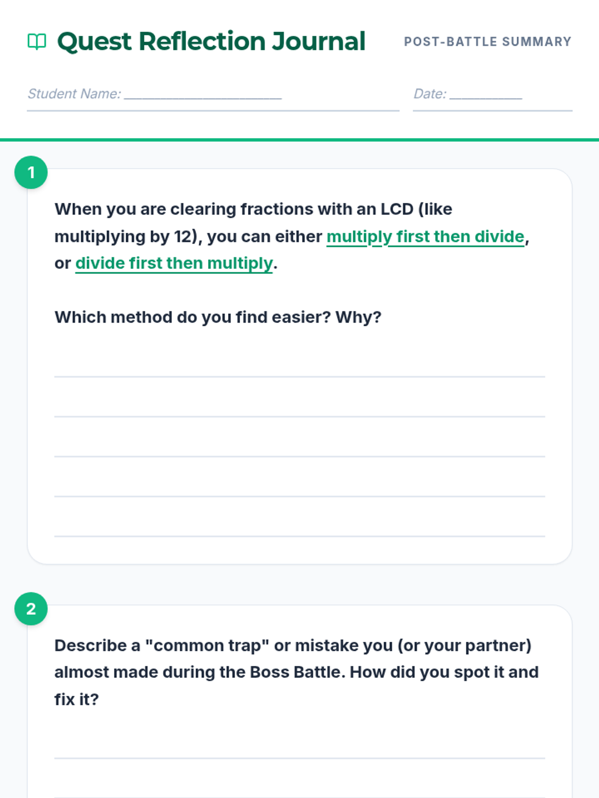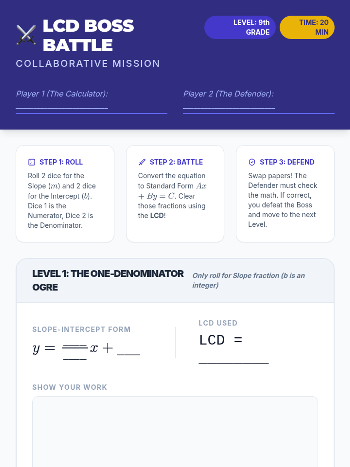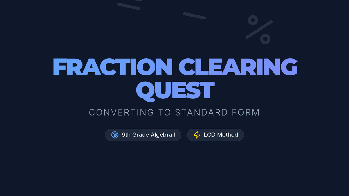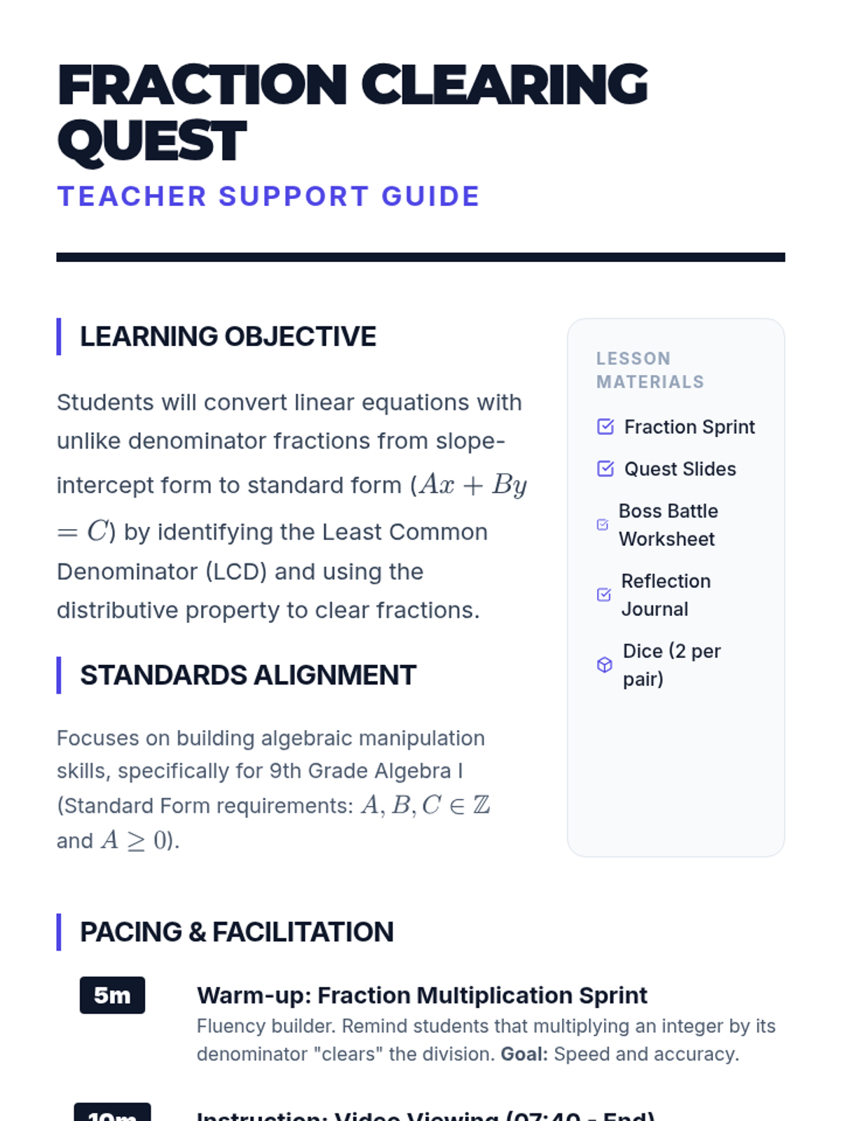 A high-energy Algebra I lesson focused on clearing fractions using the Least Common Denominator (LCD) to convert equations from slope-intercept form to standard form. Includes a fraction sprint, a video-based tutorial, and a 'Boss Battle' collaborative activity.