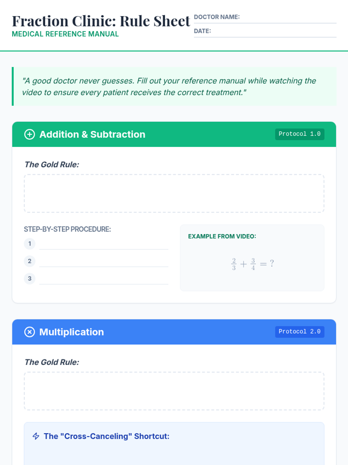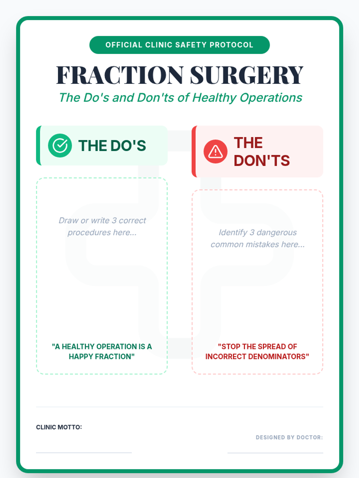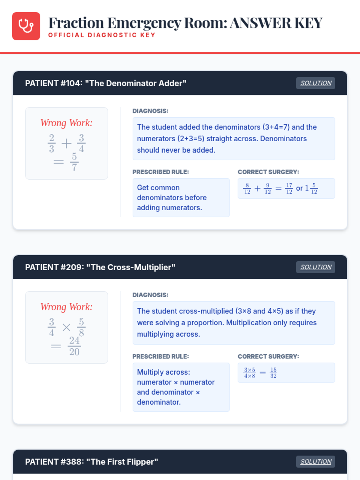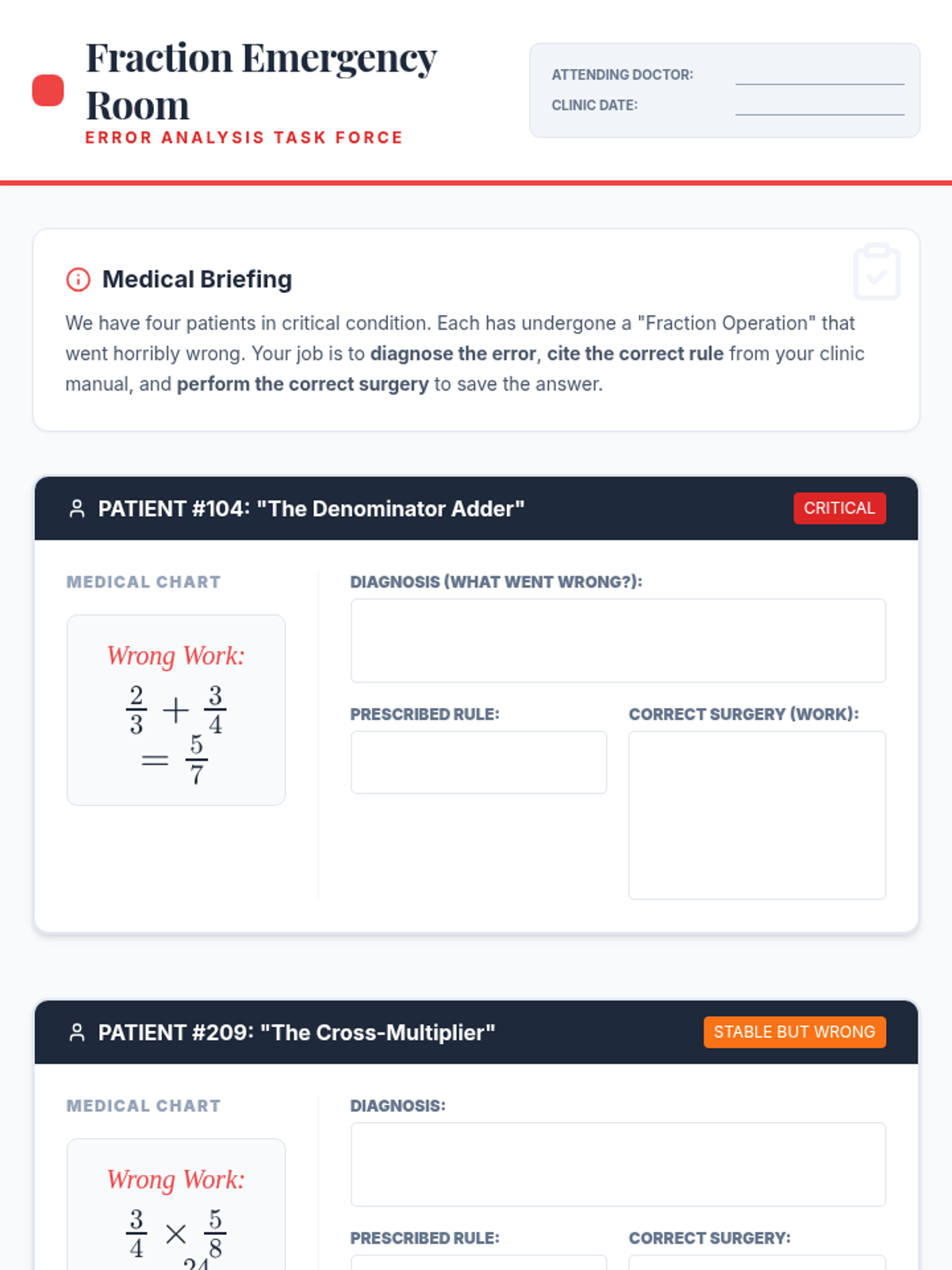 A remedial/review lesson for 7th graders focused on diagnosing and correcting common errors in fraction operations. Students use a medical-themed 'Fraction Clinic' approach to master addition, subtraction, multiplication, and division of mixed numbers and improper fractions.