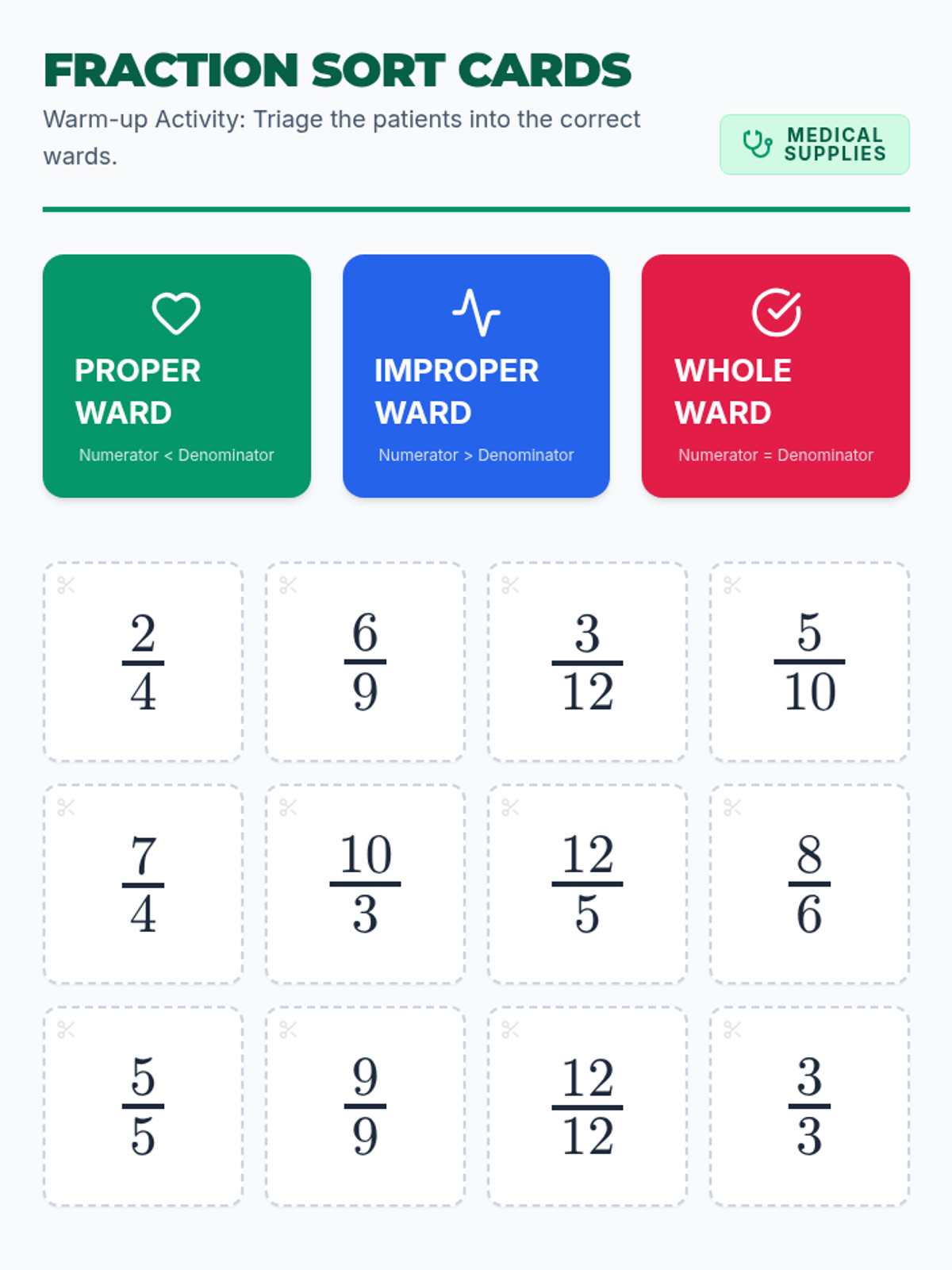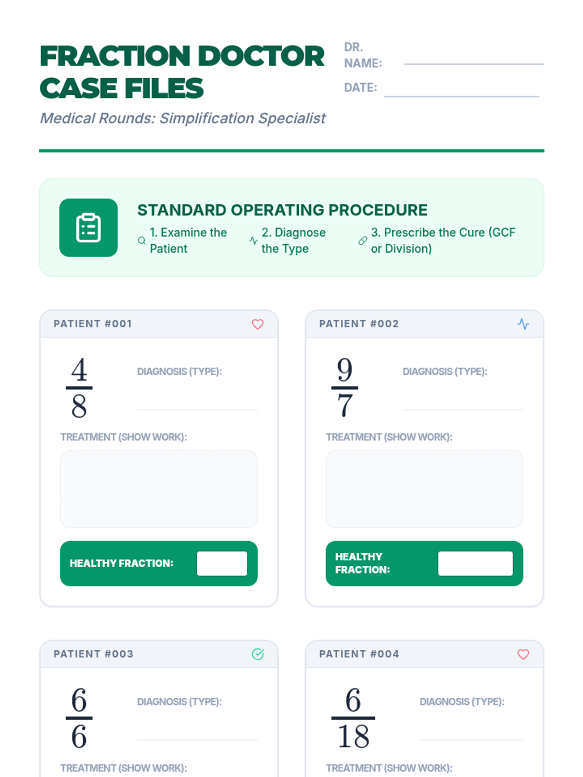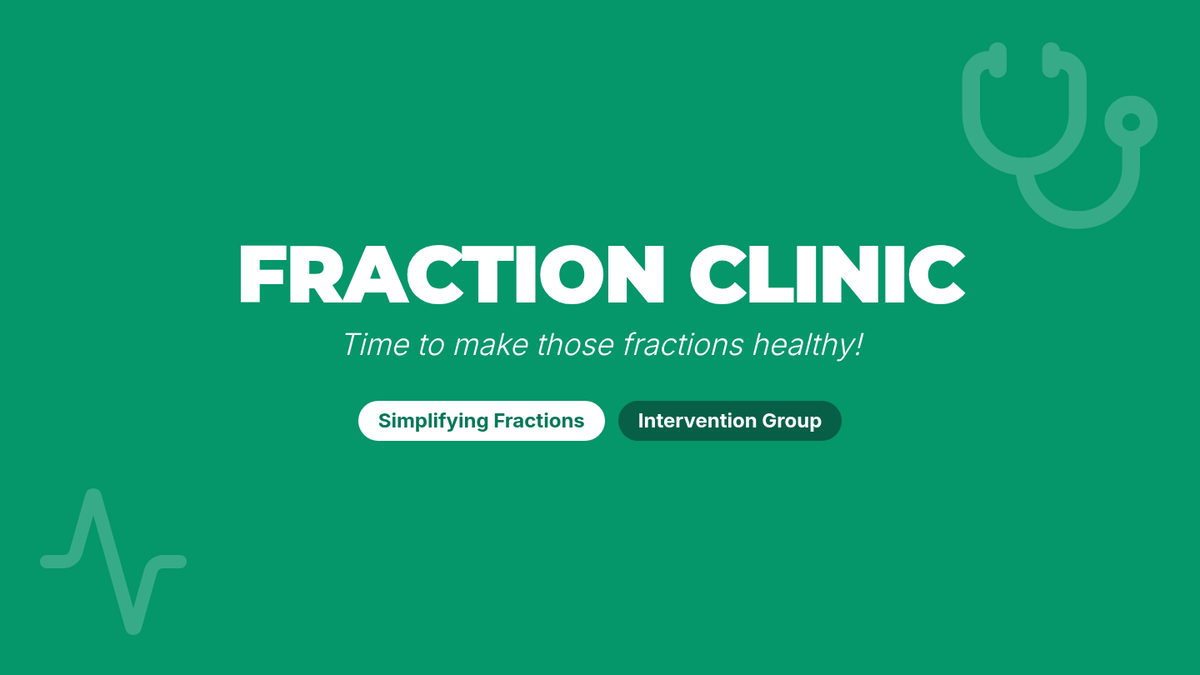 A remedial intervention lesson focused on simplifying proper fractions, improper fractions, and fractions equal to 1 using a 'Fraction Doctor' hospital theme.