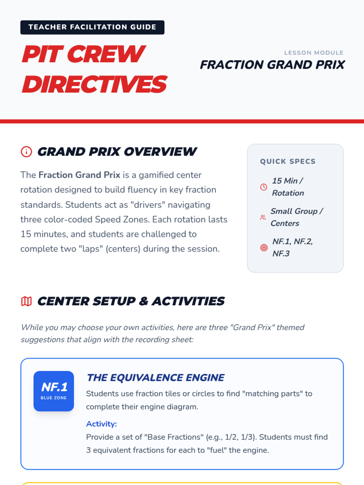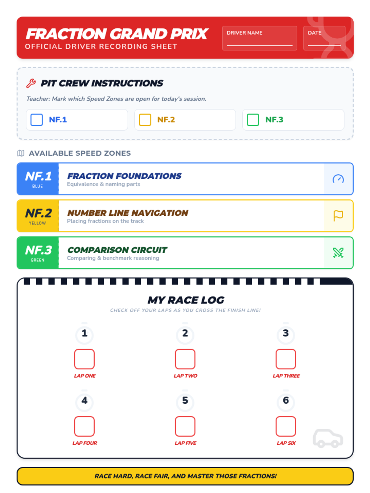 A high-energy math center rotation based on fraction standards NF.1, NF.2, and NF.3, themed around a car racing championship. Students navigate through color-coded 'Speed Zones' to practice equivalence, number lines, and comparison.