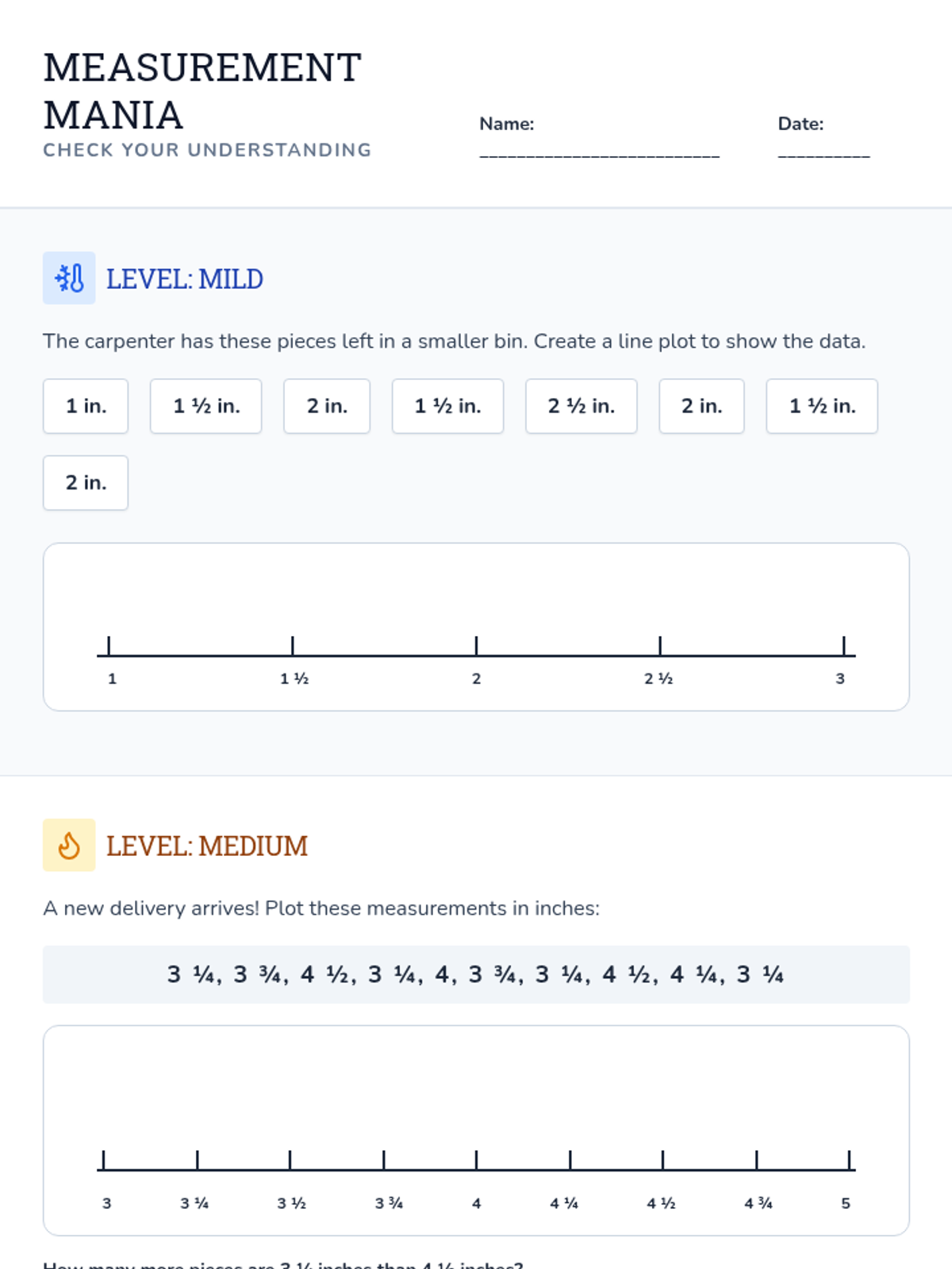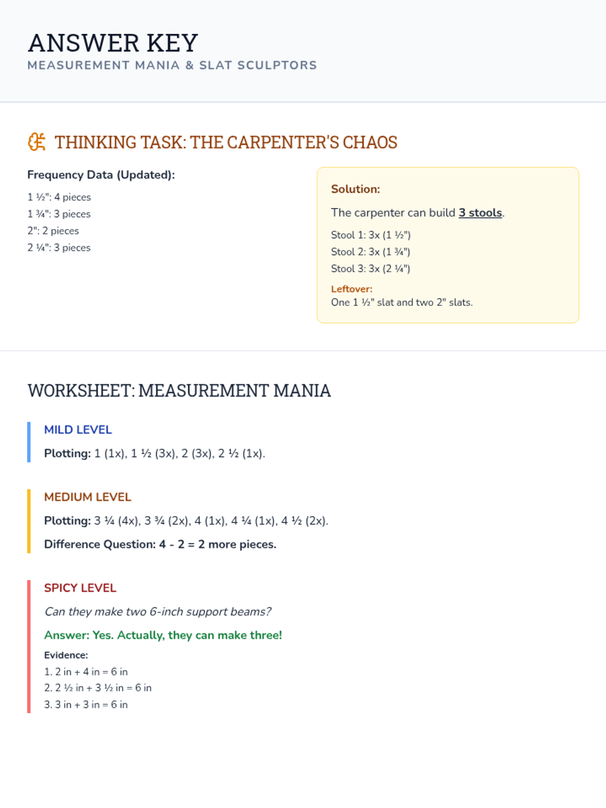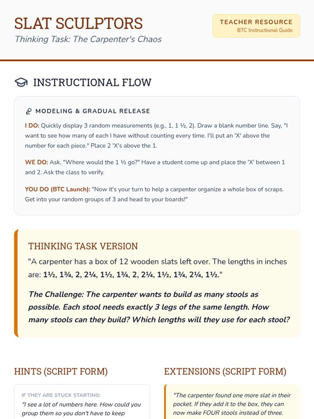 A 4th-grade math lesson centered on building line plots with mixed numbers (halves and fourths) using the Building Thinking Classrooms (BTC) framework. Students collaborate to organize 'carpenter's scraps' and solve a non-routine construction puzzle.