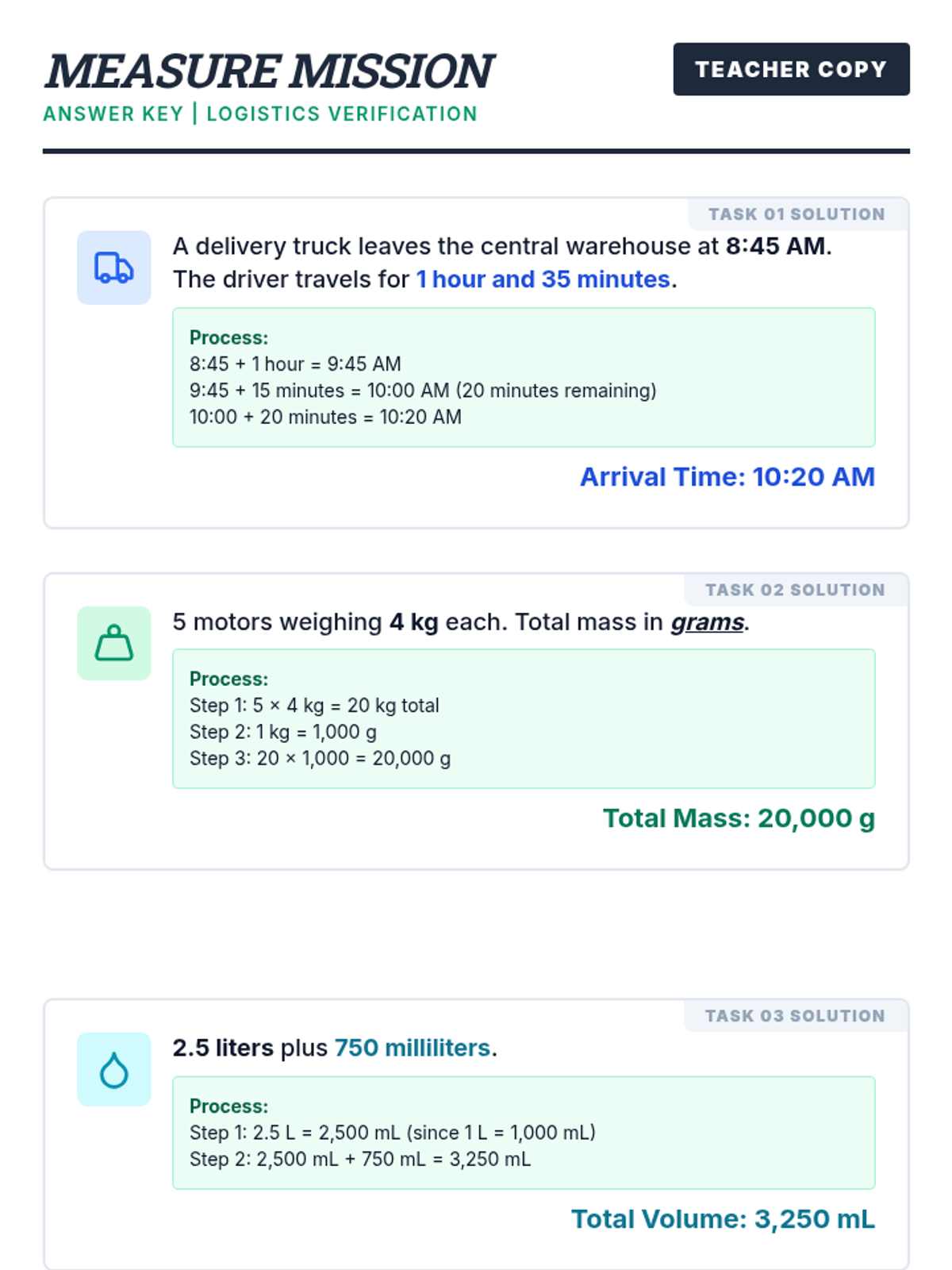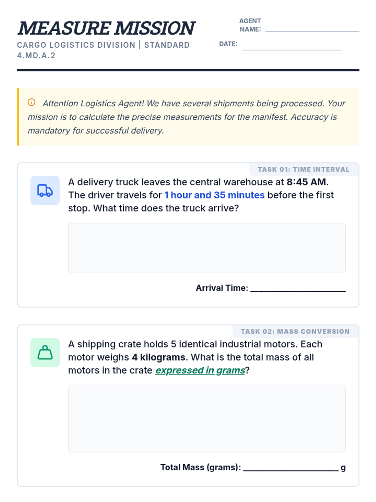 A focused 15-minute measurement practice focusing on real-world word problems involving time, mass, volume, and distance. Students apply the four operations to solve logistics-themed measurement challenges.