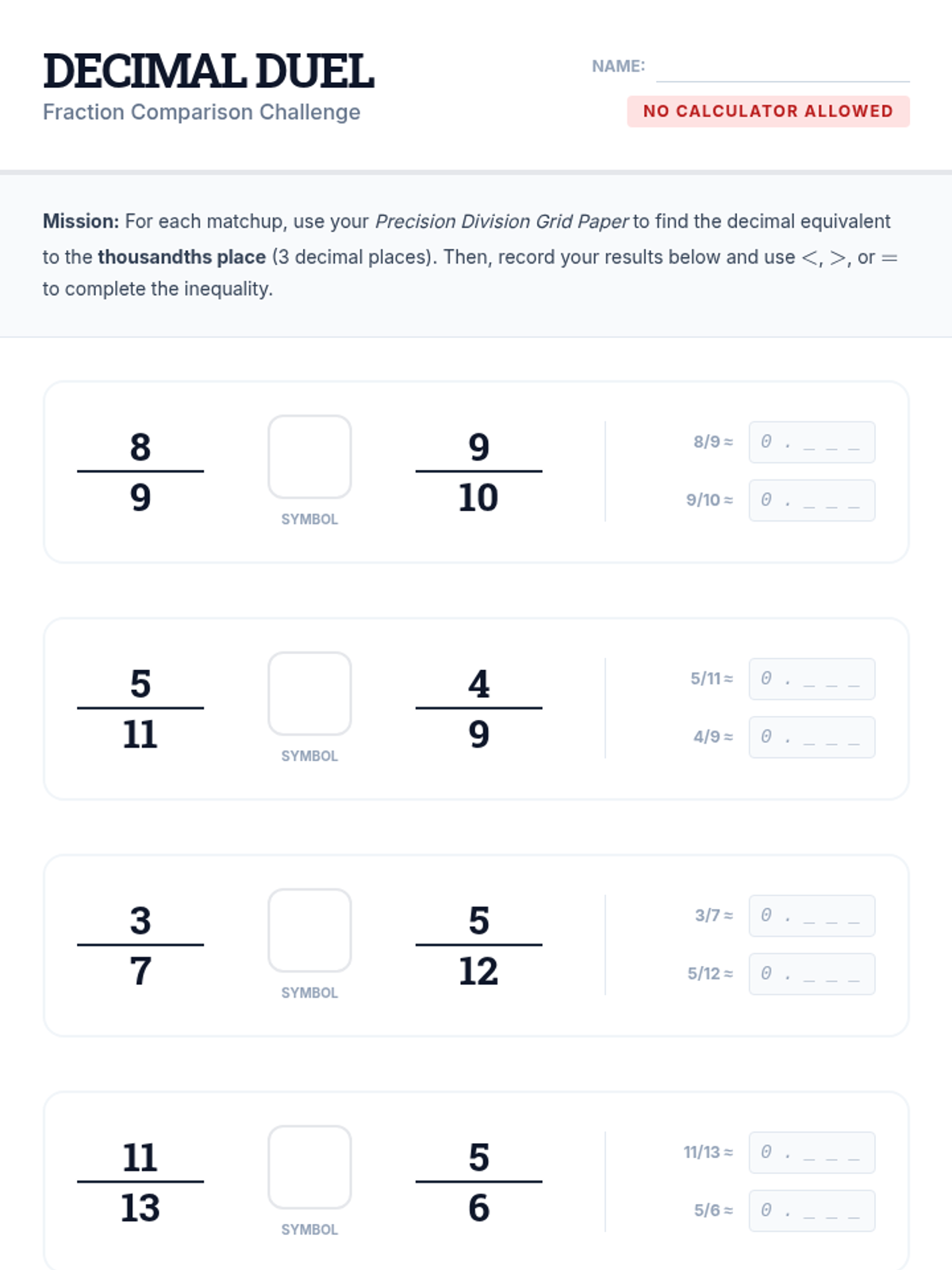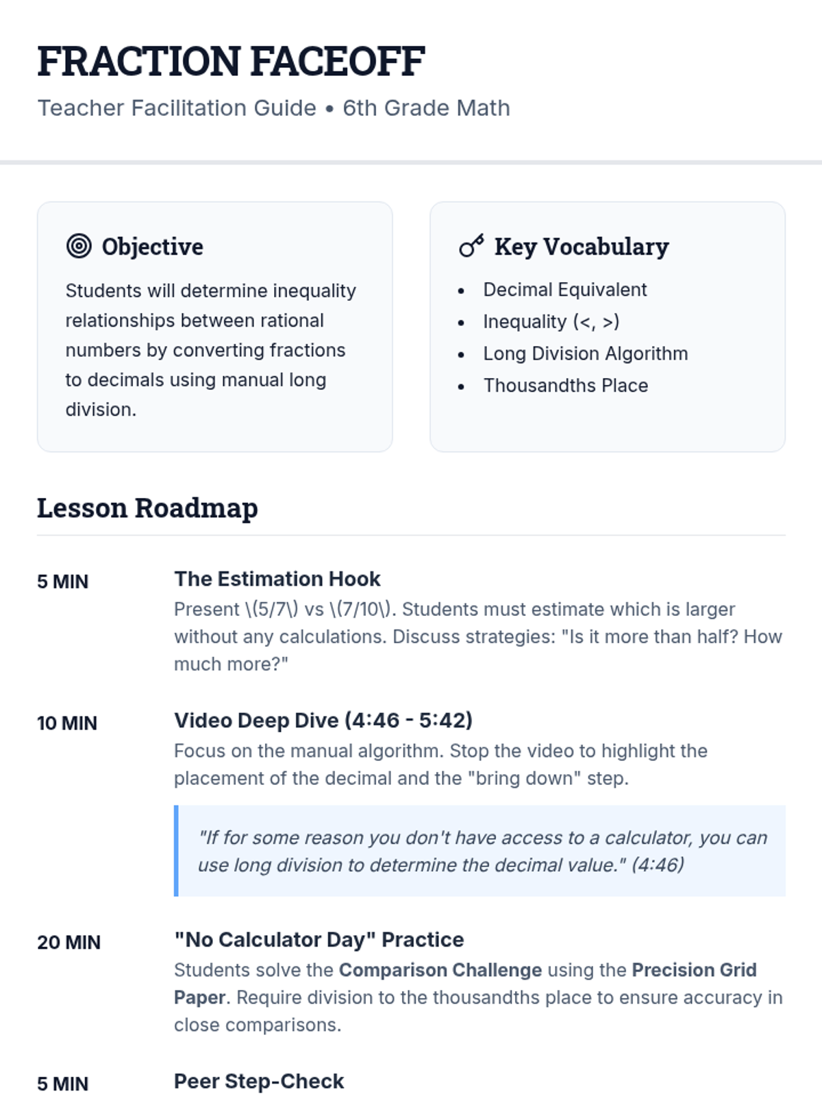Students will learn to compare rational numbers by converting fractions to decimals using the long division algorithm to the thousandths place. The lesson includes a video deep dive, estimation practice, and a no-calculator division challenge.