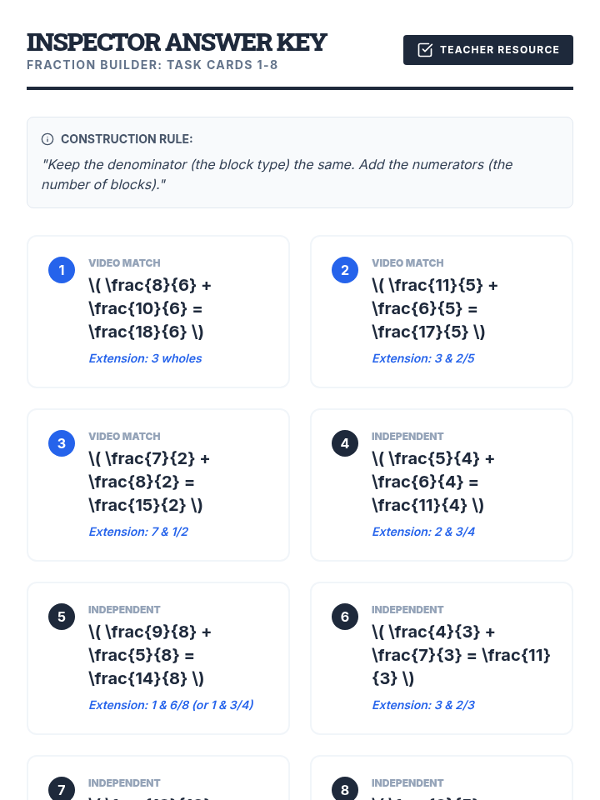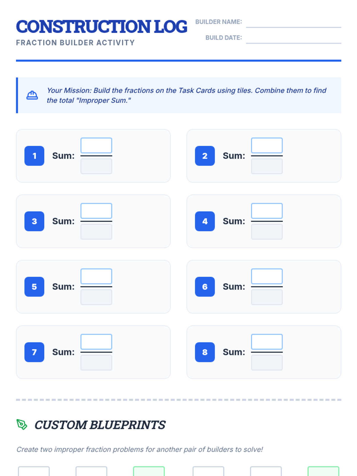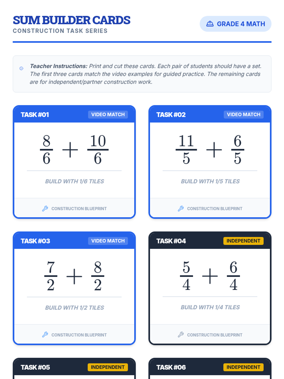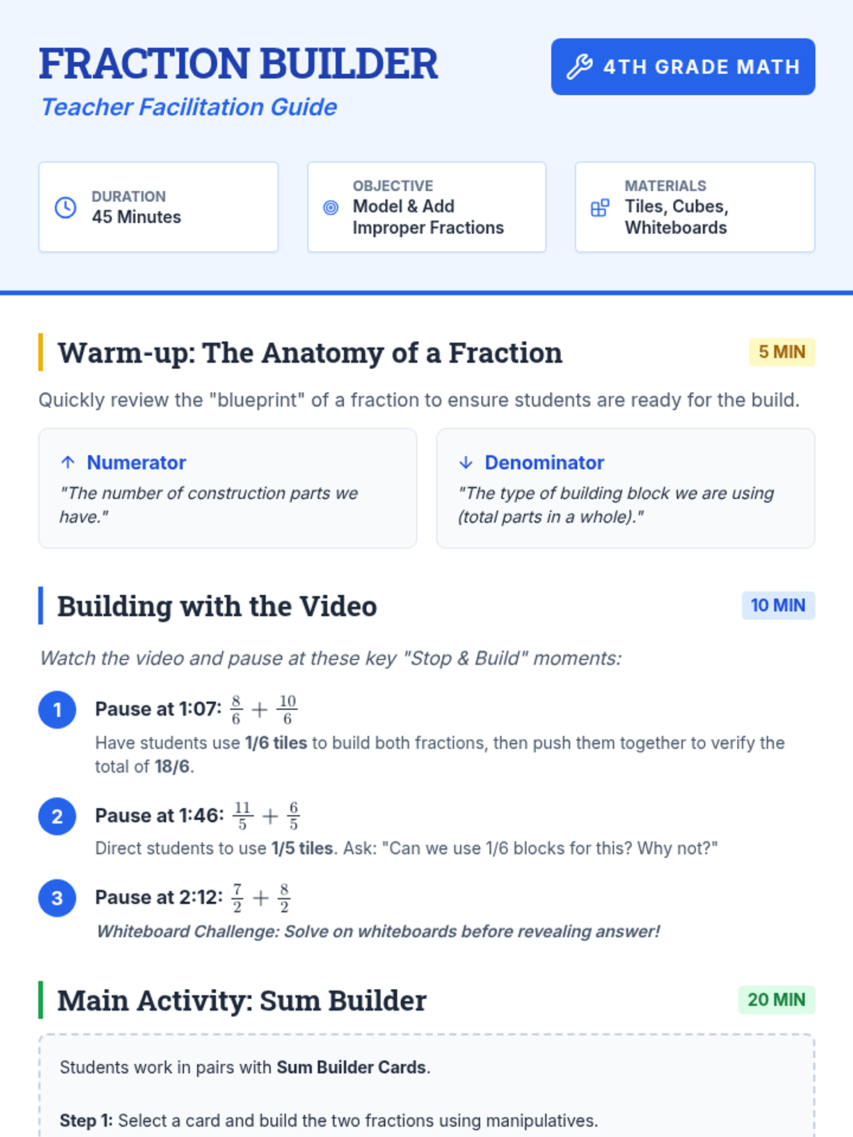 A hands-on 4th-grade math lesson that uses physical manipulatives (fraction tiles or cubes) to model and solve addition problems involving improper fractions with like denominators. Students follow along with a video tutorial to build concrete representations of abstract math procedures.
