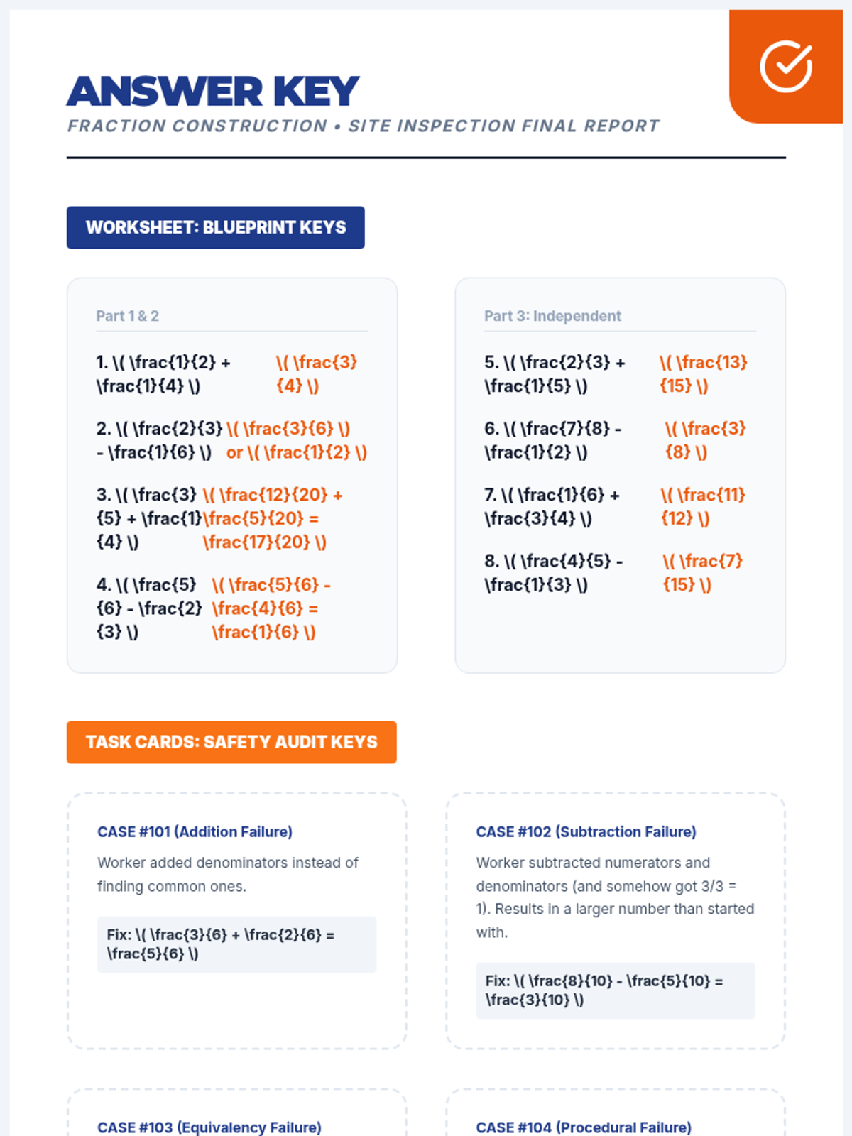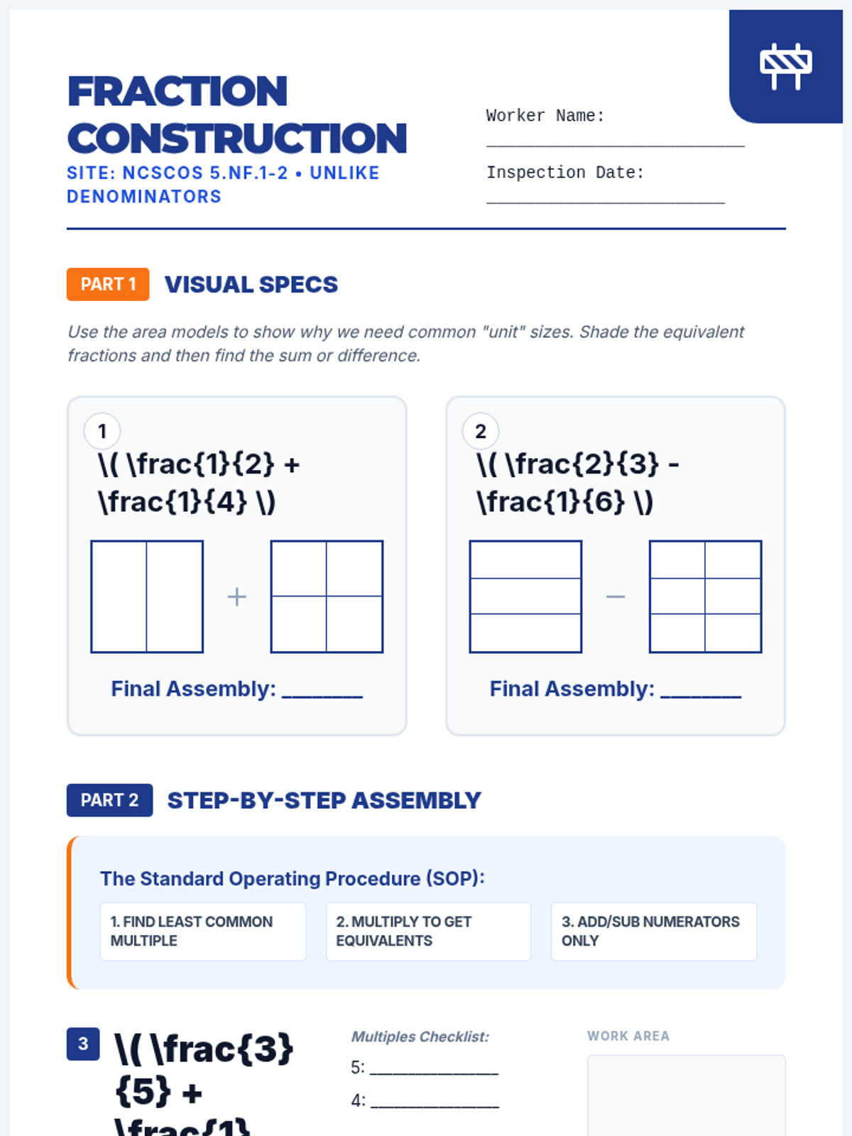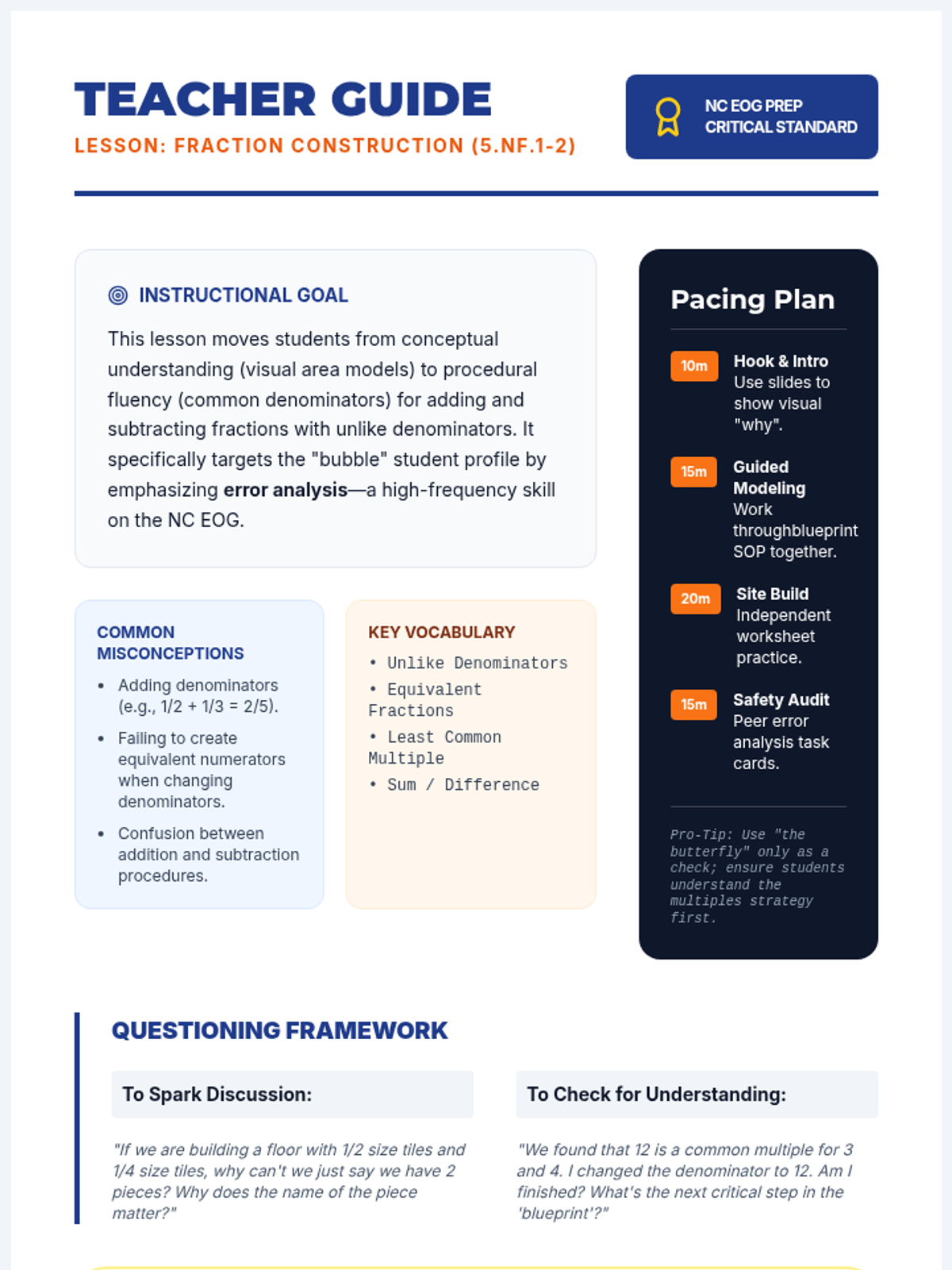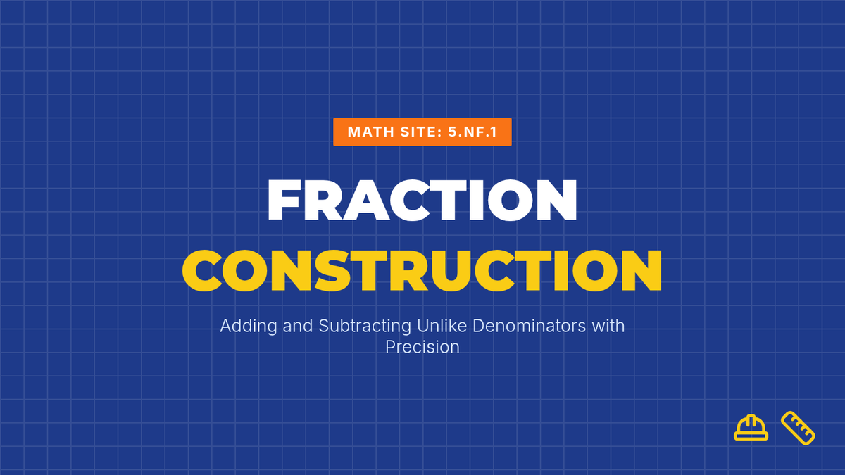 A Grade 5 math lesson focused on adding and subtracting fractions with unlike denominators, using construction-themed visual models and procedural strategies. Aligned to NCSCOS 5.NF.1-2, this lesson prepares students for high-stakes testing through conceptual understanding and error analysis.